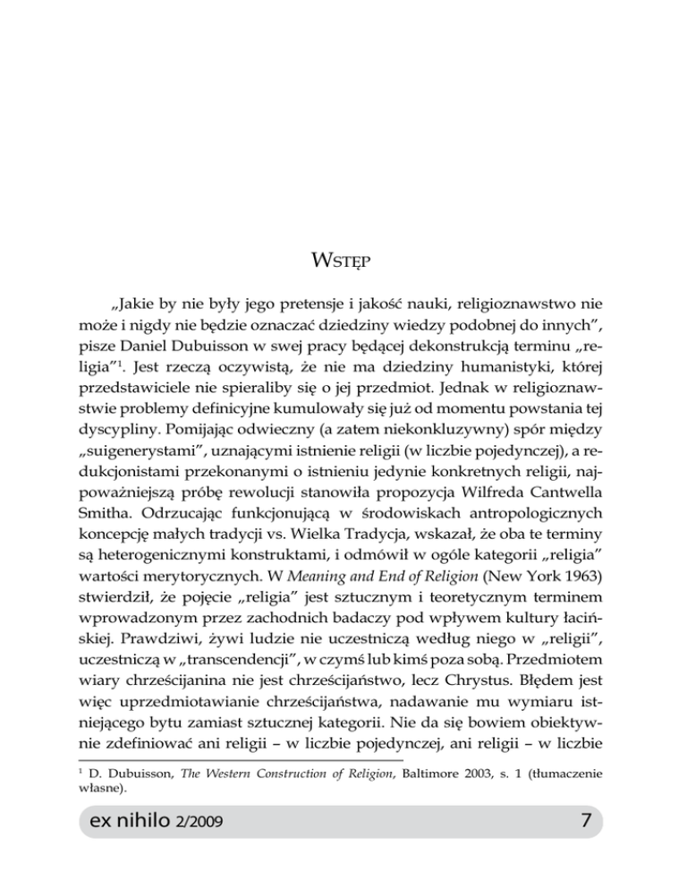 Wstęp „Jakie by nie były jego pretensje i jakość nauki, religioznawstwo nie może i nigdy nie będzie oznaczać dziedziny wiedzy podobnej do innych”, pisze Daniel Dubuisson w swej pracy będącej dekonstrukcją terminu „religia”1. Jest rzeczą oczywistą, że nie ma dziedziny humanistyki, której przedstawiciele nie spieraliby się o jej przedmiot. Jednak w religioznawstwie problemy definicyjne kumulowały się już od momentu powstania tej dyscypliny. Pomijając odwieczny (a zatem niekonkluzywny) spór między „suigenerystami”, uznającymi istnienie religii (w liczbie pojedynczej), a redukcjonistami przekonanymi o istnieniu jedynie konkretnych religii, najpoważniejszą próbę rewolucji stanowiła propozycja Wilfreda Cantwella Smitha. Odrzucając funkcjonującą w środowiskach antropologicznych koncepcję małych tradycji vs. Wielka Tradycja, wskazał, że oba te terminy są heterogenicznymi konstruktami, i odmówił w ogóle kategorii „religia” wartości merytorycznych. W Meaning and End of Religion (New York 1963) stwierdził, że pojęcie „religia” jest sztucznym i teoretycznym terminem wprowadzonym przez zachodnich badaczy pod wpływem kultury łacińskiej. Prawdziwi, żywi ludzie nie uczestniczą według niego w „religii”, uczestniczą w „transcendencji”, w czymś lub kimś poza sobą. Przedmiotem wiary chrześcijanina nie jest chrześcijaństwo, lecz Chrystus. Błędem jest więc uprzedmiotawianie chrześcijaństwa, nadawanie mu wymiaru istniejącego bytu zamiast sztucznej kategorii. Nie da się bowiem obiektywnie zdefiniować ani religii – w liczbie pojedynczej, ani religii – w liczbie 1 D. Dubuisson, The Western Construction of Religion, Baltimore 2003, s. 1 (tłumaczenie własne). ex nihilo 2/2009 7 Andrzej Szyjewski mnogiej. Istnieje zatem zastana tradycja, na podstawie której formowana jest indywidualna wiara. Religioznawcy winni zajmować się żywymi cechami i wartościami wiary, nie zaś abstrakcyjnymi konstruktami. Pomijam tu cel dywagacji Smitha, pragnącego zbudować religioznawstwo jako ekumeniczną teologię2; istotne jest, że jego tezy wywołały ferment, którego pośrednim skutkiem są takie teorie religii, jak ta sformułowana przez Danièle Hervieu-Léger. Jednak gdyby francuska socjolożka czytała uważniej klasyków religioznawstwa, nie przypisywałaby tak wielu odmiennych cech religijności nowoczesnej. Problem w tym, że religie należałoby wówczas traktować nieco szerzej niż jako odniesienie do transcendencji. Większość autorów prezentujących swoje teksty w niniejszym tomie musi się ciągle zmagać z niedookreślonymi ramami, które miałyby odgraniczać zjawiska religijne od niereligijnych. Spośród wielu stosowanych tu strategii warto wskazać na tendencję do stałego poszerzania zakresu tego, co religijne. Zazwyczaj można w tej sytuacji posłużyć się wybiegiem adaptowania wypowiedzi wychodzących z wnętrza określonych tradycji. Wówczas w miejsce religii pojawiają się określenia typu duchowość, system samodoskonalenia czy ruch społeczny. Oczywiście trzeba rozróżnić perspektywę emiczną (emic), w której bada się to zjawisko, które jest uświadamiane i wyodrębniane przez jego uczestników, oraz perspektywę etyczną (etic), w której bada się to, co narzuca sam badacz jako próbę typologizacji czy klasyfikacji. Ponieważ ciężko, nawet w sytuacji ponowoczesnej, badać religie jak ksiądz Chmielowski konie, nie uważam za heurystycznie zasadne zostawianie problemu do oceny samym zaangażowanym, którzy zazwyczaj uporczywie uznają za religię jedynie zinstytucjonalizowane formy współczesnych monoteizmów. W tej sytuacji powtarzane zazwyczaj słowa: „Nie jesteśmy religią”, należy rozumieć jako asekurację przed oskarżeniami o „bycie destrukcyjną sektą zagrażającą Kościołowi”. Stosowanie odmiennych strategii, polegających na rozmyciu zakresu zjawiska, wiąże się z przyjęciem kategorii bardziej ogólnej – wówczas zorganizowane, tradycyjne religie byłyby tylko częścią zjawisk, wiązanych 2 Jak pisze Sheldon Isenberg, „Smith dzielił z Eliadem potężną, niemal gnostycką wizję religii”. S.R. Isenberg, Comparative Religion as an Ecumenical Process; Wilfred Cantwell Smith’s World Theology, „ Journal of Ecumenical Studies” 1987, t. 24 nr 4, s. 617. 8 ex nihilo 2/2009 Wstęp np. z pojęciem duchowości. Zjawiska te szczególnie silnie manifestują się w perspektywie współczesności, kiedy to religie tracą swój status wyłączności, spójności, publiczności, instytucjonalności itp. W tym kontekście interesujące jest zmierzenie się z tym, co dwoje spośród autorów zbioru nazywa „religiami rekonstruowanymi”, takimi jak druidyzm czy Ásatrú. W tych przypadkach bowiem brakującym elementem jest ciągłość, ponieważ tradycja została zapomniana na wszystkich szczeblach funkcjonowania kultury, a choćby zamieszczony tu tekst Darii Izdebskiej pokazuje, jakie trudności piętrzą się przed rekonstruktorami dawnych systemów religijnych. Wyznawcy muszą więc niejako „uwierzyć na nowo”, przy tym część z nich zachowuje identyfikację z dotychczas oficjalnie wyznawanym systemem wartości, inni zaś nie. Czy jednak nie przypomina to sytuacji wszelkich ruchów odnowy, tych wszystkich back to basics czy back to fundamentals, i nie stanowi elementu dynamiki właściwego każdemu procesowi religijnemu? Wszak, jak pisze redaktor francuskiej Encyklopedii Religii Świata: „tradycja to przede wszystkim nieustanne ścieranie się dwóch zasad, zachowania przekazu w stanie nienaruszonym i wzbogacania go o doświadczenia kolejnych pokoleń”3. W tej perspektywie rozważania kabalistów nad naturą człowieka, o jakich pisze Dominika Górnicz w kontekście mitu mesjańskiego, nie konstruują nowej jakości, lecz jedynie odczytują na nowo to, co tradycyjnie nienaruszalne. Być może na tym polega kolejny leitmotiv zbioru, jak można sąd