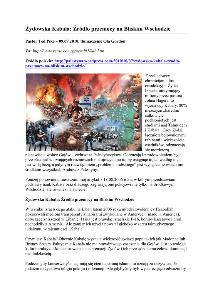 Żydowska Kabała: Źródło przemocy na Bliskim Wschodzie Pastor Ted Pike – 09.09.2010, tłumaczenie Ola Gordon Za: http://www.rense.com/general92/kab.htm Źródło polskie: http://palestyna.wordpress.com/2010/10/07/zydowska-kabala-zrodloprzemocy-na-bliskim-wschodzie/ Prześladowcy chrześcijan, ultraortodoksyjni Żydzi Izraela, otrzymujący miliony przez pastora Johna Hagera, to wyznawcy Kabały. 80% mężczyzn „haredim” całkowicie pochłoniętych jest studiami nad Talmudem i Kabałą. Tacy Żydzi, łącznie z bojowniczymi rabinami i większością osadników, odznaczają się morderczą nienawiścią wobec Gojów – zwłaszcza Palestyńczyków. Odrzucają i z zadowoleniem będą przeszkadzać w trwających rozmowach pokojowych po to, by osiągnąć to, co według nich jest wolą bożą, a jedynym rozwiązaniem „problemu arabskiego” jest wypędzenie wszelkimi środkami wszystkich Arabów z Palestyny. Poniżej ponownie umieszczam mój artykuł z 18.08.2006 roku, w którym przedstawiam podstawy nauk Kabały oraz dlaczego zagrażają one pokojowi nie tylko na Środkowym Wschodzie, ale również na świecie. Żydowska Kabała: Źródło przemocy na Bliskim Wschodzie W wyniku izraelskiego ataku na Liban latem 2006 roku młodzi zwolennicy Hezbollah pokazywali mediom transparenty z napisami „wykonane w Ameryce” (made in America), dotyczące zniszczeń w Libanie. I taka jest prawda: izraelskie F-16, bomby kasetowe i broń pochodziły z Ameryki. Ale zamiar ich użycia powstał głęboko w sercu talmudycznego judaizmu, w tajemniczej „Kabale”. Czym jest Kabała? Obecnie Kabałę wyznaje większość gwiazd popu takich jak Madonna lub Britney Spears. Faktycznie Kabała nie ma prawdziwego znaczenia dla Gojów. Jest to teologia kultu i praktyka skoncentrowana na supremacji Żydów i ich przesądzonemu celowi dominacji nad ludzkością. Podczas gdy konserwatyści zajmują się ciemną stroną islamu, to uznają za oczywiste, że judaizm to życzliwa religia pokoju i tolerancji. Ale gdybyśmy byli wystarczająco odważni by się mu przyjrzeć, to zobaczylibyśmy zupełnie inne realia. Głęboko w sercu świętych tekstów judaizmu leżą poprzekręcane i mrożące krew w żyłach wierzenia. W Starym Testamencie Bóg jest bytem rozsądnym i moralnym. Ma idealną wiedzę o dobru i złu, oraz osądza nas według naszych wolnych wyborów moralnych. Ale kiedy Nabuchodonozor przejął w niewolę Żydów w roku 587 p.n.e., oni znaleźli innego boga. Odkryli panteistycznego boga wschodu, „wspaniałą” światową potęgę nie z powodu jego miłości do dobra, ale z powodu jego szerzącej się potęgi. Starożytni faryzeusze polubili tego „boga”, ponieważ on nie sprzeciwiał się ich przekręcaniu praw Jehowy. Babilońscy faryzeusze stworzyli tajną teologię dla Żydów zwaną „Kabałą”. Szacowny chrześcijańsko-żydowski historyk Alfred Eidersheim wyraża się o niej tak: „Nie można zaprzeczyć, że już w czasach Jezusa Chrystusa istniał zbiór doktryn i spekulacji dobrze ukrywanych przed społecznością. Nie ujawniono ich nawet zwykłym uczonym. Nazywane były „Kabałą”. Według teologii kabalistycznej „Bóg nazywany ‘En Sof’ nie da się opisać. Zawiera w sobie najdoskonalsze i najrzadziej spotykane światło. Kiedy świeci, według Kabały, ukazuje się najwspanialszy fenomen: naród żydowski. Żydzi będąc pół-boscy, są rozumnym fizycznym obrazem obecności Boga we wszechświecie. Są tak niezastąpieni w istnieniu wszechświata, jak proton względem atomu”. Źli Goje Niefortunnie światło Boga świeci stając się tak zdegenerowanym, że wytwarza demony i najbardziej dla Izraela kłopotliwe satanistyczne stworzenia zwane „Kliphoth” lub Gojami. Rabinistyczny traktat „Sepher Or Izrael, 117″ zaleca: „zabierz życie Klipotha i zabijaj ich, a będziesz zadowalał Boga tak samo, jakbyś oferował mu kadzidło”. Zohar, co oznacza „jasność” lub „światło”, to 5-tomowa składnica kabalistycznej wiedzy i mistycznych spekulacji. Wyjaśnia, że „żywa dusza” odnosi się do Izraela, który ma święte, żywe dusze dane z góry, a „bydło” i „pełzające rzeczy” i „bydło na ziemi” odnosi się do innych, którzy nie są „żywą duszą”. Według Zohar, wielką tragedią tego świata jest to, że Kliphoth lub Goje ciągle zakłócają wyższe poziomy swoim złym brakiem równowagi. Tak długo, jak będą istnieć Kliphoth w obecnym stanie niezgody, Bóg i jego wszechświat nie będą w zgodzie”. W tej koncepcji odnajdujemy uzasadnienie nienawiści kabalistów wobec Gojów. Chrystus powiedział: „Wyłączą was z synagogi. Owszem, nadchodzi godzina, w której każdy, kto was zabije, będzie sądził, że oddaje cześć Bogu” (Jan 16:2). Kabalista (w osobie ultraortodoksyjnego osadnika „haredi” w Izraelu) unicestwienie Goja widzi jako konieczny proces w kierunku przywrócenia równowagi we wszechświecie. Naucza on, że Goj (Palestyńczyk) to forma demona, który powinien być traktowany z nie większą życzliwością niż można traktować samego szatana. Goje, których Zohar opisuje jako „Amalekitów”, mają zakorzenioną tendencję do skłócania świata, przez co świat się cofa do początkowego okresu chaosu (tohu) i pustki (bohu): „Oni wszyscy (Goje) powodują cofanie się świata do stanu tohu i bohu oraz spowodowali zniszczenie świątyni. Ale tak jak tohu i bohu dały miejsce światłu, tak kiedy ujawni się Bóg, zostaną zniszczeni. Ale zbawienie nie zostanie osiągnięte dopóki Amalekici nie zostaną unicestwieni”. „Ludzie ziemi są bałwochwalcami i napisano o nich: niech zostaną usunięci z ziemi”. Od dawna cierpiący Izrael Do błogosławionego dnia, kiedy zlikwidowani będą Goje, Zohar mówi, Izrael musi pozostać w stanie zwiędłym i utraconych nadziei. To dlatego, że Goje, z powodu zamieszania spowodowanego przez nich na niższych poziomach, unicestwiają błogosławieństwa