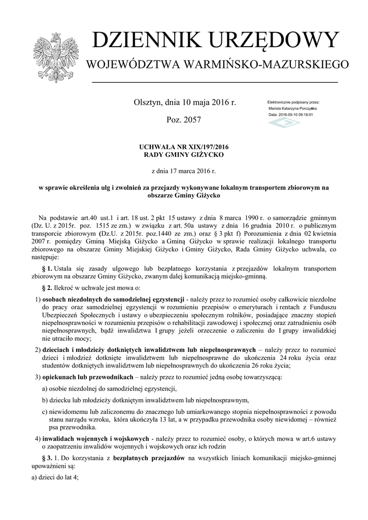 DZIENNIK URZĘDOWY WOJEWÓDZTWA WARMIŃSKO-MAZURSKIEGO Olsztyn, dnia 10 maja 2016 r. Elektronicznie podpisany przez: Mariola Katarzyna Porczyńska Poz. 2057 Data: 2016-05-10 09:18:01 UCHWAŁA NR XIX/197/2016 RADY GMINY GIŻYCKO z dnia 17 marca 2016 r. w sprawie określenia ulg i zwolnień za przejazdy wykonywane lokalnym transportem zbiorowym na obszarze Gminy Giżycko Na podstawie art.40 ust.1 i art. 18 ust. 2 pkt 15 ustawy z dnia 8 marca 1990 r. o samorządzie gminnym (Dz. U. z 2015r. poz. 1515 ze zm.) w związku z art. 50a ustawy z dnia 16 grudnia 2010 r. o publicznym transporcie zbiorowym (Dz.U. z 2015r. poz.1440 ze zm.) oraz § 3 pkt f) Porozumienia z dnia 02 kwietnia 2007 r. pomiędzy Gminą Miejską Giżycko a Gminą Giżycko w sprawie realizacji lokalnego transportu zbiorowego na obszarze Gminy Miejskiej Giżycko i Gminy Giżycko, Rada Gminy Giżycko uchwala, co następuje: § 1. Ustala się zasady ulgowego lub bezpłatnego korzystania z przejazdów lokalnym transportem zbiorowym na obszarze Gminy Giżycko, zwanym dalej komunikacją miejsko-gminną. § 2. Ilekroć w uchwale jest mowa o: 1) osobach niezdolnych do samodzielnej egzystencji - należy przez to rozumieć osoby całkowicie niezdolne do pracy oraz samodzielnej egzystencji w rozumieniu przepisów o emeryturach i rentach z Funduszu Ubezpieczeń Społecznych i ustawy o ubezpieczeniu społecznym rolników, posiadające znaczny stopień niepełnosprawności w rozumieniu przepisów o rehabilitacji zawodowej i społecznej oraz zatrudnieniu osób niepełnosprawnych, bądź inwalidztwa I grupy jeżeli orzeczenie o zaliczeniu do I grupy inwalidzkiej nie utraciło mocy; 2) dzieciach i młodzieży dotkniętych inwalidztwem lub niepełnosprawnych – należy przez to rozumieć dzieci i młodzież dotknięte inwalidztwem lub niepełnosprawne do ukończenia 24 roku życia oraz studentów dotkniętych inwalidztwem lub niepełnosprawnych do ukończenia 26 roku życia; 3) opiekunach lub przewodnikach – należy przez to rozumieć jedną osobę towarzyszącą: a) osobie niezdolnej do samodzielnej egzystencji, b) dziecku lub młodzieży dotkniętym inwalidztwem lub niepełnosprawnym, c) niewidomemu lub zaliczonemu do znacznego lub umiarkowanego stopnia niepełnosprawności z powodu stanu narządu wzroku, która ukończyła 13 lat, a w przypadku przewodnika osoby niewidomej – również psa przewodnika. 4) inwalidach wojennych i wojskowych - należy przez to rozumieć osoby, o których mowa w art.6 ustawy o zaopatrzeniu inwalidów wojennych i wojskowych oraz ich rodzin § 3. 1. Do korzystania z bezpłatnych przejazdów na wszystkich liniach komunikacji miejsko-gminnej upoważnieni są: a) dzieci do lat 4; Dziennik Urzędowy Województwa Warmińsko-Mazurskiego –2– Poz. 2057 b) osoby, które ukończyły 70 lat; c) inwalidzi wojenni i wojskowi; d) osoby niezdolne do samodzielnej egzystencji oraz ich opiekunowie i przewodnicy; e) dzieci i młodzież dotknięte inwalidztwem lub niepełnosprawne oraz ich opiekunowie i przewodnicy; f) posłowie i senatorowie; g) zasłużeni honorowi dawcy krwi; h) niewidomi lub zaliczeni do znacznego lub umiarkowanego stopnia niepełnosprawności z powodu stanu narządu wzroku oraz podróżujący z nimi przewodnicy. 2. Do korzystania z 50% ulgi w przejazdach na wszystkich liniach komunikacji miejsko-gminnej są: a) dzieci w wieku od 4 lat do ukończenia szkoły podstawowej, gimnazjum lub szkoły ponadgimnazjalnej – publicznej lub niepublicznej o uprawnieniach szkoły publicznej, nie dłużej niż do ukończenia 21 roku życia; b) studenci; c) emeryci i renciści. 3. Dokumentami uprawniającymi do korzystania z bezpłatnych i ulgowych przejazdów środkami komunikacji miejsko-gminnej są: a) dla dzieci do czasu rozpoczęcia nauki w szkole podstawowej – dokument stwierdzający wiek dziecka; b) dla osób, które ukończyły 70 lat życia – dowód osobisty lub inny dokument tożsamości ze zdjęciem; c) dla osób niezdolnych do samodzielnej egzystencji, niepełnosprawnych oraz dla dzieci i młodzieży dotkniętych inwalidztwem lub niepełnosprawnych – dokumenty potwierdzające niepełnosprawność wydane przez właściwy organ na podstawie odrębnych przepisów; d) dla opiekuna lub przewodnika osoby niepełnosprawnej – dokument potwierdzający niepełnosprawność podopiecznego; e) dla emerytów i rencistów – ważna legitymacja emeryta, rencisty; f) dla uczniów szkół podstawowych, gimnazjów i szkół ponadgimnazjalnych oraz studentów – ważna legitymacja uczniowska lub studencka; g) dla inwalidów wojennych i inwalidów wojskowych – ważna legitymacja inwalidzka; h) dla zasłużonych honorowych dawców krwi – legitymacja zasłużonego honorowego dawcy krwi łącznie z dowodem osobistym lub innym dokumentem ze zdjęciem potwierdzającym tożsamość i) dla niewidomych lub zaliczonych do znacznego lub umiarkowanego stopnia niepełnosprawności z powodu stanu narządu wzroku – legitymacja osoby niepełnosprawnej, stwierdzająca znaczny lub umiarkowany stopień niepełnosprawności oznaczona symbolem przyczyny niepełnosprawności – 04 – O, wystawiona przez uprawniony organ lub inny dokument stwierdzający znaczny lub umiarkowany stopień niepełnosprawności z powodu stanu narządu wzroku. § 4. Traci moc Uchwała Nr XI/120/07 Rady Gminy Giżycko z dnia 27 listopada 2007 r. w sprawie określenia ulg w biletach w lokalnym transporcie zbiorowym na obszarze Gminy Miejskiej Giżycko i Gminy Giżycko. § 5. Wykonanie Uchwały powierza się Wójtowi Gminy Giżycko. § 6. Uchwała podlega publikacji w Dzienniku Urzędowym Województwa Warmińsko-Mazurskiego i obowiązuje od dnia 1 lipca 2016r. Przewodniczący Rady Gminy Miron Misztuk