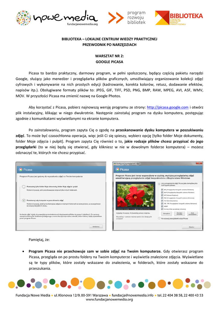 BIBLIOTEKA – LOKALNE CENTRUM WIEDZY PRAKTYCZNEJ PRZEWODNIK PO NARZĘDZIACH WARSZTAT NR 2: GOOGLE PICASA Picasa to bardzo praktyczny, darmowy program, w pełni spolszczony, będący częścią pakietu narzędzi Google, służący jako menedżer i przeglądarka plików graficznych, umożliwiający organizowanie kolekcji zdjęć cyfrowych i wykonywanie na nich prostych edycji (kadrowanie, korekta kolorów, retusz, dodawanie efektów, napisów itp.). Obsługiwane formaty plików to: JPEG, GIF, TIFF, PSD, PNG, BMP, RAW, MPEG, AVI, ASF, WMV, MOV. W przyszłości Picasa ma zmienić nazwę na Google Photos. Aby korzystać z Picasa, pobierz najnowszą wersję programu ze strony: http://picasa.google.com i otwórz plik instalacyjny, klikając w niego dwukrotnie. Następnie zainstaluj program na dysku komputera, postępując zgodnie z komunikatami wyświetlanymi na ekranie komputera. Po zainstalowaniu, program zapyta Cię o zgodę na przeskanowanie dysku komputera w poszukiwaniu zdjęć. To może być czasochłonna operacja, więc jeśli Ci się spieszy, wybierz opcję [tylko folder Moje dokumenty, folder Moje zdjęcia i pulpit]. Program zapyta Cię również o to, jakie rodzaje plików chcesz przypisać do jego przeglądarki (to w niej będą się otwierać, gdy klikniesz w nie w dowolnym folderze komputera) – możesz odznaczyć te, których nie chcesz przypisać. Pamiętaj, że: Program Picasa nie przechowuje sam w sobie zdjęć na Twoim komputerze. Gdy otwierasz program Picasa, przegląda on po prostu foldery na Twoim komputerze i wyświetla znalezione zdjęcia. Wyświetlane są te typy plików, które zostały wskazane do znalezienia, w folderach, które zostały wskazane do przeszukania. Twoje oryginalne zdjęcia są zawsze zachowywane. Korzystanie z narzędzi do edycji w programie Picasa nigdy nie powoduje modyfikowania oryginalnych zdjęć. Dopóki nie zdecydujesz się zapisać zmian wprowadzonych na zdjęciach, będą one widoczne tylko w programie Picasa. Ale nawet wtedy Picasa utworzy nową wersję zdjęcia z zastosowanymi zmianami, pozostawiając oryginalny plik całkowicie bez zmian. Po przeskanowaniu folderów w domyślnym widoku Picasa zobaczysz bibliotekę zdjęć. Aby dodać do niej inne fotografie, skorzystaj z opcji [importowanie] widocznej w lewym górnym rogu ekranu. Do programu Picasa można importować zdjęcia z różnych źródeł – bezpośrednio z aparatów fotograficznych, dysków CD, kart pamięci, skanerów, kamer internetowych i innych urządzeń. Importowane przez Ciebie zdjęcia są zapisywane na komputerze i automatycznie wyświetlane w programie Picasa. Lista folderów po lewej stronie to centralne miejsce porządkowania zdjęć w programie Picasa. Przewijając tę listę, możesz uzyskać dostęp do wszystkich zdjęć wyświetlanych w programie Picasa. Aby zrozumieć ideę porządkowania zdjęć za pomocą programu Picasa, musisz zrozumieć działanie następujących trzech kolekcji: Foldery. W programie Picasa reprezentują foldery na Twoim komputerze. To Ty decydujesz o folderach przeszukiwanych i wyświetlanych przez program Picasa. Zmiany wprowadzane w folderach za pomocą programu Picasa są odzwierciedlane w strukturze folderów na dysku twardym. Na przykład jeżeli usuniesz zdjęcie w folderze w programie Picasa, to zdjęcie zostanie również usunięte z komputera. Albumy. W przeciwieństwie do folderów, albumy istnieją tylko w programie Picasa. Albumy umożliwiają tworzenie wirtualnych grup zdjęć pochodzących z wielu folderów na komputerze. Te zdjęcia są wyświetlane w albumach bez rzeczywistego przenoszenia zdjęć – to coś jak listy odtwarzania zdjęć. W przypadku usunięcia lub przeniesienia zdjęć z albumu oryginalne pliki pozostają w swoich folderach na Twoim komputerze. Osoby. W tej kolekcji możesz uporządkować zdjęcia według tego, co często najważniejsze – widocznych na tych zdjęciach osób. Program Picasa używa technologii rozpoznawania twarzy do znajdowania i grupowania podobnych twarzy w Twojej całej kolekcji zdjęć. Nowe albumy osób są tworzone przez dodawanie plakietek do tych grup twarzy. Te albumy osób działają tak samo, jak albumy powyżej: gdy przenosisz lub usuwasz twarze, oryginalne zdjęcia pozostają nietknięte. Dowolnemu folderowi możesz przypisać ustawienie [usuń z programu Picasa], klikając ten folder prawym przyciskiem myszy (w systemie Windows) lub klikając go z naciśniętym klawiszem Ctrl (na Macu) i wybierając polecenie [usuń z programu Picasa]. Jak zautomatyzować i ustawić po swojemu monitorowanie zasobów komputera przez Picasa? Możesz to zrobić przy użyciu [menedżera folderów] – to w nim można określać lokalizacje na dysku twardym monitorowane przez program Picasa. Aby to zrobić wykonaj następujące kroki: 1. Kliknij menu [narzędzia] w programie Picasa. 2. Wybierz polecenie [menedżer folderów]. 3. Z listy po lewej stronie wybierz folder, który chcesz dodać do listy elementów obserwowanych przez program Picasa lub usunąć z tej listy. 4. Po prawej stronie wybierz jedną z następujących opcji monitorowania: [zawsze skanuj] program Picasa przejrzy wszystkie zgodne typy zdjęć w tych folderach i automatycznie doda nowe zdjęcia. Dany folder będzie aktywnie monitorowany pod kątem zmian. [skanuj raz] program Picasa wyszuka wszystkie zgodne typy zdjęć w tych folderach tylko raz. Przy tym ustawieniu nie będą wykrywane nowe zdjęcia dodawane do folderów. [usuń z programu Picasa] program Picasa nie będzie skanować folderów oznaczonych w ten sposób. 5. Kliknij przycisk [OK], aby zapisać zmiany. Foldery skonfigurowane w programie Picasa jako stale skanowane będą widoczne na liście w sekcji [foldery obserwowane]. Aby przejść do edycji dowolnego zdjęcia, kliknij w nie dwa razy. Oto, z jakich funkcji możesz skorzystać: Przytnij Narzędzie Przytnij pozwala lepiej dopasować rozmiar zdjęcia lub usunąć te części zdjęcia, których nie chcesz oglą