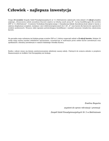 Człowiek - najlepsza inwestycja Grupa 24 uczniów Zespołu Szkół Ponadgimnazjalnych nr 3 w Bełchatowie zakończyła swój udział w I edycji projektu unijnego ,,Nowoczesna szkoła zawodowa kluczem wejścia na lokalny rynek pracy III – kursy kwalifikacyjne dla uczniów ZSP nr 3 w Bełchatowie”. Uczniowie Technikum Energetycznego i I Zasadniczej Szkoły Zawodowej brali udział w kursie z zakresu eksploatacji urządzeń, instalacji i sieci elektroenergetycznych do 1 kV ,,E” oraz kursie dla kierowców operatorów wózków jezdniowych. Wszyscy zdali egzamin potwierdzający kwalifikacje i uzyskali stosowne świadectwa ukończenia kursów. Na początku maja wyłoniono też kolejną grupę uczniów ZSP nr 3, którzy rozpoczęli udział w II edycji kursów. Kolejne 24 osoby mają szansę uzyskać dodatkowe uprawnienia, uczestnicząc w wybranym przez siebie kursie zawodowym oraz spotkaniach z doradcą zawodowym w ramach Szkolnego Ośrodka Kariery. Każda z edycji cieszy się dużym zainteresowaniem młodzieży naszej szkoły. Chetnych do wzięcia udziału w projekcie finansowanym ze środków Unii Europejskiej nie brakuje. Ewelina Bogacka asystent do spraw rekrutacji i promocji Zespół Szkół Ponadgimnazjalnych Nr 3 w Bełchatowie