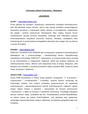 e.Portugal, Global Technology – Wystawcy e.BUSINESS ALERT – www.alert-online.com Firma zajmuje się rozwojem, dystrybucją i wdrażaniem rozwiązań informatycznych Alert dla placówek służby zdrowia. Jest to cały szereg rozwiązań upraszczających stosowane procedury w instytucjach służby zdrowia, w szczególności, dedykowany dla szpitali i centrów medycznych. Rozwiązanie Alert, między różnymi innymi możliwościami, sprzyja ochronie środowiska, redukując ilość makulatury poprzez zinformatyzowanie wszystkich czynności instytucji. Aktualnie, rozwiązania Alert funkcjonują już w ponad połowie portugalskich placówek izby przyjęć oraz są obecne w ponad 30 krajach. EDIGMA – www.edigma.com DISPLAX™ INTERACTIVE WINDOW jest innowacyjnym systemem komunikacyjnym, składającym się z przezroczystego i interaktywnego ekranu holograficznego. Interaktywna technologia DISPLAX™ opracowana na przezroczystej kliszy pozwala na jej wykorzystanie w nietypowych miejscach, takich jak wystawy sklepowe lub wielkowymiarowe ekrany. Główne rynki eksportowe firmy to Dubaj, Hiszpania, USA, Brazylia oraz Australia, a spośród jej klientów należy wymienić IBM, Cirque du Soleil, Pepsi, Accenture i Telefonica. GRUPA PDM – www.pdmfc.com Grupa PDM przedstawia w Polsce swoje globalne rozwiązania IT (e-business / e-government / e-entertainment / e-mobility), spośród których wyróżniają się technologia mobilna, linia nowych produktów przeznaczonych do wspierania zróżnicowanych i spersonalizowanych technik komunikacyjnych mających ułatwić relacje między firmami a klientami i doprowadzić do korzyści technicznych i finansowych, a także do korzyści w dziedzinie konkurencji. Pozwalają wzbogacić łańcuch wartości usług i produktów dla firm. Przedstawiamy produkt Blue4Mobility, na którym opiera się system EnterTheMatrix, czyli globalnej sieci społecznej, zawierający spersonalizowane usługi w zależności od położenia geograficznego oraz kontekstu. 1 GRUPA VISABEIRA – www.grupovisabeira.pt BeOn – Technology Solutions jest zbiorem innowacyjnych i elastycznych rozwiązań, zintegrowanych między sobą, opartym na hardware i software przystosowanych do potrzeb biznesowych każdego klienta. Mając na uwadze takie właśnie wymagania, ekipa I&D, wchodząca w skład Visabeira Digital, zainwestowała w rozwiązania ukierunkowane na dwie dziedziny: BeOn Mobility – wsparcie mobilności, zarządzanie flotą samochodową firmy, zarządzanie zadaniami i ekipami sprzedaży. BeOn Office – innowacyjne narzędzia wspierające automatyzację procesów firmy. ON SITE! ON TIME! ON LINE! INOSAT – www.inosat.com Inofrota Web jest systemem lokalizacji pojazdów oraz zarządzania parkiem samochodowym firmy, opartym na technologii GPS i GSM, co pozwala Zarządowi parku na lokalizację każdego pojazdu w jakimkolwiek zakątku świata. Inosat Child Locator oraz Inosat Car Locator, złożone z GPS oraz z terminala GSM Quad Band, są systemem lokalizacji osób oraz pojazdów samochodowych. PRIMAVERA BBS – www.primaverabss.com PRIMAVERA – Business Software Solutions, S.A. jest firmą wyspecjalizowaną w opracowywaniu rozwiązań w dziedzinie zarządzania oraz platform do integracji procesów biznesowych. Od 2001 roku znajduje się w rankingu Europe's 500, składającym się z 500 firm europejskich o najwyższym potencjale rozwoju. Wraz ze swoją ekipą liczącą 240 doświadczonych i wysoce kwalifikowanych współpracowników PRIMAVERA BSS jest obecna w Portugalii, Hiszpanii, Angoli, Mozambiku, na Wyspach Zielonego Przylądka, w Gwinei-Bisau oraz w Brazylii. PORTUGAL TELECOM INOVAÇÃO, SA – www.ptinovacao.pt „podążając ku przyszłości” Portugal Telecom Inovação, SA (PT Inovação) jest oddziałem Grupy Portugal Telecom, największego holdingu operatorów usług telekomunikacyjnych w Portugalii, który odpowiedzialny jest za innowacje w branży usług telekomunikacyjnych. Przedsiębiorstwo korzystające ze spuścizny ponad pięćdziesięcioletnich doświadczeń w sektorze badań i rozwoju zostało oficjalnie powołane do istnienia 2 w maju 1999 r., tym samym zastępując dwie uprzednio istniejące instytucje: GECA (Centro de Estudos da Comutação Automática), prowadzącą działalność w latach 1950 -1972, oraz CET (Centro de Estudos de Telecomunicações) istniejącą w latach 1972 -1999. Spółka PT Inovação, mająca swą główną siedzibę w Aveiro, posiada również swoje Oddziały Regionalne w Porto i Lizbonie, oraz spółki zależne w São Paulo (Brazylia), i Luandzie (Angola). PT Inovação stanowi ogniwo technologiczne Grupy, odpowiadające za rozwój nowatorskich rozwiązań i usług, gwarantujące Grupie uzyskanie pozycji lidera na rynku, zarówno w Portugalii, jak i w innych krajach, oferując wsparcie w dziedzinie technologii Sieci Inteligentnych ponad 70 użytkownikom. W toku prowadzonej od ponad 50 lat działalności w branży telekomunikacyjnej, spółka PT Inovação stworzyła solidne fundamenty wiedzy technologicznej, wywierając znaczący wpływ na wielopoziomowe procesy modernizacji Portugalskiego Krajowego Systemu Komunikacyjnego. PT Inovação posiada doświadczenie w zakresie badań stosowanych, integracji systemów technologicznych, rozwoju usług i wypracowywania nowych rozwiązań, inżynierii telekomunikacyjnej oraz szkoleń. Główne oferowane produkty to systemy i rozwiązania w zakresie sieci inteligentnych (architektury IMS – nowej generacji/ konwergencji sieciowej), sieci dostępu (miedzianych i optycznych), multimediów oraz rozwiązań IP, sieci telefonii mobilnej, usług i platform, zarządzania siecią, systemów klasy Business Intelligence, systemów informatycznych, inżynierii oprogramowania oraz procedur, wsparcia i szkoleń w dziedzinie telekomunikacji. Spółka promuje współpracę w zakresie badań i rozwoju i może się poszczycić partnerstwem ze znaczącymi uczelniami i ośrodkami innowacyjnymi zarówno w kra