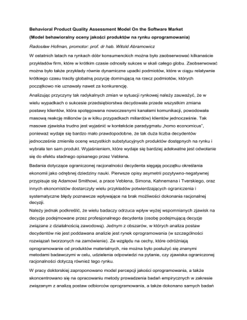 Behavioral Product Quality Assessment Model On the Software Market (Model behawioralny oceny jakości produktów na rynku oprogramowania) Radosław Hofman, promotor: prof. dr hab. Witold Abramowicz W ostatnich latach na rynkach dóbr konsumenckich można było zaobserwować kilkanaście przykładów firm, które w krótkim czasie odnosiły sukces w skali całego globu. Zaobserwować można było także przykłady równie dynamiczne upadki podmiotów, które w ciągu relatywnie krótkiego czasu traciły globalną pozycję dominującą na rzecz podmiotów, których początkowo nie uznawały nawet za konkurencję. Analizując przyczyny tak radykalnych zmian w sytuacji rynkowej należy zauważyć, że w wielu wypadkach o sukcesie przedsiębiorstwa decydowała przede wszystkim zmiana postawy klientów, która spotęgowana nowoczesnymi kanałami komunikacji, powodowała masową reakcję milionów (a w kilku przypadkach miliardów) klientów jednocześnie. Tak masowe zjawiska trudno jest wyjaśnić w kontekście paradygmatu „homo economicus”, ponieważ wydaje się bardzo mało prawdopodobne, że tak duża liczba decydentów jednocześnie zmieniła ocenę wszystkich substytucyjnych produktów dostępnych na rynku i wybrała ten sam produkt. Wyjaśnieniem, które wydaje się bardziej adekwatne jest odwołanie się do efektu stadnego opisanego przez Veblena. Badania dotyczące ograniczonej racjonalności decydenta sięgają początku określania ekonomii jako odrębnej dziedziny nauki. Pierwsze opisy asymetrii pozytywno-negatywnej przypisuje się Adamowi Smithowi, a prace Veblena, Simona, Kahnemana i Tverskiego, oraz innych ekonomistów dostarczyły wielu przykładów potwierdzających ograniczenia i systematyczne błędy poznawcze wpływające na brak możliwości dokonania racjonalnej decyzji. Należy jednak podkreślić, że wielu badaczy odrzuca wpływ wyżej wspomnianych zjawisk na decyzje podejmowane przez profesjonalnego decydenta (osobę podejmującą decyzje związane z działalnością zawodową). Jednym z obszarów, w których analiza postaw decydentów nie jest poddawana analizie jest rynek oprogramowania (w szczególności rozwiązań tworzonych na zamówienie). Ze względu na cechy, które odróżniają oprogramowanie od produktów materialnych, nie można było posłużyć się znanymi metodami badawczymi w celu, udzielenia odpowiedzi na pytanie, czy zjawiska ograniczonej racjonalności dotyczą również tego rynku. W pracy doktorskiej zaproponowano model percepcji jakości oprogramowania, a także skoncentrowano się na opracowaniu metody prowadzenia badań empirycznych w zakresie związanym z analizą postaw odbiorców oprogramowania, a także dokonano samych badań w paradygmacie niezależnych grup poddawanych działaniu zjawisk, które uprzednio zaobserwowano w komercyjnych projektach. Wynik przeprowadzonych badań empirycznych potwierdził tezę, która zakładała, że profesjonalny odbiorca oprogramowania będzie poddawał się tendencyjności przy ocenie oprogramowania ze względu m.in. na własne wspomnienia związane z wcześniejszymi wersjami produktu, własnymi skojarzeniami związanymi z produktem, oraz opinii innych, które były przyjmowane jako własne. Siła zjawisk i analiza trafności eksperymentów wskazuje na niezwykle niskie prawdopodobieństwo tego, że zaobserwowane zjawiska były dziełem przypadku. Należy podkreślić, że praca ma charakter pionierski w zakresie oceny postaw odbiorców oprogramowania, a zbadane zjawiska stanowią zaledwie część zjawisk, jakie badano w odniesieniu do prostych produktów materialnych. Praca wykazała, że zjawiska opisywane przez ekonomię behawioralną występują również na rynku oprogramowania. Co za tym idzie, opracowanie i wykorzystanie w praktyce modelu jakości uwzględniającego te zjawiska, będzie pozwalało na adekwatniejsze planowanie i zarządzanie jakością oraz postrzeganiem jakości oprogramowania.