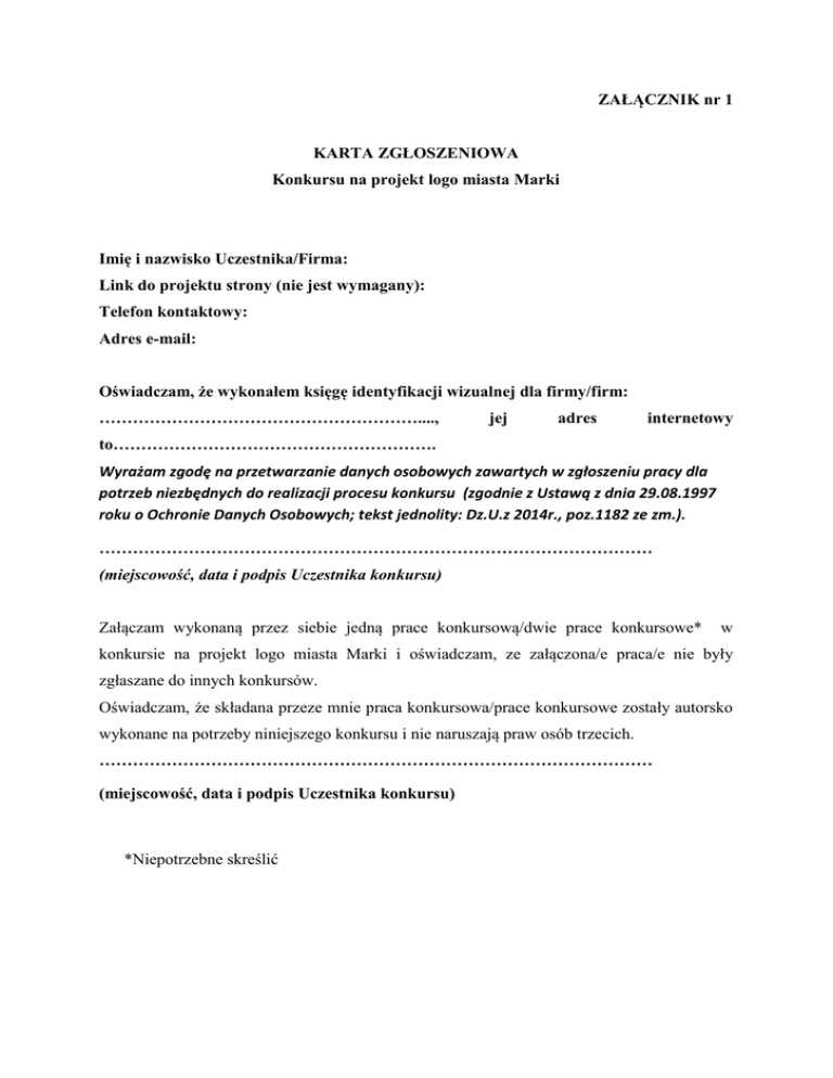 ZAŁĄCZNIK nr 1 KARTA ZGŁOSZENIOWA Konkursu na projekt logo