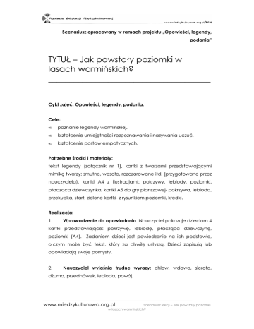 Scenariusz opracowany w ramach projektu „Opowieści, legendy, podania” TYTUŁ – Jak powstały poziomki w lasach warmińskich? ______________________________________ Cykl zajęć: Opowieści, legendy, podania. Cele: • poznanie legendy warmińskiej. • kształcenie umiejętności rozpoznawania i nazywania uczuć, • kształcenie postaw empatycznych. Potrzebne środki i materiały: tekst legendy (załącznik nr 1), kartki z twarzami przedstawiającymi mimikę twarzy: smutne, wesołe, rozczarowane itd. (przygotowane przez nauczyciela), kartki A4 z ilustracjami: pokrzywy, lebiody, poziomki, płacząca dziewczynka, kartki A5 do gry planszowej- pokrzywa, lebioda, przekupka, start, zielone kartki- z rysunkiem poziomki, kredki. Realizacja: 1. Wprowadzenie do opowiadania. Nauczyciel pokazuje dzieciom 4 kartki przedstawiające: pokrzywę, lebiodę, płacząca dziewczynę, poziomki (A4). Zadaniem dzieci jest powiedzenie na ich podstawie, o czym moŜe być tekst, który za chwilę usłyszą. Dzieci zapisują lub opowiadają swoje pomysły. 2. Nauczyciel wyjaśnia trudne wyrazy: chlew, wdowa, sierota, dŜuma, przednówek, lebioda, powój. ________________________________________________________________________________________ www.miedzykulturowa.org.pl Scenariusz lekcji – Jak powstały poziomki w lasach warmińskich? 3. Prowadzący czyta pierwszy fragment tekstu. Pokazuje dzieciom ilustracje z mimiką twarzy. Następnie prosi dzieci o wybranie twarzy, które pasują do twarzy ludzi z Warmii z pierwszego fragmentu historii. Zadaniem dzieci jest powiedzieć, dlaczego wybrały te fotografie. 4. Podział grupy na dwie części. Nauczyciel wręcza jednej z nich II fragment tekstu, a drugiej III fragment. Dzieci po przeczytaniu fragmentu przygotowują na jego podstawie scenki pantomimiczne. Zadaniem przeciwnej grupy jest odgadnięcie, co grupa przedstawiła. Opowiadają jakie postacie brały udział w scence oraz co dalej dzieje się z główną bohaterką-sierotą. Przy przedstawianiu przez dzieci scenek moŜemy zastosować technikę „stop-klatka” (sposób omawiania tego ćwiczenia jako rozmowa o tym, co się dzieje w obrazie, jakie zdarzenie zostało uchwycone i jaką czynność kaŜda z postaci wykonuje). Zadajemy dziecku pytania, np. Co teraz robisz? 5. Po odegraniu scenek prowadzący pyta dzieci: „Co zrobiła dziewczynka?”, „Co byście zrobili na jej miejscu?”. Wariant I – pytania zadajemy dla całej klasy. Wariant II – kaŜda grupa odpowiada na jedno pytanie. 6. Czytamy ostatni fragment tekstu – IV fragment. Rozmawiamy z dziećmi o tym, jak czuła się rodzina wdowy po otrzymaniu tylu poziomek. Która z twarzy pokazuje jej uczucia? 7. Wspólna gra planszowa „Pomagamy wdowie – zbieramy poziomki”. Przygotowanie gry: dzieci w grupach przygotowują elementy do gry – ilustracje A4 z roślinami z opowieści: pokrzywa (4 szt.), lebioda (4 szt.), pole „start/meta” oraz ilustracje poziomek do połoŜenia na puste plansze(ok. 30 szt.). Dodatkowo nauczyciel przygotowuje ok. 15 zielonych kartek. Wszystkie kartki układa w taki sposób, Ŝe tworzą krąg. ________________________________________________________________________________________ www.miedzykulturowa.org.pl Scenariusz lekcji – Jak powstały poziomki w lasach warmińskich? Kartki zielone symbolizują las, na nich w dowolnej ilości układa wspólnie z dziećmi ilustracje poziomek. Gra: Celem gry jest zebranie jak najwięcej poziomek, w ustalonej na początku liczbie rzutów (np. 10). Zasady: W grze moŜe wziąć udział do 4 graczy (zespołów). Gra rozpoczyna się od pola „start/meta”. Gracze w ustalonej kolejności poruszają się zgodnie z liczbą wyrzuconych oczek oraz zgodnie z ruchem wskazówek zegara. Jeśli gracz stanie na polu zielonym z poziomkami, moŜe wziąć jedną poziomkę. Jeśli stanie na polu Pokrzywa – cofa się o dwa pola i nie otrzymuje punktu, bo zbierając pokrzywę dziecko poparzyło się w ręce i dmucha na bąble. Jeśi gracz stanie na polu Lebioda – traci rzut kostką, bo zabrał się za gotowanie z niej zupy. ________________________________________________________________________________________ www.miedzykulturowa.org.pl Scenariusz lekcji – Jak powstały poziomki w lasach warmińskich? Załącznik nr 1 Legenda „Jak powstały poziomki w lasach warmińskich” – tekst podzielony na pięć fragmentów. Jak powstały poziomki w lasach warmińskich? Fragment 1 CięŜkie nastały dla Warmii czasy. Wrogie wojska zdeptały pola i obrabowały ludność z wszelkiej Ŝywności i odzienia. Za wojną trop w trop szła zaraza. Zmarło wtedy duŜo, bardzo duŜo ludzi, pomór bydła spustoszył stajnie i chlewy, nawet ryby w jeziorach zaginęły. Za tymi wszystkimi nieszczęściami szła klęska głodowa, wysysając resztki sił z ludzkich organizmów. Ponury gość głód zawitał takŜe do chaty pewnej wdowy, mieszkającej na skraju lasu. Jedyny Ŝywiciel rodziny, mąŜ i ojciec gromadki dzieci zmarł na dŜumę. Wdowa osłabiona po przebytej chorobie nie wiedziała jak nakarmić sześcioro głodnych dzieci. Zimą starczyło jeszcze dziennie po kawałku chleba, ale gdy nadszedł przednówek i tego zabrakło. Gotowano pokrzywy i lebiodę. Radowano się z tego, Ŝe moŜna ją było zasypać garścią kaszy. W czasie największego głodu przybyła do wdowiej chaty biedna sierota, prosząc o kawałek chleba. Na zarazę zmarli jej rodzice, właściwie wymarła cała wieś. Chaty spalono aŜeby zaraza nie rozszerzyła się na okolicę. Z płaczem wyruszyła więc dziewczynka w świat szukać litościwych ludzi. Fragment 2 Wdowa chociaŜ miała miękkie serce nie mogła sierocie nic więcej dać jak miseczkę lebiody z kaszą. Widząc biedę w chacie, sierota zjadła podaną potrawę, powiedziała Bóg zapłać i poszła dalej. Fragment 3 Idąc leśną dróŜką po jakimś czasie zmęczona usiadła na mchu i gorzko zapłakała nad swoją niedolą. Łzy spadały na mech i lśniły jak wi