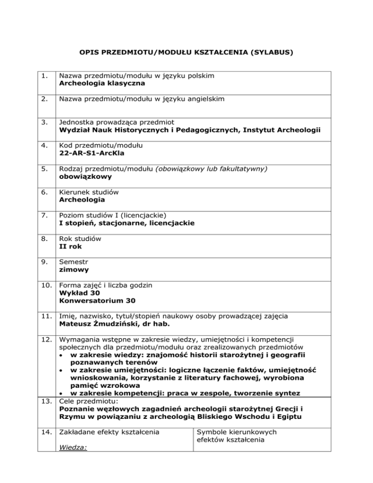 OPIS PRZEDMIOTU/MODUŁU KSZTAŁCENIA (SYLABUS) 1. Nazwa przedmiotu/modułu w języku polskim Archeologia klasyczna 2. Nazwa przedmiotu/modułu w języku angielskim 3. Jednostka prowadząca przedmiot Wydział Nauk Historycznych i Pedagogicznych, Instytut Archeologii 4. Kod przedmiotu/modułu 22-AR-S1-ArcKla 5. Rodzaj przedmiotu/modułu (obowiązkowy lub fakultatywny) obowiązkowy 6. Kierunek studiów Archeologia 7. Poziom studiów I (licencjackie) I stopień, stacjonarne, licencjackie 8. Rok studiów II rok 9. Semestr zimowy 10. Forma zajęć i liczba godzin Wykład 30 Konwersatorium 30 11. Imię, nazwisko, tytuł/stopień naukowy osoby prowadzącej zajęcia Mateusz Żmudziński, dr hab. 12. Wymagania wstępne w zakresie wiedzy, umiejętności i kompetencji społecznych dla przedmiotu/modułu oraz zrealizowanych przedmiotów w zakresie wiedzy: znajomość historii starożytnej i geografii poznawanych terenów w zakresie umiejętności: logiczne łączenie faktów, umiejętność wnioskowania, korzystanie z literatury fachowej, wyrobiona pamięć wzrokowa w zakresie kompetencji: praca w zespole, tworzenie syntez 13. Cele przedmiotu: Poznanie węzłowych zagadnień archeologii starożytnej Grecji i Rzymu w powiązaniu z archeologią Bliskiego Wschodu i Egiptu 14. Zakładane efekty kształcenia Wiedza: Symbole kierunkowych efektów kształcenia Znajomość klasyfikacji kulturowej, form ceramicznych, typologii, klasyfikacji wyrobów oraz zastosowania budowli stosowanych dla świata starożytnego Umiejetności: Umiejętność opisu oraz rozpoznawania przeznaczenia i chronologii zabytków związanych z cywilizacjami antycznymi Kompetencje społeczne: Student potrafi określić priorytety realizacji zadań ma świadomość odpowiedzialności za zachowanie dla przyszłych pokoleń dziedzictwa kulturowego K_W02 K_W03 K_W04 K_W16 K_U01 K_U02 K_K03 K_K05 15. Treści programowe: Kultury starożytnej Mezopotamii i Egiptu, antycznej Grecji i Imperium Rzymskiego. Archeologiczny opis (określenie chronologii, typologii, stylu dekoracji, zastosowania zabytków) wytworów kultury materialnej z obszaru Mezopotamii, Egiptu i obszarów objętych Imperium Rzymskim. Konwersatorium: Urbanistyka grecka, dom grecki. Greckie budownictwo użytkowe Świątynia grecka. Typy, plany i zastosowanie świątyń. Porządek dorycki i jego elementy. Porządek joński i jego odmiany, porządek koryncki. Greckie wazy i ich zastosowanie. Greckie malarstwo wazowe. Techniki wykonywania dekoracji. Style malarskie i malarze. Grecka rzeźba archaiczna. Typy rzeźby. Funkcje. Wpływy wschodnie i egipskie. Grecka rzeźba klasyczna V w. p.n.e. Największe osiągnięcia artystyczne i techniczne. Typy kompozycji, techniki wykonania. Grecka rzeźba IV w. p. n. e. Osiągnięcia rzeźbiarzy i szkoły rzeźbiarskie. Rzeźba hellenistyczna. Szkoły artystyczne, typy kompozycji, techniki, zastosowanie rzeźb, propaganda w rzeźbie. Urbanistyka rzymska. Rzymskie budownictwo użytkowe. Rzymska architektura mieszkalna (domus, dom grecko-rzymski, villae i ich typy, pałace cesarskie). Rzeźba rzymska okresu republiki i cesarstwa Rzymski relief historyczny i jego znaczenie propagandowe. Mozaiki greckie i rzymskie. Techniki wykonania, typy kompozycji, zastosowania. Rzymskie malarstwo ścienne. Style malarstwa, techniki, tematyka. Wykłady: Kultury Mezopotamii: sumeryjska, akkadyjska, okresu renesansu sumeryjskiego Kultura babilońska Kultura asyryjska Persja doby Achemenidów Kultura hetycka Rzemiosło egipskie doby faraonów Egipskie relief techniki wykonania, tematyka, funkcja Egipskie malarstwo ścienne: tematyka, typy, zastosowanie, sposoby wykonania. Egipska rzeźba: typy, formy, kompozycje, funkcje, techniki. Kultura mykeńska (twierdze, grobowce, malarstwo, rękodzieło) Kultura minojska: pałace, groby, malarstwo, rzeźba, rękodzieło Kultura etruska: urbanistyka, świątynia, dom, groby i ich typy, malarstwo ścienne, biżuteria, broń, osiągnięcia cywilizacyjne Groby rzymskie, ich rodzaje. Świątynia rzymska plany, typy, formy, dekoracje. Budownictwo militarne rzymskie: obozy wojskowe i ich części, limesy, rodzaje fortyfikacji, kasztele, wieże obserwacyjne. 16. Zalecana literatura: J. Śliwa, Sztuka i archeologia starożytnego Wschodu, Warszawa-Kraków 1997; E. Papuci-Władyka, Sztuka starożytnej Grecji, Warszawa-Kraków 2001, J. Boardman, Sztuka grecka Wrocław 1999; A. Sadurska, Archeologia starożytnego Rzymu t.1, 2, Warszawa 1975. 17. Forma zaliczenia poszczególnych komponentów przedmiotu/modułu, sposób sprawdzenia osiągnięcia zamierzonych efektów kształcenia: wykład: ustny egzamin końcowy konwersatorium: sprawdziany, odpowiedzi ustne w trakcie zajęć, egzamin końcowy 18. Język wykładowy polski 19. Obciążenie pracą studenta Forma aktywności studenta Godziny zajęć (wg planu studiów) z nauczycielem: - wykład: - ćwiczenia: Praca własna studenta: - przygotowanie do zajęć: - zwiedzanie wystaw muzealnych, oglądanie kolekcji zabytków i baz danych zdjęć stanowisk Średnia liczba godzin na zrealizowanie aktywności 30 30 30 10 przez Internet; - czytanie literatury fachowej: - przygotowanie do egzaminu: 20 30 Suma godzin 150 Liczba punktów ECTS 4 5 *objaśnienie symboli: K (przed podkreśleniem) - kierunkowe efekty kształcenia W - kategoria wiedzy U - kategoria umiejętności K (po podkreśleniu) - kategoria kompetencji społecznych 01, 02, 03 i kolejne - numer efektu kształcenia