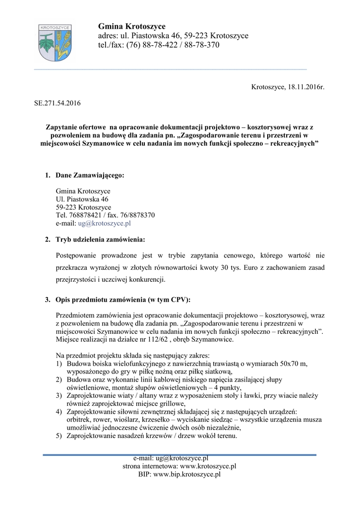 Gmina Krotoszyce adres: ul. Piastowska 46, 59-223 Krotoszyce tel./fax: (76) 88-78-422 / 88-78-370 _________________________________________________________________________________________________________________ Krotoszyce, 18.11.2016r. SE.271.54.2016 Zapytanie ofertowe na opracowanie dokumentacji projektowo – kosztorysowej wraz z pozwoleniem na budowę dla zadania pn. „Zagospodarowanie terenu i przestrzeni w miejscowości Szymanowice w celu nadania im nowych funkcji społeczno – rekreacyjnych” 1. Dane Zamawiającego: Gmina Krotoszyce Ul. Piastowska 46 59-223 Krotoszyce Tel. 768878421 / fax. 76/8878370 e-mail: [email protected] 2. Tryb udzielenia zamówienia: Postępowanie prowadzone jest w trybie zapytania cenowego, którego wartość nie przekracza wyrażonej w złotych równowartości kwoty 30 tys. Euro z zachowaniem zasad przejrzystości i uczciwej konkurencji. 3. Opis przedmiotu zamówienia (w tym CPV): Przedmiotem zamówienia jest opracowanie dokumentacji projektowo – kosztorysowej, wraz z pozwoleniem na budowę dla zadania pn. „Zagospodarowanie terenu i przestrzeni w miejscowości Szymanowice w celu nadania im nowych funkcji społeczno – rekreacyjnych”. Miejsce realizacji na działce nr 112/62 , obręb Szymanowice. Na przedmiot projektu składa się następujący zakres: 1) Budowa boiska wielofunkcyjnego z nawierzchnią trawiastą o wymiarach 50x70 m, wyposażonego do gry w piłkę nożną oraz piłkę siatkową, 2) Budowa oraz wykonanie linii kablowej niskiego napięcia zasilającej słupy oświetleniowe, montaż słupów oświetleniowych – 4 punkty, 3) Zaprojektowanie wiaty / altany wraz z wyposażeniem stoły i ławki, przy wiacie należy również zaprojektować miejsce grillowe, 4) Zaprojektowanie siłowni zewnętrznej składającej się z następujących urządzeń: orbitrek, rower, wioślarz, krzesełko – wyciskanie siedząc – wszystkie urządzenia musza umożliwiać jednoczesne ćwiczenie dwóch osób niezależnie, 5) Zaprojektowanie nasadzeń krzewów / drzew wokół terenu. e-mail: [email protected] strona internetowa: www.krotoszyce.pl BIP: www.bip.krotoszyce.pl Gmina Krotoszyce adres: ul. Piastowska 46, 59-223 Krotoszyce tel./fax: (76) 88-78-422 / 88-78-370 _________________________________________________________________________________________________________________ 4. Warunki udziału w postępowaniu o udzielenie zamówienia oraz opis sposobu dokonania oceny ich spełnienia: Zamawiający wymaga posiadania uprawnień w zakresie przewidzianym w art. 14 ustawy z dnia 7 lipca Prawo budowlane ( Dz. U.2013. poz.1409 ), niezbędne do wykonania przedmiotu zamówienia. W celu potwierdzenia warunku spełniania udziału w postępowaniu należy dostarczyć zaświadczenie o nadaniu uprawnień i przynależności do właściwej grupy. Zamawiający oceni spełnianie warunku w formule spełnia/niespełna. Wykonawcy nie spełniający warunku zostaną wykluczeni z postępowania. 5. Kryteria oceny ofert: Kryteriami oceny ofert są poniżesz elementy: - najniższa cena ( cn) - doświadczenie ( d) Cn + d = Najwyższa suma punktów = najkorzystniejsza oferta. Nazwa kryterium Waga Sposób obliczenia Uwagi cn/cb x 60= ilość pkt Cn- kryterium 1 Cena 60% cena oferty najkorzystniejszej Cb- cena oferty badanej 2 Doświadczenie (ilość 40% Od 0 do 2 -10 pkt opracowanych Od 3 do 4 - 20 pkt dokumentacji) 5 i więcej - 40 pkt Zamawiający wybierze najkorzystniejszą oferte z pośród złożonych w terminie, która osiągnie najwyższy wskaźnik punktowy. 6. Sposób przygotowania oferty: Wykonawca składa wypełniony odpowiedni Formularz Ofertowy wg wzoru - załącznik nr 1 e-mail: [email protected] strona internetowa: www.krotoszyce.pl BIP: www.bip.krotoszyce.pl Gmina Krotoszyce adres: ul. Piastowska 46, 59-223 Krotoszyce tel./fax: (76) 88-78-422 / 88-78-370 _________________________________________________________________________________________________________________ do niniejszego zapytania, wraz z ofertą wykonawca przedkłada wykaz wykonanych usług – załącznik nr 2 oraz parafowany wzór umowy – załącznik nr 3. Ofertę powinna być przesłana za pośrednictwem poczty, kuriera lub osobiście w siedzibie Zamawiającego Urząd Gminy Krotoszyce ul. Piastowska 46, 59-223 Krotoszyce (sekretariat) z dopiskiem Oferta” Zagospodarowanie terenu i przestrzeni w miejscowości Szymanowice w celu nadania im nowych funkcji społeczno – rekreacyjnych”. Oferta powinna być sporządzona w języku polskim. 7. Sposób oceny ofert: Zamawiający oceni oferty, które wpłynęły w terminie na podstawie kryteriów ofert. Oferty złożone po terminie nie będą rozpatrywane. Oferent może przed upływem terminu składania ofert wycofać swoją ofertę, zaznaczając taką informację osobnym pismem. 8. Termin składania ofert: Oferty należy złożyć do dnia 28 listopada br. 9. Termin realizacji zadania: Ustala się termin wykonania zadania od dnia podpisania umowy do dnia 31.01.2017r. 10. Zamawiający nie dopuszcza składania ofert częściowych. 11. Określenie warunków istotnych zmian umowy zawartej w wyniku postępowania: Wzór umowy stanowi załącznik nr 3 do niniejszego zapytania. Przewidywane zmiany umowy zawarto we wzorze umowy stanowiącym jego integralną część. 12. Dodatkowych informacji udziela: Informacji dodatkowych udziela: Anna Rabska , e-mail: sekretarz@krotoszyce,pl, tel. 76 8878421 w. 13, 13. Informacja o wyborze najkorzystniejszej oferty: e-mail: [email protected] strona internetowa: www.krotoszyce.pl BIP: www.bip.krotoszyce.pl Gmina Krotoszyce adres: ul. Piastowska 46, 59-223 Krotoszyce tel./fax: (76) 88-78-422 / 88-78-370 _________________________________________________________________________________________________________________ Informacja zostanie przesłana do Wykonawców, którzy złożyli oferty oraz zamieszczona na stronie internetowej Zamawiającego. 14. Informacje dodatkowe: Zapytanie zostało zamieszczone na stronie www.krotoszyce.pl Zał