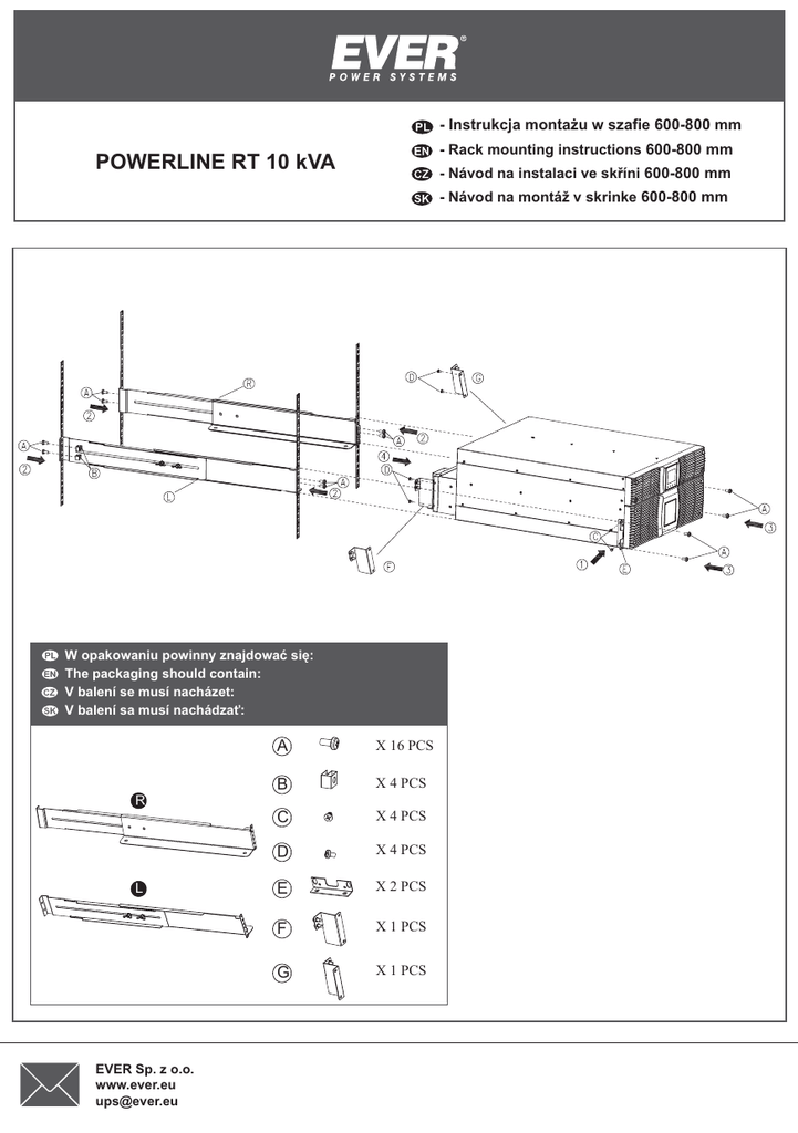 - Instrukcja montażu w szafie 600-800 mm - Rack mounting instructions 600-800 mm POWERLINE RT 10 kVA - Návod na instalaci ve skříni 600-800 mm - Návod na montáž v skrinke 600-800 mm W opakowaniu powinny znajdować się: The packaging should contain: V balení se musí nacházet: V balení sa musí nachádzať: A X 16 PCS B X 4 PCS C X 4 PCS D X 4 PCS E X 2 PCS F X 1 PCS G X 1 PCS R L EVER Sp. z o.o. www.ever.eu [email protected]