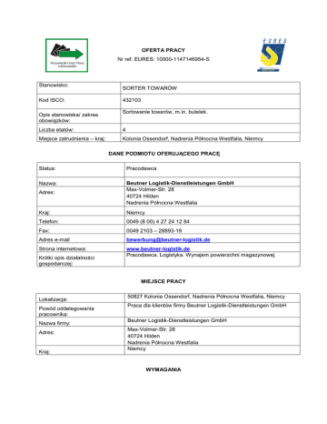 OFERTA PRACY Nr ref. EURES: 10000-1147146954-S Stanowisko: Kod ISCO: Opis stanowiska/ zakres obowiązków: SORTER TOWARÓW 432103 Sortowanie towarów, m.in. butelek. Liczba etatów: 4 Miejsce zatrudnienia – kraj: Kolonia Ossendorf, Nadrenia Północna Westfalia, Niemcy DANE PODMIOTU OFERUJĄCEGO PRACĘ Status: Pracodawca Nazwa: Adres: Beutner Logistik-Dienstleistungen GmbH Max-Volmer-Str. 28 40724 Hilden Nadrenia Północna Westfalia Kraj: Niemcy Telefon: 0049 (8 00) 4 27 24 12 84 Fax: 0049 2103 – 28893-19 Adres e-mail [email protected] Strona internetowa: www.beutner-logistik.de Pracodawca. Logistyka. Wynajem powierzchni magazynowej. Krótki opis działalności gospodarczej: MIEJSCE PRACY Lokalizacja: Powód oddelegowania pracownika: Nazwa firmy: Adres: Kraj: 50827 Kolonia Ossendorf, Nadrenia Północna Westfalia, Niemcy Praca dla klientów firmy Beutner Logistik-Dienstleistungen GmbH Beutner Logistik-Dienstleistungen GmbH Max-Volmer-Str. 28 40724 Hilden Nadrenia Północna Westfalia Niemcy WYMAGANIA Wykształcenie nie ma znaczenia dla pracodawcy Wykształcenie: Atutem będzie wykształcenie kierunkowe lub doświadczenie zawodowe w branży magazynowej / logistycznej. Pracodawca dopuszcza także kandydatów bez doświadczenia zawodowego. Język niemiecki A1 Wymóg konieczny Wymagana znajomość języka niemieckiego w stopniu umożliwiającym komunikację z pracodawcą oraz pracownikami. Doświadczenie zawodowe: Znajomość języków: Uprawnienia/ dyplomy/ dokumenty (np. prawo jazdy): Posiadanie prawa jazdy kat. B będzie atutem. Rzetelność. Dobra kondycja fizyczna. Inne istotne wymagania: Dopuszczalna ograniczonym, pracodawcy. Dodatkowe informacje: znajomość języka niemieckiego w pozwalającym jednak na zrozumienie stopniu poleceń WYNAGRODZENIE I WARUNKI ZATRUDNIENIA Stawka godzinowa w wysokości 8,5 euro brutto plus 1 euro premii. Wysokość pensji brutto: Waluta, w jakiej wypłacana jest pensja: Rodzaj stawki wynagrodzenia: Euro (€) Godzinowa płatna miesięcznie Premie zależne od wyników pracy. Premie: Dodatki branżowe możliwe. Pracodawca pomaga w znalezieniu zakwaterowania. W początkowym okresie (1-2 tygodnie) oferuje możliwość wynajęcia pokoju za odpłatnością przez pracownika. Dodatkowe świadczenia Nazwa firmy, z którą zostanie podpisana umowa: Beutner Logistik-Dienstleistungen GmbH Rodzaj umowy: Umowa o pracę. Wymiar czasu pracy (praca na pełen etat/ część etatu): Pełny etat. Czas trwania umowy: Umowa na czas nieokreślony (nieokreślony/ określony) Data wygaśnięcia umowy (w przypadku umowy na czas określony): Liczba godzin tygodniowo: 37,5 Zmiany i praca w dni wolne: Praca w trybie 3-zmianowym - możliwa praca na poranną oraz nocną zmianę. Data rozpoczęcia: 03.10.2016 r. SPOSÓB SKŁADANIA WNIOSKU Wymagane dokumenty (list motywacyjny, CV itp.): CV wraz z danymi dotyczącymi wykształcenia i doświadczenia zawodowego. Język, w którym muszą być sporządzone przedkładane dokumenty: niemiecki Do doradcy EURES w WUP w Katowicach: Małgorzata Gościniak Do kogo należy wysłać dokumenty: (do pracodawcy/ doradcy EURES) Gdzie należy wysłać dokumenty: (adres, adres e-mail, nr faksu z kodem kraju itp.) Dane teleadresowe doradcy EURES lub przedstawiciela pracodawcy: (nazwisko, adres, telefon, fax, e-mail itp.) Aplikacje proszę kierować pocztą elektroniczną (e-mail) na adres e-mail doradcy EURES w Wojewódzkim Urzędzie Pracy w Katowicach: [email protected] Małgorzata Gościniak - doradca EURES w WUP w Katowicach tel. 032/ 757-33-91 [email protected] Beutner Logistik Dienstleistungen GmbH kontakt w języku niemieckim - Pani Sabine Niedzwetzki tel. 0049 800 427 24 1284 DODATKOWE INFORMACJE Uprzejmie informujemy, że skontaktujemy się wyłącznie z wybranymi kandydatami. WAŻNOŚĆ Data publikacji: 07.09.2016 r. Termin przedkładania podań o pracę / zakończenia ważności oferty: Do odwołania UWAGA: 1. Umowa z zagranicznym pracodawcą zostanie zawarta zgodnie z prawem kraju zatrudnienia. Oznacza to, że wszystkie roszczenia odnośnie do warunków, które obejmuje umowa, można kierować wyłącznie do odpowiedniego sądu w kraju zatrudnienia. Publiczne służby zatrudnienia (EURES) nie mogą pośredniczyć ani reprezentować pracownika w sądzie kraju zatrudnienia w przypadku sporu z pracodawcą. 2. Publiczne służby zatrudnienia (EURES) dokładają wszelkich starań, aby zapewnić rzetelność i wiarygodność ofert pracy zgłoszonych w lokalnym urzędzie pracy. Należy wyjaśnić, że oferta pracy została zgłoszona przez stronę trzecią i EURES nie odpowiada za ewentualne rozbieżności między warunkami pracy określonymi w ofercie pracy i warunkami oferowanymi przez potencjalnego pracodawcę. 3. Publiczne służby zatrudnienia (EURES) informują, że będą zbierać, przetwarzać i przekazywać potencjalnym pracodawcom zgodnie z przepisami dotyczącymi ochrony danych osobowych wszystkie dane osobowe dostarczone przez osoby poszukujące pracy.