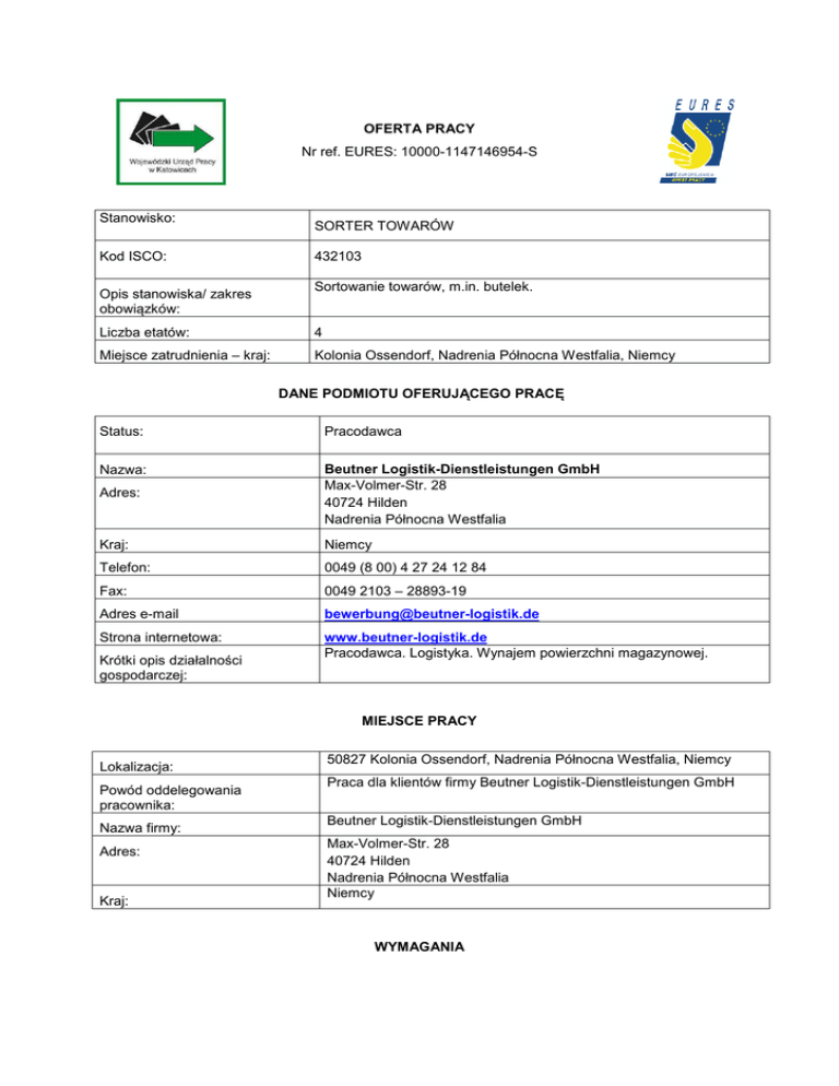 OFERTA PRACY Nr ref. EURES: 10000-1147146954