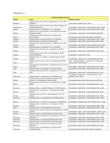 Załącznik nr 1. Lokalizacje Delikatesów Alma Godziny otwarcia Miasto Adres Bydgoszcz Delikatesy Alma, Focus Mall, ul. Jagiellońska 39 - 47, 85 - 097 Bydgoszcz Poniedziałek - Niedziela 9:00 - 21:00 Częstochowa Gdynia Delikatesy Alma, Galeria Jurajska, Aleja Wojska Polskiego 207, 42-202 Częstochowa Delikatesy Alma, ul. Redłowska 41, 81 - 450 Gdynia Poniedziałek - Sobota 10:00 - 22:00, Niedziela 10:00 - 20:00 Poniedziałek - Sobota 8:00 - 22:00, Niedziela 10:00 - 20:00 Gdynia Delikatesy Alma, Galeria Szperk, ul. Płk. Dąbka 338 , 81-198 Kosakowo k. Gdyni Poniedziałek - sobota 9.00 - 22.00, Niedziela 9.00-20.00 Gdynia Katowice Kraków Delikatesy Alma, Dom Mody Klif, Al. Zwycięstwa 256, 81-525 Gdynia Delikatesy Alma, ul. Kościuszki 90, 40 - 047 Katowice Delikatesy Alma, ul. Pilotów 6, 30-964 Kraków Poniedziałek-sobota 8:00-22:00, Niedziela 9:00-20:00 Poniedziałek - Sobota 9:00 - 21:00, Niedziela 10:00 - 20:00 Poniedziałek - Sobota 8:00 - 22:00, Niedziela 9:00 - 20:00 Kraków Kraków Delikatesy Alma, Galeria Kazimierz, ul. Podgórska 34, 31-356 Kraków Delikatesy Alma, ul. Kościuszki 71, 30 - 114 Kraków Poniedziałek - Sobota 10:00 - 22:00, Niedziela 10:00 - 20:00 Poniedziałek - Sobota 8:00 - 21:00, Niedziela 9:00 - 20:00 Kraków Delikatesy Alma, Salwator City, ul. Stańczyka 14, 30-126 Kraków Poniedziałek - Sobota 8:00 - 22:00, Niedziela 9:00 - 21:00 Kraków Delikatesy Alma, Futura Park, ul. Rożańskiego 32, 32-085 Kraków Modlniczka Poniedziałek – sobota 9.00 - 21.00 Kraków Delikatesy Alma, C.H. Dekada, ul. Stojałowskiego 6, 30-611 Kraków Poniedziałek - sobota 8.00 - 21.00, Niedziela 9.00-21.00 Lubin Delikatesy Alma , Cuprum Arena, ul. Sikorskiego 20, 59-300 Lubin 8.00 - 21.00 poniedziałek - czwartek, 8.00 - 22.00 piątek sobota, 9.00 - 21.00 niedziela Lublin Łódź Delikatesy Alma, Galeria Olimp, al. Spółdzielczości Pracy 32, 20147 Lublin Poniedziałek - Sobota 9:00 - 21:00, Niedziela 9:00 - 20:00 Delikatesy Alma, ul. Kilińskiego 122-128, 90-316 Łódź Poniedziałek - Sobota 8:00 - 21:00, Niedziela 9:00 - 20:00 Łódź Delikatesy Alma, Manufaktura, ul. Ogrodowa 19 A, 91 - 065 Łódź Poniedziałek - Sobota 9:00 - 22:00, Niedziela 9:00 - 21:00 Nowy Targ Delikatesy Alma, ul. Szaflarska 174, 34-400 Nowy Targ Poniedziałek - Piątek 9:00 - 21:00, Sobota 8:00 - 21:00, Niedziela 10:00 - 19:00 Olsztyn Delikatesy Alma, Centrum Handlowo- Usługowe "Alfa Centrum" Al. Piłsudskiego 16, 10-576 Olsztyn Poniedziałek-sobota 9:00-21:00, Niedziela 10:00-20:00 Opole Delikatesy Alma, Solaris Center, pl. M. Kopernika 16, 45-040 Opole Poniedziałek - Sobota 8:00 - 22:00, Niedziela 9:00 - 21:00 Piaseczno Delikatesy Alma, ul. Wojska Polskiego 17, 05-500 Piaseczno Poniedziałek - Sobota 8:00 - 22:00, Niedziela 10:00 - 20:00 Poznań Delikatesy Alma, Stary Browar, ul. Półwiejska 32, 61-888 Poznań Poniedziałek - Sobota 8:00 - 22:00, Niedziela 9:00 - 21:00 Poznań Pruszków Delikatesy Alma, City Park, ul. Wyspiańskiego 26, 60 - 751 Poznań Delikatesy Alma, ul. Sprawiedliwości 4, 05-800 Pruszków Poniedziałek - Sobota 8:00 - 22:00, Niedziela 9:00 - 20:00 Poniedziałek - Sobota 8:00 - 22:00, Niedziela 10:00 - 20:00 Rybnik Delikatesy Alma , Focus Mall, ul. Chrobrego 1, 44-200 Rybnik Poniedziałek - Niedziela 9:00 - 21:00, Niedziela 9:00 - 21:00 Rzeszów Sopot Delikatesy Alma, Capital Park, al. T. Rejtana 23, 35-326 Rzeszów Delikatesy Alma, ul. Sikorskiego 8/10, 81-827 Sopot Poniedziałek - Sobota 8:00 - 22:00, Niedziela 10:00 - 20:00 Poniedziałek - Sobota 8:00 - 22:00, Niedziela 10:00 - 20:00 Szczecin Tarnów Delikatesy Alma, Galeria Kaskada, Al. Niepodległości 36, 70-404 Poniedziałek - Sobota - 9.00 - 21.00, Niedziela - 10.00 - 20.00 Szczecin Delikatesy Alma, ul. Dąbrowskiego 10, 33-100 Tarnów, Poniedziałek - Sobota 8:00 - 22:00, Niedziela 10:00 - 20:00 Warszawa Warszawa Warszawa Delikatesy Alma, Promenada,ul. Ostrobramska 75 C, 04-175 Warszawa Delikatesy Alma, ul. Zwycięzców 40,03-937 Warszawa, Delikatesy Alma, ul. Wrocławska 8, 01-493 Warszawa Poniedziałek - Sobota 9:00 - 22:00, Niedziela 10:00 - 20:00 Poniedziałek - Sobota 8:00 - 22:00, Niedziela 10:00 - 20:00 Poniedziałek – sobota 8.00 - 22.00, Niedziela 9:00 - 21:00 Warszawa Delikatesy Alma, Triton Park, ul. Grójecka 194, 02-301 Warszawa Poniedziałek - Sobota 8:00 - 22:00, Niedziela 9:00 - 20:00 Warszawa Delikatesy Alma, Dom Mody Klif, ul. Okopowa 58/72, 01-042 Warszawa Poniedziałek-sobota 8:00-22:00, Niedziela 9:00-20:00 Warszawa od 28.08.2013 Delikatesy Alma, Europlex, ul. Puławska zostaną uzupełnione po uruchomieniu lokalizacji Warszawa – Skorosze Delikatesy Alma, C.H. Skorosze, ul. Gen. F. SławojaSkładkowskiego 4, Warszawa 02-497 Poniedziałek - Sobota 10:00 - 21:00, Niedziela 10:00 - 20:00 Warszawa - Konstancin Delikatesy Alma, Stara Papiernia, al. Wojska Polskiego 3, lok. 46, 05-520 Konstancin Jeziorna Poniedziałek - Sobota 08:00 - 22:00, Niedziela 10:00 - 20:00 Warszawa - Wilanów Delikatesy Alma, Office Park, al. Rzeczypospolitej 1, 02-972 Warszawa Poniedziałek - Sobota 08:00 - 22:00, Niedziela 10:00 - 20:00 Wrocław Delikatesy Alma, Arkady Wrocławskie, ul. Powstańców Śląskich 2-4, 53-332 Wrocław Poniedziałek - Sobota 8:00 - 22:00, Niedziela 9:00 - 21:00 Wrocław Delikatesy Alma, Bielany Wrocławskie, ul. Czekoladowa 9, 55040 Wrocław Poniedziałek - Sobota 9:00 - 22:00, Niedziela 9:00 - 21:00 Wrocław Delikatesy Alma, Renoma, ul. Świdnicka 40, 50-024 Wrocław Poniedziałek - Sobota 8:30 - 21:30, Niedziela 9:30 - 20:30 Zielona Góra Delikatesy Alma, Focus Mall, ul. Wrocławska 17, 65-427 Zielona Góra Poniedziałek - Niedziela 9:00 - 21:00
