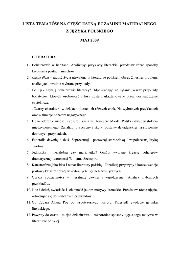 LISTA TEMATÓW NA CZĘŚĆ USTNĄ EGZAMINU MATURALNEGO Z JĘZYKA POLSKIEGO MAJ 2009 LITERATURA 1. Bohaterowie w habitach. Analizując przykłady literackie, przedstaw różne sposoby kreowania postaci mnichów. 2. Carpe diem – radość życia utrwalona w literaturze polskiej i obcej. Zilustruj problem, analizując dowolnie wybrane przykłady. 3. Co i jak czytają bohaterowie literaccy? Odpowiadając na pytanie, wskaż przykłady bohaterów, których osobowość i losy zostały ukształtowane przez doświadczenie czytelnicze. 4. „Czarny charakter” w dziełach literackich różnych epok. Na wybranych przykładach omów funkcje bohatera negatywnego. 5. Doświadczenie nicości i absurdu życia w literaturze Młodej Polski i dwudziestolecia międzywojennego. Zanalizuj przyczyny i skutki postawy dekadenckiej na stosownie dobranych przykładach. 6. Funeralia dawniej i dziś. Zaprezentuj i porównaj staropolską i współczesną lirykę żałobną. 7. Jednostka niezależna czy marionetka? Omów wybrane kreacje bohaterów dramatycznej twórczości Williama Szekspira. 8. Katastrofizm jako idea i temat literatury polskiej. Zanalizuj przyczyny i konsekwencje postawy katastroficznej w wybranych ujęciach artystycznych. 9. Obrazy codzienności w literaturze dawnej i współczesnej. Analiza wybranych przykładów. 10. Noc i dzień, światłość i ciemność jakom motywy literackie. Przedstaw różne ujęcia, odwołując się do wybranych przykładów. 11. Od Edgara Allana Poe do współczesnego horroru. Prześledź ewolucje gatunku literackiego. 12. Powroty do czasu i miejsc dzieciństwa – różnorodne sposoby ujęcia tego motywu w literaturze polskiej. 13. Różne sposoby funkcjonowania w literaturze obrazu szkoły - analiza wybranych przykładów. 14. Dokonując analizy wybranych tekstów literackich, omów rożne sposoby przedstawienia motywu zemsty. 15. Dokonując analizy wybranych utworów, omów różne sposoby przezwyciężania młodopolskiego marazmu. 16. Na wybranych przykładach omów różne sposoby realizacji motywu miasta w literaturze polskiej. 17. Dokonując analizy utworów, wybranego artysty, wykaż bogactwo tematyczne jego twórczości. 18. Uczta i zabawa. Odwołując się do wybranych utworów, zaprezentuj literackie obrazy zabaw i uczt. 19. Biografia jako klucz do odczytania twórczości dowolnie wybranego pisarza. 20. Omów i oceń drogi do kariery bohaterów literackich wybranych utworów. Rozwiń temat odwołując się do odpowiednich przykładów. 21. „Młodzi przeciwko starym”. Odwołując się do wybranych przykładów, ukaż konflikt pokoleń literackich jak zjawisko charakterystyczne dla różnego rodzaju przełomów w sztuce. 22. Różne sposoby kreacji outsidera w literaturze polskiej i obcej. Omów na podstawie wybranych przykładów. 23. Nauczyciel i uczeń w literaturze. Przedstaw na podstawie wybranych przykładów. 24. Niepokoje ludzi schyłku wieków. Dokonaj analizy zjawisk na wybranych przykładach. 25. Koniec świata arystokracji. Przestaw problem na wybranych przykładach literackich XIX i XX wieku. 26. Filozoficzne ujęcia motywy kozła ofiarnego w literaturze. Przedstaw zagadnienie na wybranych przykładach. 27. Bohaterowie z „kainowym piętnem”. Omów wpływ popełnionej zbrodni na życie wybranych postaci literackich. 28. Państwo i społeczeństwo – Rosja w oczach pisarzy. Omów problem przywołując stosowne dzieła literackie. 29. Miłość w okresie wojny i okupacji jako próba przezwyciężenia zła. Omów problem stosowne dzieła literackie. 30. Staropolska obyczajowość utrwalona w renesansowych i barokowych tekstach literackich – analiza wybranych przykładów. 31. Różnorodne ujęcia motywu przyjaźni, braterstwa i solidaryzmu w literaturze lagrowej i łagrowej - analiza wybranych przykładów. 32. Ludowy sposób widzenia i wartościowania świata. Zanalizuj zagadnienia na wybranych przykładach literatury polskiej. 33. Żart i refleksja – stosunek do świata w wybranych utworach Jana Kochanowskiego. 34. Średniowieczna pokora, renesansowa harmonia, niepokoje baroku – widzenie świata i człowieka w literaturze staropolskiej. 35. Spór między średniowiecznym rycerzem, renesansowym humanistom i siedemnastowiecznym Sarmatą o sens życia i pogląd na świat. Dokonaj analizy porównawczej literackich kreacji wzorców parenetycznych. 36. Dzieła literatury oświeceniowej jako apel do czytelników o naprawę Rzeczypospolitej – odwołaj się do tekstów publicystycznych, poezji, dramatu. 37. Pisarz świadkiem swej epoki. Przedstaw temat, wykorzystując wybrane utwory literackie. 38. Metamorfoza bohatera i jej sens w literaturze. 39. Wielkie problemy poezji C.K. Norwida (np.: człowieczeństwo i powinności człowieka, historia…) – odwołaj się do wybranych utworów reprezentatywnych dla tematu. 40. Pokonali los czy pokonani przez los? Andrzej Kmicic, Jacek Soplica, Stanisław Wokulski, Bernard Rieux. Przedstaw swój punkt widzenia na ten temat. 41. Miłość i poczucie obowiązku – to siły budujące czy niszczące? Ustosunkuj się do tego zagadnienia, wykorzystując wybrane utwory literackie i własne obserwacje. 42. Przedstaw portrety cudzoziemców utrwalone w utworach różnych epok. 43. Jaka jest przeciw włóczni złego twoja tarcza, / Człowiecze z końca wieku? (K. Przerwa-Tetmajer) – moje podróże po krainie literatury w poszukiwaniu wartości. 44. Mit o Prometeuszu i jego literackie przetworzenia. Omów problem, odwołując się do wybranych utworów. 45. Tragiczne losy pokolenia Kolumbów – analiza dowolnie wybranych tekstów prozatorskich i poetyckich literatury czasów wojny i okupacji. 46. Sztuka na usługach idei czy „sztuka dla sztuki”? Scharakteryzuj problem, analizując wybrane dzieła różnych epok. 47. Literackie portrety młodzieży. Scharakteryzuj zjawisko na dowolnie wybranych utworach różnych epok. 48. Życie i problemy warstw najuboższych w różnych tekstach literackich. Omów zaga