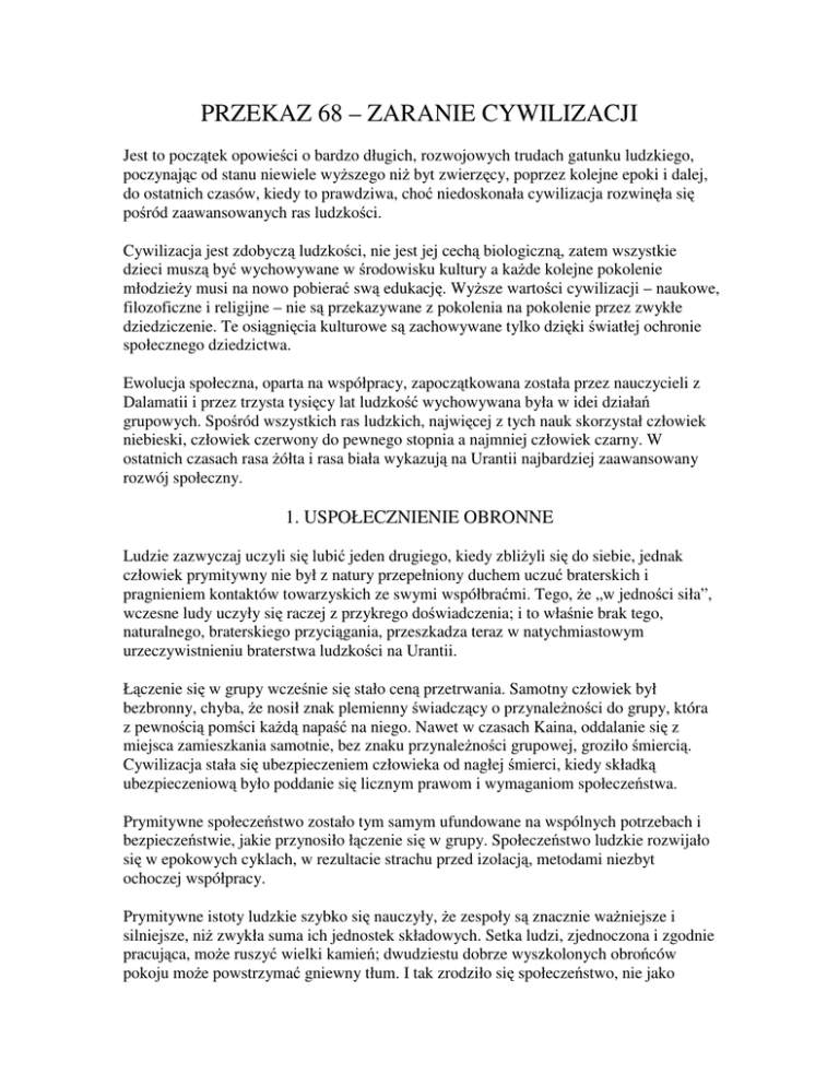 PRZEKAZ 68 – ZARANIE CYWILIZACJI Jest to początek opowieści o bardzo długich, rozwojowych trudach gatunku ludzkiego, poczynając od stanu niewiele wyższego niż byt zwierzęcy, poprzez kolejne epoki i dalej, do ostatnich czasów, kiedy to prawdziwa, choć niedoskonała cywilizacja rozwinęła się pośród zaawansowanych ras ludzkości. Cywilizacja jest zdobyczą ludzkości, nie jest jej cechą biologiczną, zatem wszystkie dzieci muszą być wychowywane w środowisku kultury a każde kolejne pokolenie młodzieży musi na nowo pobierać swą edukację. Wyższe wartości cywilizacji – naukowe, filozoficzne i religijne – nie są przekazywane z pokolenia na pokolenie przez zwykłe dziedziczenie. Te osiągnięcia kulturowe są zachowywane tylko dzięki światłej ochronie społecznego dziedzictwa. Ewolucja społeczna, oparta na współpracy, zapoczątkowana została przez nauczycieli z Dalamatii i przez trzysta tysięcy lat ludzkość wychowywana była w idei działań grupowych. Spośród wszystkich ras ludzkich, najwięcej z tych nauk skorzystał człowiek niebieski, człowiek czerwony do pewnego stopnia a najmniej człowiek czarny. W ostatnich czasach rasa żółta i rasa biała wykazują na Urantii najbardziej zaawansowany rozwój społeczny. 1. USPOŁECZNIENIE OBRONNE Ludzie zazwyczaj uczyli się lubić jeden drugiego, kiedy zbliżyli się do siebie, jednak człowiek prymitywny nie był z natury przepełniony duchem uczuć braterskich i pragnieniem kontaktów towarzyskich ze swymi współbraćmi. Tego, że „w jedności siła”, wczesne ludy uczyły się raczej z przykrego doświadczenia; i to właśnie brak tego, naturalnego, braterskiego przyciągania, przeszkadza teraz w natychmiastowym urzeczywistnieniu braterstwa ludzkości na Urantii. Łączenie się w grupy wcześnie się stało ceną przetrwania. Samotny człowiek był bezbronny, chyba, że nosił znak plemienny świadczący o przynależności do grupy, która z pewnością pomści każdą napaść na niego. Nawet w czasach Kaina, oddalanie się z miejsca zamieszkania samotnie, bez znaku przynależności grupowej, groziło śmiercią. Cywilizacja stała się ubezpieczeniem człowieka od nagłej śmierci, kiedy składką ubezpieczeniową było poddanie się licznym prawom i wymaganiom społeczeństwa. Prymitywne społeczeństwo zostało tym samym ufundowane na wspólnych potrzebach i bezpieczeństwie, jakie przynosiło łączenie się w grupy. Społeczeństwo ludzkie rozwijało się w epokowych cyklach, w rezultacie strachu przed izolacją, metodami niezbyt ochoczej współpracy. Prymitywne istoty ludzkie szybko się nauczyły, że zespoły są znacznie ważniejsze i silniejsze, niż zwykła suma ich jednostek składowych. Setka ludzi, zjednoczona i zgodnie pracująca, może ruszyć wielki kamień; dwudziestu dobrze wyszkolonych obrońców pokoju może powstrzymać gniewny tłum. I tak zrodziło się społeczeństwo, nie jako zwyczajne połączenie liczby jednostek, ale raczej jako rezultat organizacji inteligentnych i współdziałających jednostek. Współpraca nie jest jednak naturalną cechą ludzką; człowiek uczy się współpracować na początku w wyniku strachu a później dlatego, ponieważ odkrywa, że jest to najbardziej korzystne podczas stawianiu czoła trudnościom czasu; współpraca jest również ochroną przed przypuszczalnymi niebezpieczeństwami wieczności. Ci ludzie, którzy się wcześnie tak zorganizowali w prymitywne społeczeństwo, osiągnęli znaczne sukcesy w podboju natury, jak również w obronie przed swymi bliźnimi; posiadali większe możliwości przetrwania, zatem cywilizacja rozwijała się pewnie na Urantii, pomimo wielu niepowodzeń. To właśnie zwiększenie możliwości przetrwania w grupie sprawiło, że wiele ludzkich błędów nie miało większych szans zatrzymania czy zniszczenia ludzkiej cywilizacji. Nowoczesne, kulturalne społeczeństwo, jest raczej nowym zjawiskiem, co widać na przykładzie dotrwania do dzisiaj tak prymitywnych warunków społecznych, jakie panują u australijskich aborygenów czy Buszmenów i Pigmejów w Afryce. U tych, opóźnionych ludów, daje się zauważyć nieco wczesnej wrogości grupowej, osobistej podejrzliwości oraz innych, wysoce antyspołecznych cech, tak charakterystycznych dla wszystkich plemion prymitywnych. Te żałosne pozostałości z pradawnych czasów świadczą wymownie o tym, że naturalna, indywidualistyczna tendencja człowieka nie może skutecznie konkurować z bardziej dynamicznymi i potężnymi organizacjami oraz związkami postępu społecznego. Te zacofane i podejrzliwe, antyspołeczne plemiona, które mówią odmiennym dialektem co sześćdziesiąt czy osiemdziesiąt kilometrów, są przykładem tego, w jakim świecie moglibyście dzisiaj żyć, gdyby nie wspólne nauczanie cielesnego personelu Księcia Planetarnego i późniejsza działalność adamicznej grupy udoskonalaczy gatunku. Współczesne określenie „powrót do natury” jest złudą, wynikającą z ignorancji, wiarą w rzeczywiste istnienie kiedyś fikcyjnego, „złotego wieku”. Jedyną podstawą legend o złotym wieku jest historyczny fakt istnienia Dalamatii i Edenu. Jednak te, doskonalsze społeczeństwa, dalekie były od realizacji utopijnych marzeń. 2. CZYNNIKI POSTĘPU SPOŁECZNEGO Cywilizowane społeczeństwo pojawiło się w wyniku dawnych wysiłków człowieka, pragnącego zapanować nad awersją do osamotnienia. Nie musi to koniecznie oznaczać wzajemnych uczuć międzyludzkich a obecny, niestabilny stan pewnych prymitywnych grup ludzkich dobrze ukazuje, przez co przeszły wczesne plemiona człowieka. Chociaż cywilizowane jednostki mogą się kłócić ze sobą i walczyć jedna z drugą i chociaż sama cywilizacja może wydawać się niekonsekwentną masą walczących i trudzących się istot, jest to oznaką wytrwałych wysiłków a nie na śmiertelnej monotonii stagnacji. Chociaż poziom inteligencji przyczynia się znacznie do wzrostu 