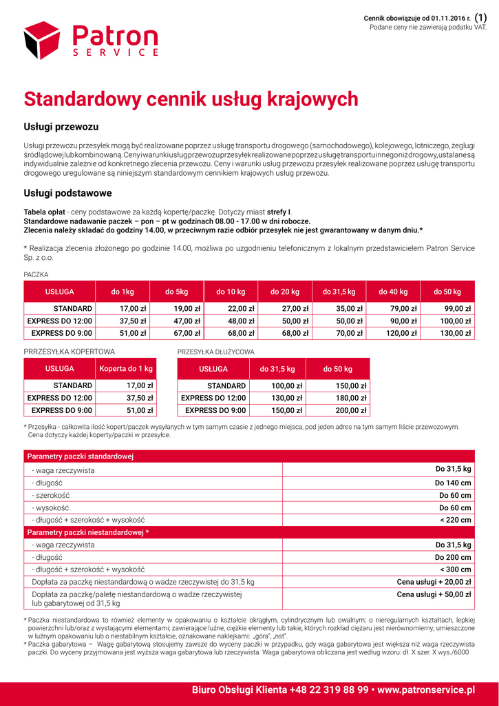 Cennik obowiązuje od 01.11.2016 r. (1) Podane ceny nie zawierają podatku VAT. Standardowy cennik usług krajowych Usługi przewozu Usługi przewozu przesyłek mogą być realizowane poprzez usługę transportu drogowego (samochodowego), kolejowego, lotniczego, żeglugi śródlądowej lub kombinowaną. Ceny i warunki usług przewozu przesyłek realizowane poprzez usługę transportu innego niż drogowy, ustalane są indywidualnie zależnie od konkretnego zlecenia przewozu. Ceny i warunki usług przewozu przesyłek realizowane poprzez usługę transportu drogowego uregulowane są niniejszym standardowym cennikiem krajowych usług przewozu. Usługi podstawowe Tabela opłat - ceny podstawowe za każdą kopertę/paczkę. Dotyczy miast strefy I. Standardowe nadawanie paczek – pon – pt w godzinach 08.00 - 17.00 w dni robocze. Zlecenia należy składać do godziny 14.00, w przeciwnym razie odbiór przesyłek nie jest gwarantowany w danym dniu.* * Realizacja zlecenia złożonego po godzinie 14.00, możliwa po uzgodnieniu telefonicznym z lokalnym przedstawicielem Patron Service Sp. z o.o. PACZKA USŁUGA do 1kg do 5kg do 10 kg do 20 kg do 31,5 kg do 40 kg do 50 kg STANDARD 17,00 zł 19,00 zł 22,00 zł 27,00 zł 35,00 zł 79,00 zł 99,00 zł EXPRESS DO 12:00 37,50 zł 47,00 zł 48,00 zł 50,00 zł 50,00 zł 90,00 zł 100,00 zł EXPRESS DO 9:00 51,00 zł 67,00 zł 68,00 zł 68,00 zł 70,00 zł 120,00 zł 130,00 zł PRRZESYŁKA KOPERTOWA USŁUGA PRZESYŁKA DŁUŻYCOWA Koperta do 1 kg USŁUGA do 31,5 kg do 50 kg STANDARD 17,00 zł STANDARD 100,00 zł 150,00 zł EXPRESS DO 12:00 37,50 zł EXPRESS DO 12:00 130,00 zł 180,00 zł EXPRESS DO 9:00 51,00 zł EXPRESS DO 9:00 150,00 zł 200,00 zł * Przesyłka - całkowita ilość kopert/paczek wysyłanych w tym samym czasie z jednego miejsca, pod jeden adres na tym samym liście przewozowym. Cena dotyczy każdej koperty/paczki w przesyłce. Parametry paczki standardowej - waga rzeczywista Do 31,5 kg - długość Do 140 cm - szerokość Do 60 cm - wysokość Do 60 cm - długość + szerokość + wysokość < 220 cm Parametry paczki niestandardowej * - waga rzeczywista Do 31,5 kg - długość Do 200 cm - długość + szerokość + wysokość < 300 cm Dopłata za paczkę niestandardową o wadze rzeczywistej do 31,5 kg Cena usługi + 20,00 zł Dopłata za paczkę/paletę niestandardową o wadze rzeczywistej lub gabarytowej od 31,5 kg Cena usługi + 50,00 zł * Paczka niestandardowa to również elementy w opakowaniu o kształcie okrągłym, cylindrycznym lub owalnym; o nieregularnych kształtach, lepkiej powierzchni lub/oraz z wystającymi elementami; zawierające luźne, ciężkie elementy lub takie, których rozkład ciężaru jest nierównomierny; umieszczone w luźnym opakowaniu lub o niestabilnym kształcie, oznakowane naklejkami: „góra”, „nst”. * Paczka gabarytowa – Wagę gabarytową stosujemy zawsze do wyceny paczki w przypadku, gdy waga gabarytowa jest większa niż waga rzeczywista paczki. Do wyceny przyjmowana jest wyższa waga gabarytowa lub rzeczywista. Waga gabarytowa obliczana jest według wzoru: dł. X szer. X wys./6000 Biuro Obsługi Klienta +48 22 319 88 99 • www.patronservice.pl Cennik obowiązuje od 01.11.2016 r. (2) Podane ceny nie zawierają podatku VAT. Tabela opłat – ceny podstawowe za każdą paczkę/paletę. Pół-paleta do 200 kg 89,00 zł Paczka/paleta do 100 kg 120,00 zł Paczka/paleta do 200 kg 140,00 zł Paczka/paleta do 300 kg 160,00 zł Paczka/paleta do 500 kg 200,00 zł Paczka/paleta do 800 kg 250,00 zł Paczka/paleta do 1000 kg 300,00 zł Parametry palety standardowej - waga Do 1000 kg - długość Do 120 cm - szerokość Do 80 cm - wysokość Do 180 cm - długość + szerokość + wysokość ≤ 380 cm Parametry palety niestandardowej* podstawa 120x100 cena standardowa za paletę + 100 zł podstawa 120x120 cena standardowa za paletę + 100 zł Parametry paczki dłużycowej ** - waga rzeczywista Do 50 kg - długość 200 cm < długość ≤ 300 cm - długość + szerokość + wysokość < 380 cm Dopłata za paczkę dłużycową o wadze rzeczywistej Do 30 kg Cena usługi + 50,00 zł Od 30 kg do 50 kg Cena usługi + 100,00 zł *Paleta niestrandardowa może osiągac wysokosć do 200 cm; suma wszystkich boków nie może przekroczyć 440 cm **Do kalkulacji ceny za przesyłkę o wadze rzeczywistej powyżej 31,5 kg, paczek niestandardowych, paczek gabarytowych, dłużyc, przesyłek paletowych stosowana jest wyższa waga (rzeczywista lub gabarytowa). W przypadku paczek: niestandardowych, gabarytowych, dłużyc przewóz następuje na odrębnym liście przewozowym dla każdej paczki. Ubezpieczenie przesyłki Deklaracja wartości przesyłki na liście przewozowym: w przypadku zadeklarowania wartości przesyłki (ubezpieczenia) obowiązkowe jest opisanie zawartości przesyłki na liście przewozowym. Do 500 zł Cena usługi + 0,50 zł Do 501 zł do 5000 zł Cena usługi + 1,00 zł Od 5001 zł do 20000 zł Cena usługi + 2,00 zł Od 20001 zł do 50000 zł Cena usługi + 3,00 zł Od 50001 zł do 100000 zł Cena usługi + 0,2 % deklarowanej wartości ubezpieczenia Usługi dodatkowe Zastrzeżenie godziny doręczenia przesyłki* - dostawa o godzinie: 13:00, 14:00, 15:00, 16:00. ROD Standard - zwrot podpisanych dokumentów. Zwrot dokumentów dołączonych do przesyłki w terminie do 5 dni roboczych, począwszy od dnia następnego po doręczeniu przesyłki. COD Standard – pobranie należności – maksymalna kwota pobrania do 6 500 zł na jednym liście przewozowym. Wpłata na konto bankowe wskazane w umowie w terminie 10 dni roboczych, począwszy od dnia następnego po doręczeniu przesyłki. COD Express – pobranie należności – maksymalna kwota pobrania do 6 500 zł na jednym liście przwozowym. Wpłata na konto bankowe wskazane w umowie w terminie 3 dni roboczych, począwszy od dnia następnego po doręczeniu przesyłki. Odbiór przesyłki w strefie B. Cena usługi + 20,00 zł Cena usługi + 8,00 zł Cena usługi + 6