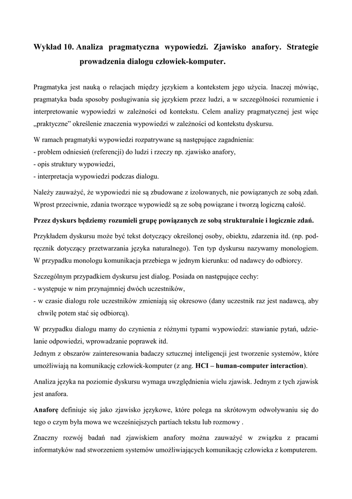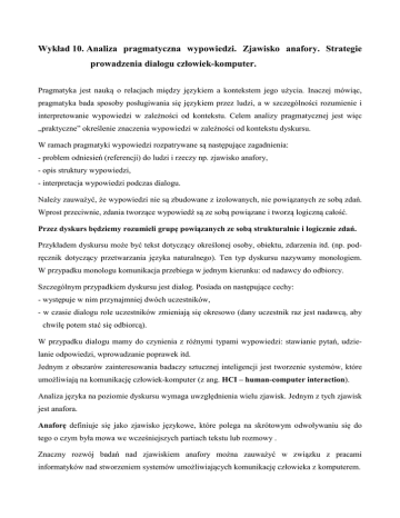 Wykład 10. Analiza pragmatyczna wypowiedzi. Zjawisko anafory