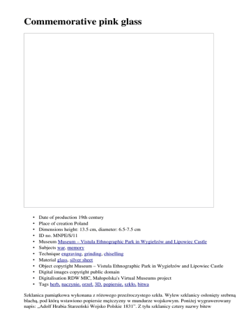 Commemorative pink glass • • • • • • • • • • • • Date of production 19th century Place of creation Poland Dimensions height: 13.5 cm, diameter: 6.57.5 cm ID no. MNPE/S/11 Museum Museum – Vistula Ethnographic Park in Wygiełzów and Lipowiec Castle Subjects war, memory Technique engraving, grinding, chiselling Material glass, silver sheet Object copyright Museum – Vistula Ethnographic Park in Wygiełzów and Lipowiec Castle Digital images copyright public domain Digitalisation RDW MIC, Małopolska's Virtual Museums project Tags herb, naczynie, orzeł, 3D, popiersie, szkło, bitwa Szklanica pamiątkowa wykonana z różowego przeźroczystego szkła. Wylew szklanicy osłonięty srebrną blachą, pod którą wstawiono popiersie mężczyzny w mundurze wojskowym. Poniżej wygrawerowany napis: „Adolf Hrabia Starzeński Wojsko Polskie 1831”. Z tyłu szklanicy cztery nazwy bitew powstańczych: „Grochów”, „Iganie”, „Ostrołęka”, „Bolimów”. Poniżej herb „Lis”, którym pieczętowali się Starzeńscy, oraz herb Królestwa Polskiego z roku 1831, w ukoronowanej tarczy dwudzielnej, na której widnieje tylko Orzeł, bez Pogoni. Najprawdopodobniej szklanica przedstawia popiersie Adolfa Starzeńskiego, upamiętniając jego udział w polskim powstaniu narodowym przeciw Rosji na przełomie roku 1830 i 1831. Szklanica była niegdyś rodzinną pamiątką Adama Edwarda hrabiego Starzeńskiego (1872—1956), który w okresie międzywojennym gospodarował w nieistniejącym już pałacu w Kościelcu, dzisiejszej dzielnicy miasta Chrzanowa. Hrabia Adam zgromadził kolekcję sztychów i litografii o tematyce związanej z historią Polski, jednakże w styczniu 1943 roku spłonął pałac wraz z cenną kolekcją sztychów i litografii. Po pożarze pałacu nie zdołano odbudować. Znaczna liczba pamiątek po rodzinie Starzeńskich trafiła do rąk prywatnych kolekcjonerów. Ten los spotkał również szklanicę, która w formie darowizny została przekazana w 2007 roku do Muzeum Nadwiślańskiego Parku Etnograficznego w Wygiełzowie i Zamek Lipowiec. Elaborated by Anna Latko (Museum – Vistula Ethnographic Park in Wygiełzów and Lipowiec Castle), © all rights reserved