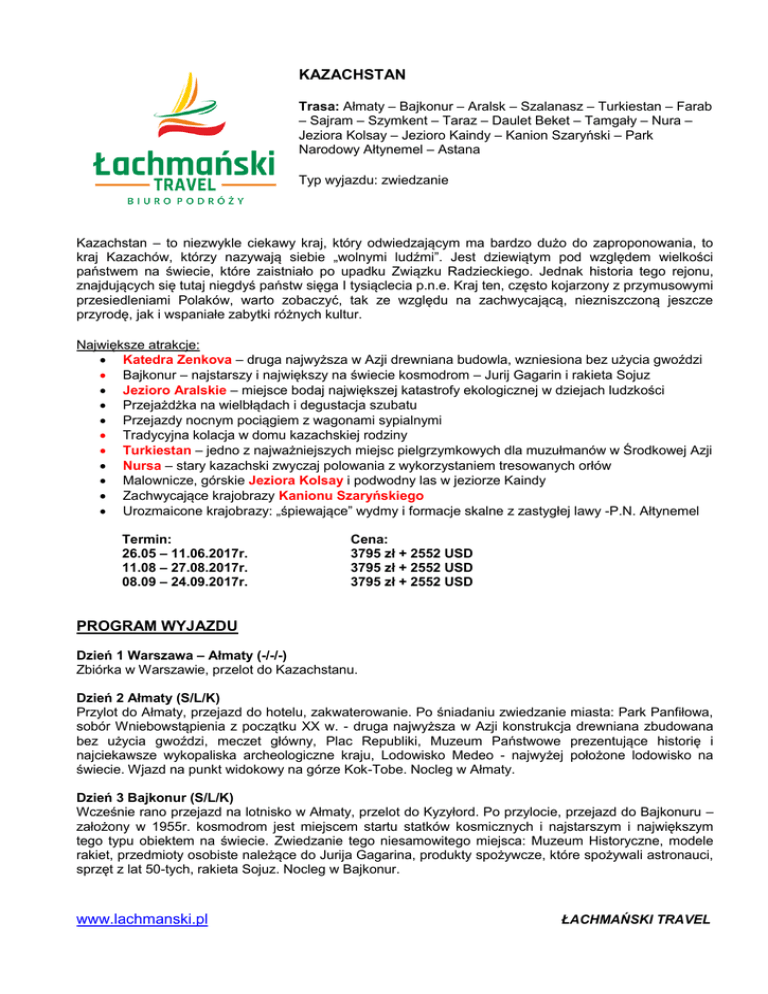 KAZACHSTAN Trasa: Ałmaty – Bajkonur – Aralsk – Szalanasz – Turkiestan – Farab – Sajram – Szymkent – Taraz – Daulet Beket – Tamgały – Nura – Jeziora Kolsay – Jezioro Kaindy – Kanion Szaryński – Park Narodowy Ałtynemel – Astana Typ wyjazdu: zwiedzanie Kazachstan – to niezwykle ciekawy kraj, który odwiedzającym ma bardzo dużo do zaproponowania, to kraj Kazachów, którzy nazywają siebie „wolnymi ludźmi”. Jest dziewiątym pod względem wielkości państwem na świecie, które zaistniało po upadku Związku Radzieckiego. Jednak historia tego rejonu, znajdujących się tutaj niegdyś państw sięga I tysiąclecia p.n.e. Kraj ten, często kojarzony z przymusowymi przesiedleniami Polaków, warto zobaczyć, tak ze względu na zachwycającą, niezniszczoną jeszcze przyrodę, jak i wspaniałe zabytki różnych kultur. Największe atrakcje: Katedra Zenkova – druga najwyższa w Azji drewniana budowla, wzniesiona bez użycia gwoździ Bajkonur – najstarszy i największy na świecie kosmodrom – Jurij Gagarin i rakieta Sojuz Jezioro Aralskie – miejsce bodaj największej katastrofy ekologicznej w dziejach ludzkości Przejażdżka na wielbłądach i degustacja szubatu Przejazdy nocnym pociągiem z wagonami sypialnymi Tradycyjna kolacja w domu kazachskiej rodziny Turkiestan – jedno z najważniejszych miejsc pielgrzymkowych dla muzułmanów w Środkowej Azji Nursa – stary kazachski zwyczaj polowania z wykorzystaniem tresowanych orłów Malownicze, górskie Jeziora Kolsay i podwodny las w jeziorze Kaindy Zachwycające krajobrazy Kanionu Szaryńskiego Urozmaicone krajobrazy: „śpiewające” wydmy i formacje skalne z zastygłej lawy -P.N. Ałtynemel Termin: 26.05 – 11.06.2017r. 11.08 – 27.08.2017r. 08.09 – 24.09.2017r. Cena: 3795 zł + 2552 USD 3795 zł + 2552 USD 3795 zł + 2552 USD PROGRAM WYJAZDU Dzień 1 Warszawa – Ałmaty (-/-/-) Zbiórka w Warszawie, przelot do Kazachstanu. Dzień 2 Ałmaty (S/L/K) Przylot do Ałmaty, przejazd do hotelu, zakwaterowanie. Po śniadaniu zwiedzanie miasta: Park Panfiłowa, sobór Wniebowstąpienia z początku XX w. - druga najwyższa w Azji konstrukcja drewniana zbudowana bez użycia gwoździ, meczet główny, Plac Republiki, Muzeum Państwowe prezentujące historię i najciekawsze wykopaliska archeologiczne kraju, Lodowisko Medeo - najwyżej położone lodowisko na świecie. Wjazd na punkt widokowy na górze Kok-Tobe. Nocleg w Ałmaty. Dzień 3 Bajkonur (S/L/K) Wcześnie rano przejazd na lotnisko w Ałmaty, przelot do Kyzyłord. Po przylocie, przejazd do Bajkonuru – założony w 1955r. kosmodrom jest miejscem startu statków kosmicznych i najstarszym i największym tego typu obiektem na świecie. Zwiedzanie tego niesamowitego miejsca: Muzeum Historyczne, modele rakiet, przedmioty osobiste należące do Jurija Gagarina, produkty spożywcze, które spożywali astronauci, sprzęt z lat 50-tych, rakieta Sojuz. Nocleg w Bajkonur. www.lachmanski.pl ŁACHMAŃSKI TRAVEL Dzień 4 Bajkonur – Aralsk (S/L/K) Zwiedzanie Bajkonuru: kompleks Zenit, statek kosmiczny Buran, punkt obserwacyjny, centrum monitorowania rakiety Sojuz, platformy 254, 1, 2, dom, w którym spał Jurij Gagarin przed startem w kosmos. Po kolacji transfer na dworzec kolejowy, przejazd nocnym pociągiem do Aralska (wagon 2. klasy, przedziały 4-osobowe). Dzień 5 Aralsk – Szalanasz (S/L/K) W nocy przyjazd pociągu do Aralska, przejazd do pensjonatu (guesthouse), nocleg. Po śniadaniu przejazd do Szalanasz, gdzie zobaczymy wraki statków pozostawione po wyschnięciu Jeziora Aralskiego. Podczas przejazdu do lokalnej wioski będziemy podziwiać kaniony i pozostałą po dnie jeziora słoną pustynię. Podczas pobytu w lokalnej wiosce przejażdżka na wielbłądach oraz degustacja tradycyjnego napoju z fermentowanego wielbłądziego mleka – szubat. Nocleg w pensjonacie (guesthouse) w Aralsku. Dzień 6 Aralsk – Turkiestan (S/L/K) Zwiedzanie Aralska, byłego miasta portowego, położonego nad dawnym brzegiem Morza Aralskiego, pełnego małych domków z niebieskimi okiennicami. W programie: zakład produkcji soli, małe muzeum, fabryka przetwórstwa ryb. Czas wolny. Po kolacji przejazd na dworzec kolejowy, przejazd nocnym pociągiem do Turkiestanu (wagon 2. klasy, przedziały 4-osobowe). Dzień 7 Turkiestan (S/L/K) Śniadanie w pociągu (paczka). Po przyjeździe pociągu do Turkiestanu przejazd do hotelu. Krótki odpoczynek. Następnie zwiedzanie Turkiestanu leżącego w południowym Kazachstanie, którego nazwa w języku perskim znaczy dosłownie "Błogosławiony z Turkiestanu" i odnosi się do grobowca sufickiego świętego Chodży Ahmada Jasawiego. Zobaczymy grobowiec świętego (UNESCO), wzniesiony za panowania Timura w XIV wieku. Dzisiaj jest to jedno z najważniejszych miejsc pielgrzymkowych muzułmanów w środkowej Azji. W programie również cmentarz, orientalne łaźnie, podziemny meczet, nocny bazar. Nocleg w Turkiestanie. Dzień 8 Farab – Sajram - Szymkent (S/L/K) Wczesny wyjazd w góry Kirgiskie (pasmo górskie w Tienszanie) w kierunku Aksu. Po drodze postój przy ruinach Otrar, w dawnym mieście leżącym na Jedwabnym Szlaku i miejscu w którym zmarł Tamerlan w 1405r. Zwiedzanie mauzoleum Arystana Baby (XII w.), będące jednym z ważniejszych miejsc pielgrzymkowych w Azji Środkowej. Postój w Sajram, jednym z najstarszych miast Kazachstanu leżącym na Jedwabnego Szlaku, w którym urodził się Ahmed Chadża Jasewi, mistyk suficki i poeta. Zobaczymy grobowce jego rodziców - Ibragima Chodży i Karashash-Any. Nocleg w pensjonacie (guesthouse) w rejonie Szymkent. Dzień 9 Taraz – Ałmaty (S/-/-) Wczesny wyjazd w kierunku Taraz. W czasie przejazdu postój przy grobowcach Aiszy-Bibi i Bibi-Hatum (X–XII w.). Po przyjeździe do Taraz, jednego z najstarszych miast Kazachstanu, dawnej stolicy państwa Karachanidów, zwiedzanie: mauzoleum Karakhana (XII w.), mauzoleum Dauibeka (XIII w.), grobowiec Shamsura, katakumby Tukturmas, muzeum