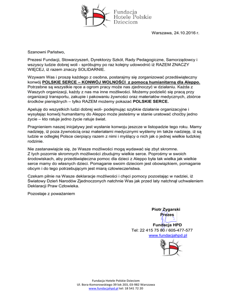 Warszawa, 24.10.2016 r. Szanowni Państwo, Prezesi Fundacji, Stowarzyszeń, Dyrektorzy Szkół, Rady Pedagogiczne, Samorządowcy i wszyscy ludzie dobrej woli - spróbujmy po raz kolejny udowodnić iż RAZEM ZNACZY WIĘCEJ, iż razem znaczy SOLIDARNIE. Wzywam Was i proszę każdego z osobna, postarajmy się zorganizować przedświąteczny konwój POLSKIE SERCE – KONWÓJ WOLNOŚCI z pomocą humianitarną dla Aleppo. Potrzebne są wszystkie ręce a ogrom pracy może nas zjednoczyć w działaniu. Każda z Waszych organizacji, każdy z nas ma inne możliwości. Możemy podzielić się pracą przy organizacji transportu, zakupie i pakowaniu żywności oraz materiałów medycznych, zbiórce środków pieniężnych – tylko RAZEM możemy pokazać POLSKIE SERCE. Apeluję do wszystkich ludzi dobrej woli- podejmując szybkie działanie organizacyjne i wysyłając konwój humanitarny do Aleppo może jesteśmy w stanie uratować choćby jedno życie – kto ratuje jedno życie ratuje świat. Pragnieniem naszej inicjatywy jest wysłanie konwoju jeszcze w listopadzie tego roku. Mamy nadzieję, iż poza żywnością oraz materiałami medycznymi wyślemy im także nadzieję, iż są ludzie w odległej Polsce cierpiący razem z nimi i myślący o nich jak o jednej wielkie ludzkiej rodzinie. Nie zastanawiajcie się, że Wasze możliwości mogą wydawać się zbyt skromne. Z tych pozornie skromnych możliwości zbudujmy wielkie serce. Poprośmy w swoich środowiskach, aby przedświąteczna pomoc dla dzieci z Aleppo była tak wielka jak wielkie serce mamy do własnych dzieci. Pomaganie swoim dzieciom jest obowiązkiem, pomaganie obcym i do tego potrzebującym jest miarą człowieczeństwa. Czekam pilnie na Wasze deklaracje możliwości i chęci pomocy pozostając w nadziei, iż Światowy Dzień Narodów Zjednoczonych natchnie Was jak przed laty natchnął uchwaleniem Deklaracji Praw Człowieka. Pozostaje z poważaniem Piotr Zygarski Prezes Fundacja HPD Tel: 22 415 75 80 / 605-477-577 www.fundacjahpd.pl Fundacja Hotele Polskie Dzieciom Ul. Bora-Komorowskiego 39 lok 203, 03-982 Warszawa www.fundacjahpd.pl tel: 18 541 72 20