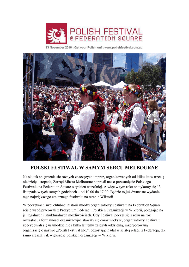POLSKI FESTIWAL W SAMYM SERCU MELBOURNE Na skutek spiętrzenia się różnych znaczących imprez, organizowanych od kilku lat w trzecią niedzielę listopada, Zarząd Miasta Melbourne poprosił nas o przesunięcie Polskiego Festiwalu na Federation Square o tydzień wcześniej. A więc w tym roku spotykamy się 13 listopada w tych samych godzinach – od 10.00 do 17.00. Będzie to już dwunaste wydanie tego największego etnicznego festiwalu na terenie Wiktorii. W początkach swej chlubnej historii młodzi organizatorzy Festiwalu na Federation Square ściśle współpracowali z Prezydium Federacji Polskich Organizacji w Wiktorii, polegając na jej legalnych i strukturalnych możliwościach. Gdy Festiwal począł się z roku na rok rozrastać, a formalności organizacyjne stawały się coraz większe, organizatorzy Festiwalu zdecydowali się usamodzielnić i kilka lat temu założyli oddzielną, inkorporowaną organizację o nazwie „Polish Festival Inc.”, pozostając nadal w ścisłej relacji z Federacją, tak samo zresztą, jak większość polskich organizacji w Wiktorii. W tym roku funkcję prezesa pełni Aleks Terech, sekretariatem zarządza Monika Paszkiewicz, a finansami Joanna Merwart. Kierownikiem artystycznym jest Iga Bajer, a wspiera ją Grzegorz Machnacki. Stoiskami zarządza Irena Łobaza. Wszelkie Festiwalowe publikacje i odnowioną witrynę przejęła Katarzyna Koło, marketing i reklamy Dominika Sikorska, „Kidstop” przygotowuje Kasia Lisaj, oficjalnymi gośćmi zajmie się Kasia Bebejewska, specjalnymi poruczeniami Kasia Czyrek, a duchowo wspiera ich ks. Wiesław Słowik. Festiwalowa organizacyjna kuchnia pracuje bez wytchnienia. Zanosi się ponownie na niezwykłą ucztę. Na głównym placu rozłoży się blisko 30 różnych atrakcyjnych stoisk oferując wielkie bogactwo różnych polskich wyrobów, biżuterii, publikacji, pamiątek i informacji. Nad Yarrą 10 stoisk gastronomicznych serwować będzie polskie smaki. Nie zabraknie i w tym roku tradycyjnej Karczmy z polskim piwem. Na głównej estradzie przed południem zobaczymy dzieci polskich szkół sobotnich, a potem zespoły folklorystyczne. „Polonez”, „Łowicz” i „Łowiczaki” z Melbourne oraz „Tatry” z Adelaide i „Syrenka” z Sydney przykuwać będą uwagę przechodniów kolorami ludowych strojów, mozaiką tańców i żywiołową muzyką ludową. Bardzo ciekawie zapowiada się program artystyczny, przygotowywany w koncertowej sali Deakin Edge na Federation Square. Czego tam nie będzie! Wymienię tylko paru artystów, którzy na pewno warci są obejrzenia i posłuchania. Ceniony w Polsce artysta Artur Gotz zaprasza dzieci na specjalny program, a potem wraz z towarzyszącym mu zespołem pokłoni się Polsce na jej Święto Niepodległości. Znanej w Australii aktorce, Marcie Kaczmarek, do poezji i pieśni akompaniował będzie Konrad Olszewski. Zofia i Małgosia Kaszubskie poprowadzą nas w kwadransie patriotycznej piosenki z okazji narodowego święta. Laureat Konkursu Chopinowskiego, Kataro Nagano, zaprezentuje mistrzowskie wykonanie muzyki Chopina. Wystąpi z nim ulubienica polskiej publiczności, Jolanta Mielczarek. Klara Rawdanowicz z młodzieżową rockową kapelą i Victor Janisiow z muzyką w stylu reggae/pop zainteresują zapewne naszą młodzież. Znajdzie się też miejsce dla młodych pianistów z Towarzystwem im. Fryderyka Chopina oraz dla chóru „Syrena”. Dla wielu uczestników Polskiego Festiwalu będzie to zapewne miejsce bogatych duchowych i artystycznych wzruszeń, przeżywanych w komforcie klimatyzacji i z dala od nagrzanej słońcem ceramiki festiwalowego placu. W Deakin Edge można będzie wygodnie usiąść, a wszystkie prezentowane w nim atrakcje będą bezpłatne. Nadzwyczajną niespodzianką tegorocznego Festiwalu będzie gościnny występ przybyłej z Polski góralskiej kapeli o nazwie „Corny Potok”. Temu to zespołowi, liczącemu sześcioro artystów rodem z Beskidu Śląskiego, powierzają organizatorzy oficjalne zakończenie Festiwalu na Federation Square. Cierpliwi uczestnicy mogą się spodziewać żywiołowej, porywającej do tańca muzyki. Każdego roku w dniu 11 listopada Polacy na całym świecie obchodzą swoje święto, Święto Niepodległości, upamiętniające zakończenie przeszło stuletniej zaborczej niewoli. Festiwal na Federation Square da nam okazję do radosnego świętowania naszej polskiej obecności na antypodach. Ambasador Rzeczpospolitej, Jego Ekscelencja Paweł Milewski, ponownie przyjął rolę oficjalnego Patrona Festiwalu i usłyszymy go o godzinie 13.00 podczas oficjalnego otwarcia. W ceremonii otwarcia wystąpią także przedstawiciele Wiktoriańskiego Rządu Stanowego, Samorządowych władz miasta Melbourne oraz Prezydium Federacji Polskich Organizacji w Wiktorii. Polski Festiwal na Federation Square otwarty jest dla wszystkich. Nie trzeba kart wstępu, ani specjalnych zaproszeń. Każdy, kto czuje się Polakiem, kto nam dobrze życzy, albo chciałby w samym centrum Melbourne zabawić się po polsku, będzie mile widziany i na pewno się nie zawiedzie. Do zobaczenia na Federation Square! Remigiusz Kędra