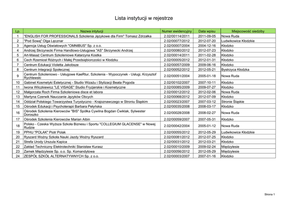 Lista instytucji w rejestrze Lp. 1 2 3 4 5 6 7 8 9 10 11 12 13 14 15 16 17 18 19 20 21 22 23 24 Nazwa intytucji "ENGLISH FOR PROFESSIONALS Szkolenia Językowe dla Firm" Tomasz Zdrzałka "Pod Sową" Olga Lęcznar Agencja Usług Oświatowych "OMNIBUS" Sp. z o.o. Andrzej Skrzynecki Firma Handlowo-Usługowa "AS" Skrzynecki Andrzej Art-Masaż Centrum Szkoleniowe Katarzyna Kostka Cech Rzemiosł Różnych i Małej Przedsiębiorczości w Kłodzku Centrum Edukacji Violetta Jakobsze Centrum Integracji Społecznej Centrum Szkoleniowo - Usługowe KaeRtur, Szkolenia - Wypoczynek - Usługi, Krzysztof Rychlewski Gabinet Kosmetyki Estetycznej - Studio Wizażu i Stylizacji Beata Pogoda Iwona Wilczkiewicz "LE VISAGE" Studio Fryzjerskie i Kosmetyczne Małgorzata Roch Firma Szkoleniowa disce et labora Martyna Czerwik Nauczanie Języków Obcych Oddział Polskiego Towarzystwa Turystyczno - Krajoznawczego w Stroniu Śląskim Ośrodek Edukacji i Psychoterapii Barbara Pełyńska Ośrodek Szkolenia Kierowców "BIS" Spółka Cywilna Bogdan Ćwiklak, Sylwester Doroszko Ośrodek Szkolenia Kierowców Marian Aibin Polsko - Czeska Wyższa Szkoła Biznesu i Sportu "COLLEGIUM GLACENSE" w Nowej Rudzie PPHU "POLAK" Piotr Polak Ryszard Woźny Szkoła Nauki Jazdy Woźny Ryszard Strefa Urody Urszula Kapica Zakład Techniczny Elektrotechniki Stanisław Kurasz Zamek Międzylesie Sp. o.o. Sp. Komandytowa ZESPÓŁ SZKÓŁ ALTERNATYWNYCH Sp. z o.o. Numer ewidencyjny 2.02/00114/2011 2.02/00077/2012 2.02/00007/2004 2.02/00080/2012 2.02/00014/2011 2.02/00005/2012 2.02/00057/2009 2.02/00052/2012 Data wpisu 2011-09-05 2012-07-20 2004-12-16 2012-07-23 2011-02-28 2012-01-31 2009-06-16 2012-05-21 Miejscowość siedziby Nowa Ruda Ludwikowice Kłodzkie Kłodzko Kłodzko Kłodzko Kłodzko Kłodzko Bystrzyca Kłodzka 2.02/00051/2004 2005-01-18 Nowa Ruda 2.02/00102/2007 2.02/00085/2009 2.02/00012/2012 2.02/00068/2012 2.02/00023/2007 2.02/00035/2008 2007-10-11 2009-07-27 2012-02-06 2012-07-09 2007-03-12 2008-03-17 Kłodzko Kłodzko Nowa Ruda Kłodzko Stronie Śląskie Kłodzko 2.02/00028/2008 2008-02-27 Nowa Ruda 2.02/00059/2007 2007-05-31 Kłodzko 2.02/00042/2004 2005-01-12 Nowa Ruda 2.02/00055/2012 2.02/00081/2012 2.02/00031/2012 2.02/00010/2009 2.02/00056/2012 2.02/00003/2007 2012-05-29 2012-07-25 2012-03-21 2009-02-24 2012-05-29 2007-01-16 Ludwikowice Kłodzkie Kłodzko Kłodzko Międzylesie Międzylesie Kłodzko Strona 1