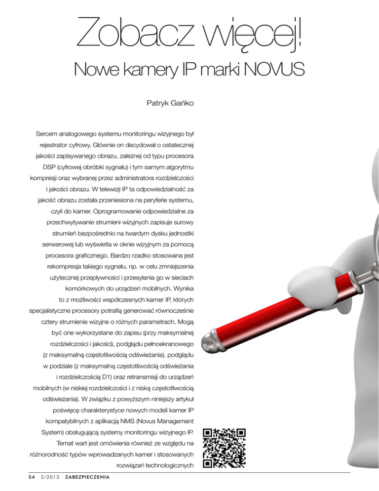 Zobacz więcej! Nowe kamery IP marki NOVUS Patryk Gańko Sercem analogowego systemu monitoringu wizyjnego był rejestrator cyfrowy. Głównie on decydował o ostatecznej jakości zapisywanego obrazu, zależnej od typu procesora DSP (cyfrowej obróbki sygnału) i tym samym algorytmu kompresji oraz wybranej przez administratora rozdzielczości i jakości obrazu. W telewizji IP ta odpowiedzialność za jakość obrazu została przeniesiona na peryferie systemu, czyli do kamer. Oprogramowanie odpowiedzialne za przechwytywanie strumieni wizyjnych zapisuje surowy strumień bezpośrednio na twardym dysku jednostki serwerowej lub wyświetla w oknie wizyjnym za pomocą procesora graficznego. Bardzo rzadko stosowana jest rekompresja takiego sygnału, np. w celu zmniejszenia użytecznej przepływności i przesyłania go w sieciach komórkowych do urządzeń mobilnych. Wynika to z możliwości współczesnych kamer IP, których specjalistyczne procesory potrafią generować równocześnie cztery strumienie wizyjne o różnych parametrach. Mogą być one wykorzystane do zapisu (przy maksymalnej rozdzielczości i jakości), podglądu pełnoekranowego (z maksymalną częstotliwością odświeżania), podglądu w podziale (z maksymalną częstotliwością odświeżania i rozdzielczością D1) oraz retransmisji do urządzeń mobilnych (w niskiej rozdzielczości i z niską częstotliwością odświeżania). W związku z powyższym niniejszy artykuł poświęcę charakterystyce nowych modeli kamer IP kompatybilnych z aplikacją NMS (Novus Management System) obsługującą systemy monitoringu wizyjnego IP. Temat wart jest omówienia również ze względu na różnorodność typów wprowadzanych kamer i stosowanych rozwiązań technologicznych 54 2/2013 ZABEZPIECZENIA Fot. 1. Kamera kopułkowa NVIP-5DN2021D/IR-2P CMOS (5 megapikseli) o rozmiarze 1/2,5" i progresywnego skanowania. Należy pamiętać, że ze względu na brak możliwości ustawienia pola widzenia (stała ogniskowa) całkowita rozdzielczość przetwornika rozkłada się na duży obszar. Są cztery tryby wyświetlania strumienia wizyjnego: rybie oko, standardowy, podwójna panorama oraz quad. Dla trybów tych dostępna jest funkcja cyfrowego PTZ umożliwiająca przemieszczanie powiększonego fragmentu obrazu, podobnie jak w typowych kamerach PTZ. O dostępnych w aplikacji NMS trybach wyświetlania oraz sposobach odtwarzania powyższego strumienia napiszę w kolejnym numerze Zabezpieczeń. Kompaktowa kamera NVIP-5DN5001C-1P Jest to druga z serii kamer o rozdzielczości przetwornika CMOS 5 megapikseli, wytwarzająca obraz w formacie 4:3 – kamera klasyczna o funkcjach zbliżonych do funkcji kamery Full HD NVIP-2DN5001C-1P przedstawianej już na łamach tego czasopisma. Kamera jest przeznaczona do pracy w trudnych warunkach oświetleniowych. W trybie czarno-białym, bez funkcji wydłużonej migawki jej czułość wynosi 0,02 lx. W najwyższej dostępnej rozdzielczości 2592×1944 kamera generuje do 10 obrazów na sekundę, a w pozostałych rozdzielczościach, także w rozdzielczości FullHD, kamera generuje 25 obrazów na sekundę na żywo. Nową godną uwagi funkcją jest ROI (Region of Interest). Dzięki niej można zaznaczyć fragment obrazu, który będzie następnie powiększony/rozciągnięty i utożsamiony z wybranym strumieniem. Kamery mają tryb automatyki ekspozycji z automatycznie regulowanym czasem otwarcia migawki i ustawianym przez administratora progiem. Umożliwia to uzyskanie klarownego obrazu szybko przemieszczających się obiektów w trudnych warunkach oświetleniowych. W menu sabotaż można ustalić reakcje kamery na jej zasłonięcie lub zaślepienie. Fot. 2. Tryb podwójnej panoramy ZABEZPIECZENIA 2/2013 55 ARTYKU£ SPONSOROWANY Wśród instalatorów kamera jest nazywana rybim okiem (ang. fish-eye). Nazwę tę zawdzięcza możliwości dookolnej obserwacji dzięki zastosowanemu obiektywowi o długości ogniskowej f=1,05 mm. Kamera świetnie nadaje się do monitorowania dużych zamkniętych pomieszczeń, holi, recepcji etc. Jedna centralnie umieszczona kamera może monitorować całą przestrzeń pomieszczenia. Wysoka jakość generowanego strumienia i związana z nią zdolność do rozpoznawania szczegółów wynika z rozdzielczości zastosowanej matrycy TELEWIZJA DOZOROWA Kamera kopułkowa NVIP-5DN2021D/IR-2P TELEWIZJA DOZOROWA ARTYKU£ SPONSOROWANY Fot. 3. Kompaktowa kamera NVIP-5DN5001C-1P Fot. 5. K Kompaktowa kt kkamera motor-zoom t NVIP NVIP-2DN5018CZ-2P 2DN5018CZ Wandaloodporna kamera NVIP-3DN4010H/IRH-1P W poprzednim numerze Zabezpieczeń scharakteryzowałem system sieciowego monitoringu wizyjnego ipGO. Zwracałem uwagę na jego hermetyczność i autonomiczność. W takim systemie nadal mogą pracować jedynie urządzenia z rodziny ipGO, jednak wszystkie kamery są teraz zgodne z systemem NMS w wersji 1.25. Kamery NVIP-2C2001D-P/GO oraz NVIP-2C5005CZ-P/GO zostały opisane w poprzednim artykule. Poniżej chciałbym scharakteryzować trzy nowe modele kamer z rodziny ipGO. Jest to druga w ofercie 3-megapikselowa kamera marki NOVUS wytwarzająca obraz o proporcjach 4:3. Maksymalna dostępna rozdzielczość strumienia wizyjnego wynosi 2048×1536 przy częstotliwości odświeżania 15 obrazów na sekundę, niezależnej od rozdzielczości. Wbudowany asferyczny obiektyw o zmiennej ogniskowej, regulowanej w zakresie od 3 do 10 mm, zapewnia poziomy kąt widzenia w zakresie 28°~90°. Promiennik podczerwieni ma zasięg do 40 m. Kamera pracuje w trybie trójstrumieniowym. Istnieje możliwość definiowania kompresji, rozdzielczości, prędkości i jakości niezależnie dla każdego strumienia. Do montażu ściennego kamery stosowany jest uchwyt z puszką przyłączeniową w podstawie, która służy do instalacji zasilacza i realizacji połączeń kablowych. Puszka przyłączeniowa i podstawa kopuły montażowej są zamocowane na zawiasach, co umożliwia łatwy montaż kabli i akcesoriów. Kompaktowa kamera motor-zoom NVIP-2DN5018