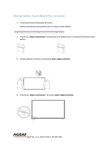 Montaż tablicy Touch Board Plus na ścianie. 1. Przymocuj listwę montażową do ściany (listwa montażowa zamocowana jest na tylnej ścianie tablicy) 2. Przymocuj „klipsy montażowe” (za pomocą śrub dołączonych w zestawie) do dolnej części tablicy. 3. Powieś tablicę na listwie montażowej (patrz zdjęcie poniżej) 4. Przymocuj „klipsy montażowe” do ściany (patrz zdjęcie poniżej). Agraf Sp. z o.o. Nowe Sady 2, 94-102 Łódź