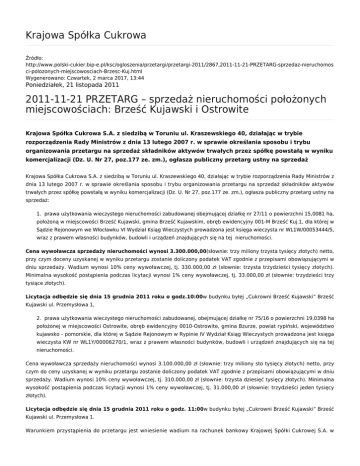 Krajowa Spółka Cukrowa Źródło: http://www.polski-cukier.bip-e.pl/ksc/ogloszenia/przetargi/przetargi-2011/2867,2011-11-21-PRZETARG-sprzedaz-nieruchomos ci-polozonych-miejscowosciach-Brzesc-Kuj.html Wygenerowano: Czwartek, 2 marca 2017, 13:44 Poniedziałek, 21 listopada 2011 2011-11-21 PRZETARG – sprzedaż nieruchomości położonych miejscowościach: Brześć Kujawski i Ostrowite Krajowa Spółka Cukrowa S.A. z siedzibą w Toruniu ul. Kraszewskiego 40, działając w trybie rozporządzenia Rady Ministrów z dnia 13 lutego 2007 r. w sprawie określania sposobu i trybu organizowania przetargu na sprzedaż składników aktywów trwałych przez spółkę powstałą w wyniku komercjalizacji (Dz. U. Nr 27, poz.177 ze. zm.), ogłasza publiczny przetarg ustny na sprzedaż Krajowa Spółka Cukrowa S.A. z siedzibą w Toruniu ul. Kraszewskiego 40, działając w trybie rozporządzenia Rady Ministrów z dnia 13 lutego 2007 r. w sprawie określania sposobu i trybu organizowania przetargu na sprzedaż składników aktywów trwałych przez spółkę powstałą w wyniku komercjalizacji (Dz. U. Nr 27, poz.177 ze. zm.), ogłasza publiczny przetarg ustny na sprzedaż: 1. prawa użytkowania wieczystego nieruchomości zabudowanej obejmującej działkę nr 27/11 o powierzchni 15,0081 ha, położoną w miejscowości Brześć Kujawski, gmina Brześć Kujawskim, obręb ewidencyjny 001-M Brześć Kuj.1, dla której w Sądzie Rejonowym we Włocławku VI Wydział Ksiąg Wieczystych prowadzona jest księga wieczysta nr WL1W/00053444/5, wraz z prawem własności budynków, budowli i urządzeń znajdujących się na tej nieruchomości. Cena wywoławcza sprzedaży nieruchomości wynosi 3.300.000,00(słownie: trzy miliony trzysta tysięcy złotych) netto, przy czym doceny uzyskanej w wyniku przetargu zostanie doliczony podatek VAT zgodnie z przepisami obowiązującymi w dniu sprzedaży. Wadium wynosi 10% ceny wywoławczej, tj. 330.000,00 zł (słownie: trzysta trzydzieści tysięcy złotych). Minimalna wysokość postąpienia podczas licytacji wynosi 1% ceny wywoławczej, tj. 33.000,00 zł (słownie: trzydzieści trzy tysiące złotych). Licytacja odbędzie się dnia 15 grudnia 2011 roku o godz.10:00w budynku byłej „Cukrowni Brześć Kujawski” Brześć Kujawski ul. Przemysłowa 1, 2. prawa użytkowania wieczystego nieruchomości zabudowanej, obejmującej działkę nr 75/16 o powierzchni 19,0398 ha położonej w miejscowości Ostrowite, obręb ewidencyjny 0010-Ostrowite, gmina Bzurze, powiat rypiński, województwo kujawsko - pomorskie, dla której w Sądzie Rejonowym w Rypinie IV Wydział Ksiąg Wieczystych prowadzona jest księga wieczysta KW nr WL1Y/00006270/1, wraz z prawem własności budynków, budowli i urządzeń znajdujących się na tej nieruchomości. Cena wywoławcza sprzedaży nieruchomości wynosi 3.100.000,00 zł (słownie: trzy miliony sto tysięcy złotych) netto, przy czym do ceny uzyskanej w wyniku przetargu zostanie doliczony podatek VAT zgodnie z przepisami obowiązującymi w dniu sprzedaży. Wadium wynosi 10% ceny wywoławczej, tj. 310.000,00 zł (słownie: trzysta dziesięć tysięcy złotych). Minimalna wysokość postąpienia podczas licytacji wynosi 1% ceny wywoławczej, tj. 31.000,00 zł (słownie: trzydzieści jeden tysięcy złotych). Licytacja odbędzie się dnia 15 grudnia 2011 roku o godz. 11:00w budynku byłej „Cukrowni Brześć Kujawski” Brześć Kujawski ul. Przemysłowa 1. Warunkiem przystąpienia do przetargu jest wniesienie wadium na rachunek bankowy Krajowej Spółki Cukrowej S.A. w Toruniu, bank BGŻ S.A. numer konta bankowego 98 2030 0045 1110 0000 0064 7950 w terminie do dnia 12.12.2011 r. z dopiskiem „wadium – nieruchomość położona w miejscowości: Brześć Kujawski, Ostrowite stanowiąca działkę nr … o pow. …ha ”. Za datę wniesienia wadium uważa się dzień wpływu kwoty wadium na wyżej wskazany rachunek. Wadium nie podlega oprocentowaniu W celu przystąpienia do licytacji oferent zobowiązany jest do przedstawienia Komisji Przetargowej oryginał dowodu wpłaty wadium oraz do podpisania oświadczenia o zapoznaniu się ze stanem faktycznym i prawnym przedmiotu licytacji oraz warunkami licytacji jak również oświadczenia, iż nie wnosi on żadnych zastrzeżeń, co do warunków licytacji. Osoby biorące udział w licytacji powinny posiadać: - aktualny wypis z rejestru przedsiębiorstw lub ewidencji podmiotów gospodarczych, - zaświadczenie o numerze REGON i decyzję o nadaniu numeru NIP, - oryginał pełnomocnictwa do reprezentowania uczestnika przetargu - oraz inne dokumenty potwierdzające tożsamość osoby. Ponadto osoba fizyczna będąca w związku małżeńskim obowiązana jest wskazać czy występuje w imieniu własnym, czy też zamierza nabyć w imieniu swoim i małżonka na majątek wspólny i wówczas obowiązana jest przedstawić zgodę drugiego małżonka na zakup nieruchomości bądź umowę o rozdzielności majątkowej. Cudzoziemcy mogą nabyć nieruchomość w wyniku niniejszego przetargu po spełnieniu warunków określonych w ustawie z dnia 24 marca 1920 r. o nabywaniu nieruchomości przez cudzoziemców (Dz. U. z 2004 roku Nr 167, poz. 1758 ze zm.). Dodatkowo każdy oferent powinien złożyć oświadczenie w trybie § 6 Rozporządzenia Rady Ministrów z 13 lutego 2007 roku w sprawie określenia sposobu i trybu organizowania przetargu na sprzedaż składników aktywów trwałych przez spółkę, powstałą w wyniku komercjalizacji (Dz. U. z 2007 r., Nr 27, poz. 177 ze zm.). Stawienie się jednego uczestnika licytacji wystarcza do odbycia się licytacji. Sprzedaż nastąpi na rzecz uczestnika licytacji, który zaoferuje najwyższą cenę. Nabywca będzie zobowiązany do zapłaty ceny nabycia najpóźniej na dzień przed podpisaniem umowy w formie aktu notarialnego. O terminie podpisania aktu notarialnego nabywca zostanie powiadomiony pisemnie. Wydanie przedmiotu sprzedaży nabywcy nastąpi nie wcześniej niż po zawarciu umowy w f