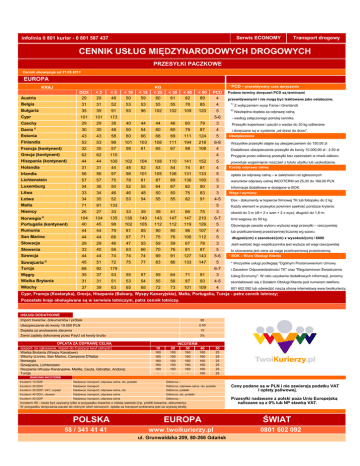 Serwis ECONOMY infolinia 0 801 kurier - 0 801 587 437 Transport drogowy CENNIK USŁUG MIĘDZYNARODOWYCH DROGOWYCH PRZESYŁKI PACZKOWE Cennik obowiązuje od 21.05.2013 EUROPA KRAJ * PCD – przewidywany czas doręczenia Austria DOX 29 <2 29 <5 48 < 10 50 < 15 59 KG < 25 60 < 30 61 < 40 82 < 50 89 PCD 4 Belgia 31 31 52 53 53 55 55 78 85 4 1) Z wyłączeniem wysp Faroe i Grenlandii Bułgaria 35 39 91 93 96 102 102 109 120 5 2) Niezbędna dopłata za odprawę celną Cypr 101 101 173 Czechy 29 29 38 40 44 44 46 60 79 3 Dania 1) Estonia 30 30 48 50 54 60 60 79 87 4 43 43 58 60 66 68 69 111 124 5 Finlandia 53 53 98 101 103 108 111 194 218 6-8 Francja (kontynent) 32 35 57 58 61 65 67 98 108 4 Dodatkowe ubezpieczenie przesyłki do kwoty 10.000,00 zł - 2,50 zł Grecja (kontynent) 62 62 110 4 Przyjęcie przez odbiorcę przesyłki bez zastrzeżeń w chwili odbioru Hiszpania (kontynent) 44 44 100 102 104 108 110 141 152 5 Holandia 31 31 44 48 52 53 54 74 81 4 Irlandia 56 56 97 98 101 105 106 131 133 5 opłata za odprawę celną – w zależności od zgłoszonych Lichtenstein 57 57 75 78 81 87 89 136 150 5 warunków odprawy celnej INCOTERM od 25,00 do 160,00 PLN Luxemburg 34 36 50 52 55 64 67 82 90 3 Litwa 33 34 46 46 48 50 50 75 83 3 Łotwa 34 35 52 53 54 55 55 82 91 4-5 Malta 71 91 133 Niemcy 26 27 33 33 39 39 41 66 Norwegia 2) Portugalia (kontynent) 104 104 135 138 140 143 147 40 45 98 102 105 112 Rumunia 44 44 79 81 85 San Marino 44 44 66 67 Słowacja 29 29 46 Słowenia 33 40 Szwecja 44 44 Szwajcaria 2) Turcja 45 68 Węgry 5-6 Podane terminy doręczeń PCD są terminami przewidywanymi i nie mogą być traktowane jako ostateczne. - według załączonego poniżej cennika Przesyłki kopertowe i paczki o wadze do 30 kg odbierane i doręczane są w systemie „od drzwi do drzwi”. Ubezpieczenie Wszystkie przesyłki objęte są ubezpieczeniem do 150,00 zł powoduje wygaśnięcie roszczeń z tytułu ubytku lub uszkodzenia. Koszty odprawy celnej Informacje dodatkowe w dostępne w BOK. Waga i wymiary: Dox - dokumenty w kopercie firmowej TK lub foliopaku do 2 kg 5 Każdy element w przesyłce powinien spełniać poniższe kryteria: 75 3 obwód do 3 m (dł.+ 2 x szer.+ 2 x wys); długość do 1,8 m; 147 210 6-7 112 119 126 5 Obowiązuje zasada wyboru wyższej wagi przesyłki – rzeczywistej 90 90 96 107 4 lub przeliczeniowej przestrzennej liczonej wg wzoru: 71 75 76 106 112 5 długość(cm) x szerokość(cm) x wysokość(cm) / 6000 47 55 59 59 67 78 3 Jeśli wartość tego współczynnika jest wyższa od wagi rzeczywistej 56 63 66 70 76 81 87 5 74 74 74 89 91 127 143 5-6 51 72 75 77 83 86 133 147 92 179 35 37 53 55 57 59 64 71 Wielka Brytania 31 31 51 53 54 55 56 Włochy 37 39 63 65 68 72 73 5 limit wagowy do 50 kg. to stosowana jest cena za wagę przeliczeniową przestrzenną. * BOK – Biuro Obsługi Klienta * Wszystkie usługi podlegają "Ogólnym Postanowieniom Umowy 6-7 i Zasadom Odpowiedzialności TK" oraz "Regulaminowi Świadczenia 91 3 Usług Economy". W celu uzyskania dodatkowych informacji, prosimy 87 93 4-5 101 109 4 skontaktować się z Działem Obsługi Klienta pod numerem telefonu 801 602 092 lub odwiedzić naszą stronę internetową www.twoikurierzy.pl. Cypr, Francja (Kostaryka), Grecja, Hiszpania (Baleary, Wyspy Kanaryjskie), Malta, Portugalia, Turcja - patrz cennik lotniczy; Pozostałe kraje obsługiwane są w serwisie lotniczym, patrz cennik lotniczy. USŁUGI DODATKOWE Import towarów, dokumentów i próbek 80 Ubezpieczenie do kwoty 10.000 PLN 2.50 Dopłata za anulowanie zlecenia 10 Zwrot zapłaty dokonanej przez PayU od kwoty brutto 3% OPŁATA ZA ODPRAWĘ CELNĄ (export- za zgłoszenie, import do 5 pozycji taryf celnych) Wielka Brytania (Wyspy Kanałowe) Włochy (Livinio, San Marino, Campione D'Italia) Norwegia Szwajcaria, Lichtenstain Hiszpania (Wyspy Kanaryjskie, Melilla, Ceuta, Gibraltar, Andora) Turcja 10 20 160 160 160 160 160 - 100 100 100 100 100 - INCOTERM 30 40 160 160 160 160 160 - 160 160 160 160 160 160 50 25 25 25 25 25 25 WARUNKI INCOTERM Incoterm 10 DDP Nadawca: transport, odprawa celna, cło, podatki Odbiorca : - Incoterm 20 DDU Nadawca: transport Odbiorca: odprawa celna, cło, podatki Incoterm 30 DDP, VAT, unpaid Nadawca: transport, odprawa celna, cło Odbiorca: podatki Incoterm 40 DDU, cleared Nadawca: transport, odprawa celna Odbiorca: cło, podatki Incoterm 50 DDP Nadawca: transport, odprawa celna Odbiorca: - Incoterm 50 - może być używany tylko w przypadku towarów o niskiej wartości (np. próbki towarów, dokumenty). W przypadku doręczania paczki do różnych stref cenowych, opłata za transport pobierana jest za wyższą strefę. POLSKA 58 / 341 41 41 EUROPA www.twoikurierzy.pl ul. Grunwaldzka 209, 80-266 Gdańsk Ceny podane są w PLN i nie zawierają podatku VAT i opłaty paliwowej. Przesyłki nadawane z polski poza Unię Europejską naliczane są z 0% lub NP stawką VAT. ŚWIAT 0801 602 092