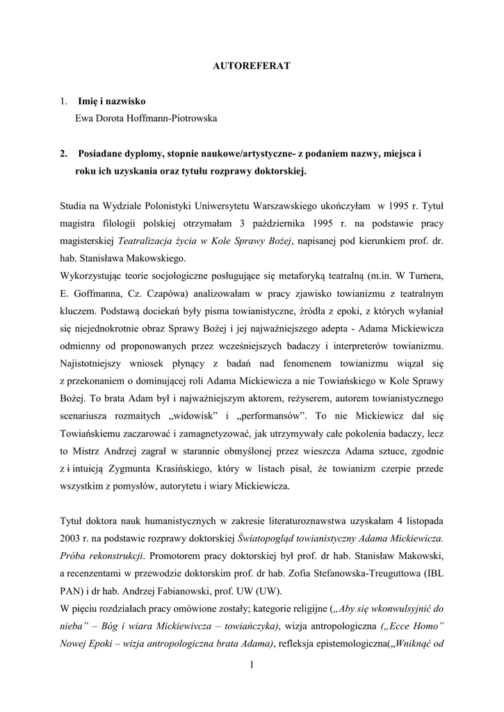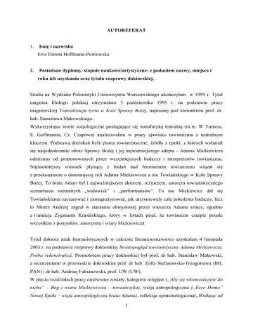 AUTOREFERAT 1. Imię i nazwisko Ewa Dorota Hoffmann-Piotrowska 2. Posiadane dyplomy, stopnie naukowe/artystyczne- z podaniem nazwy, miejsca i roku ich uzyskania oraz tytułu rozprawy doktorskiej. Studia na Wydziale Polonistyki Uniwersytetu Warszawskiego ukończyłam w 1995 r. Tytuł magistra filologii polskiej otrzymałam 3 października 1995 r. na podstawie pracy magisterskiej Teatralizacja życia w Kole Sprawy Bożej, napisanej pod kierunkiem prof. dr. hab. Stanisława Makowskiego. Wykorzystując teorie socjologiczne posługujące się metaforyką teatralną (m.in. W Turnera, E. Goffmanna, Cz. Czapówa) analizowałam w pracy zjawisko towianizmu z teatralnym kluczem. Podstawą dociekań były pisma towianistyczne, źródła z epoki, z których wyłaniał się niejednokrotnie obraz Sprawy Bożej i jej najważniejszego adepta - Adama Mickiewicza odmienny od proponowanych przez wcześniejszych badaczy i interpreterów towianizmu. Najistotniejszy wniosek płynący z badań nad fenomenem towianizmu wiązał się z przekonaniem o dominującej roli Adama Mickiewicza a nie Towiańskiego w Kole Sprawy Bożej. To brata Adam był i najważniejszym aktorem, reżyserem, autorem towianistycznego scenariusza rozmaitych „widowisk” i „performansów”. To nie Mickiewicz dał się Towiańskiemu zaczarować i zamagnetyzować, jak utrzymywały całe pokolenia badaczy, lecz to Mistrz Andrzej zagrał w starannie obmyślonej przez wieszcza Adama sztuce, zgodnie z i intuicją Zygmunta Krasińskiego, który w listach pisał, że towianizm czerpie przede wszystkim z pomysłów, autorytetu i wiary Mickiewicza. Tytuł doktora nauk humanistycznych w zakresie literaturoznawstwa uzyskałam 4 listopada 2003 r. na podstawie rozprawy doktorskiej Światopogląd towianistyczny Adama Mickiewicza. Próba rekonstrukcji. Promotorem pracy doktorskiej był prof. dr hab. Stanisław Makowski, a recenzentami w przewodzie doktorskim prof. dr hab. Zofia Stefanowska-Treuguttowa (IBL PAN) i dr hab. Andrzej Fabianowski, prof. UW (UW). W pięciu rozdziałach pracy omówione zostały; kategorie religijne („Aby się wkonwulsyjnić do nieba” – Bóg i wiara Mickiewivcza – towiańczyka), wizja antropologiczna („Ecce Homo” Nowej Epoki – wizja antropologiczna brata Adama), refleksja epistemologiczna(„Wniknąć od 1 razu aż w głąb istnienia rzeczy…” Refleksja epistemologiczna poety – towiańczyka) i stosunek do spraw narodowych brata Adama („Powołaniem moim jest trzymać nić polską…”- Mickiewicz – towiańczyk o narodzie, historii, ojczyźnie). Ostatni rozdział przedstawiał koncepcję poezji nowej epoki („Opiewać myśl Bożą…” Koncepcja poezji przemienionego wieszcza). Rozdziały rekonstruujące myśl Mickiewiczowską poprzedza część polemiczna (Czy Mickiewicz „dał wiarę” Towiańskiemu?) wobec dominujących i utrwalonych w mickiewiczologii przekonań o momentalności towianistycznego przełomu w biografii poety, który stanowił w niej wyrazistą cezurę (epoka słowa a epoka czynu). Praca ma charakter źródłowy – odwołuje się właściwie do większości różnorodnych gatunkowo wypowiedzi poety z ostatnich czternastu lat jego życia. Rekonstrukcja myśli mickiewiczowskiej z tego okresu prowadzi do wniosku najważniejszego, że poglądy autora Dziadów po spotkaniu z Towiańskim nie uległy zasadniczej zmianie, a jedynie ewolucji. Towianizm Mickiewicza był zjawiskiem szczególnym, a poglądów poety z lat czterdziestych nie można wprost utożsamiać z treściami głoszonymi przez Towiańskiego. Mickiewicz stworzył swój własny i wyrazisty światopogląd, który uznać możemy za dojrzałą, koherentną, całościową romantyczną wizję człowieka, Boga, historii wbrew narracjom o towianizmie jako okresie „błędów i wypaczeń” Mickiewiczowskiej myśli. Jej źródeł szukać należy nie tyle w miałkich i niejasnych ideach Towiańskiego, ile w szeroko rozumianej wcześniejszej twórczości poety. 3. Informacje o dotychczasowym zatrudnieniu w jednostkach naukowych/artystycznych W 1994 r. (na V roku studiów) podjęłam pracę nauczycielki języka polskiego w XLI Liceum Ogólnokształcącym im. Joachima Lelewela w Warszawie. Pracę tą prowadziłam do podjęcia studiów doktoranckich w roku 1999 r. Od października 1999 r. do października 2003 r. – studia doktoranckie na Wydziale Polonistyki UW W latach 2004-2009 współpracowałam z Męskim Liceum Ogólnokształcącym im. Bł. Romana Archutowskiego (warsztaty polonistyczne, nauczycielka języka polskiego) Od 1 września 2003 do 2010 – zatrudniona byłam na stanowisku: asystenta, pracownika dydaktycznego w Zakładzie Literatury Romantyzmu Instytutu Literatury Polskiej UW) 2 Od 1 października 2010 r. do chwili obecnej – na stanowisku adiunkta w Zakładzie Literatury Romantyzmu ILP UW) Od października 2009 r. do września 2011r. – pracowałam w Akademii Humanistycznej im. A. Gieysztora w Pułtusku ( w ramach umowy o dzieło i prac zleconych) W ramach dydaktyki uniwersyteckiej prowadziłam następujące zajęcia: ćwiczenia z historii literatury romantyzmu (II rok studiów dziennych, zaocznych, podyplomowych na Wydziale Polonistyki UW) konwersatoria (II- IV rok na Wydziale Polonistyki UW) ćwiczenia i wykłady z przedmiotu: analiza dzieła literackiego, wprowadzenie do teorii literatury (I rok w Katedrze Hungarystyki UW) seminarium licencjackie (III roku studiów na Wydziale Polonistyki UW) seminarium magisterskie (od października 2013r na Wydziale Polonistyki UW) Edukacja polonistyczna, z literaturą dla dzieci i młodzieży (II rok pedagogiki Akademii Humanistycznej w Pułtusku) wykład Literatura romantyzmu w świetle najnowszych badań (I rok studiów magisterskich na Wydziale Polonistyki UW, dla studentów toku studiów dziennych i zaocznych) 4. Wskazanie osiągnięcia* wynikającego z art. 16 ust.2 ustawy z dnia 14 marca 2003 r. o stopniach naukowych i tytule naukowym oraz o stopniach i tytule w zakresie szt
