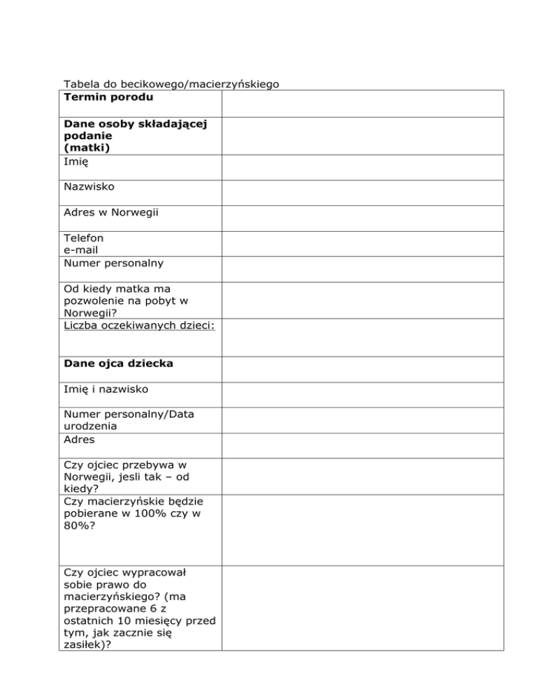 Tabela do becikowego/macierzyńskiego Termin porodu Dane osoby składającej podanie (matki) Imię Nazwisko Adres w Norwegii Telefon e-mail Numer personalny Od kiedy matka ma pozwolenie na pobyt w Norwegii? Liczba oczekiwanych dzieci: Dane ojca dziecka Imię i nazwisko Numer personalny/Data urodzenia Adres Czy ojciec przebywa w Norwegii, jesli tak – od kiedy? Czy macierzyńskie będzie pobierane w 100% czy w 80%? Czy ojciec wypracował sobie prawo do macierzyńskiego? (ma przepracowane 6 z ostatnich 10 miesięcy przed tym, jak zacznie się zasiłek)? Kiedy chcesz iść na zasiłek macierzyński? (wypłata macierzyńskiego może się zacząć najwcześniej 12 tygodni przed terminem porodu, a najpóźniej 3 tygodnie przed terminem) Podaj datę Jeśli ojciec będzie korzystał z urlopu ojcowskiego, podaj daty od kiedy do kiedy jest on planowany? Czy ojciec zamierza pobierać macierzynskie, które nie jest „urlopem ojcowskim”? (wowczas matka musi pracować, chodzić na kurs lub być chora tak, że nie może zajmować się dzieckiem)? Jeśli tak, podaj daty Podaj pracodawcę, stanowisko w pracy oraz okres zatrudnienia Podaj ewentualne inne świadczenia, ktore dostawałaś (NAV) i okres ich otrzymywania Czy masz zaplanowany urlop podczas macierzyńskiego? Jeśli tak, podaj daty od - do Ewentualne informacje dodatkowe mające znaczenie na rozpatrzenie podania
