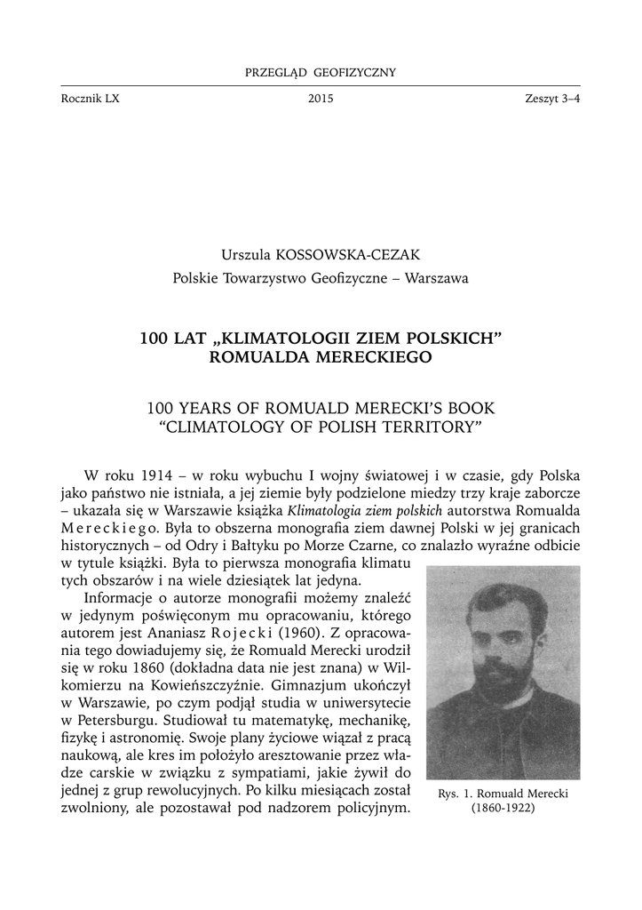 PRZEGLĄD GEOFIZYCZNY Rocznik LX 2015 Zeszyt 3–4 Urszula KOSSOWSKA-CEZAK Polskie Towarzystwo Geofizyczne – Warszawa 100 LAT „KLIMATOLOGII ZIEM POLSKICH” ROMUALDA MERECKIEGO 100 YEARS OF ROMUALD MERECKI’S BOOK “CLIMATOLOGY OF POLISH TERRITORY” W roku 1914 – w roku wybuchu I wojny światowej i w czasie, gdy Polska jako państwo nie istniała, a jej ziemie były podzielone miedzy trzy kraje zaborcze – ukazała się w Warszawie książka Klimatologia ziem polskich autorstwa Romualda M e r e c k i e g o. Była to obszerna monografia ziem dawnej Polski w jej granicach historycznych – od Odry i Bałtyku po Morze Czarne, co znalazło wyraźne odbicie w tytule książki. Była to pierwsza monografia klimatu tych obszarów i na wiele dziesiątek lat jedyna. Informacje o autorze monografii możemy znaleźć w jedynym poświęconym mu opracowaniu, którego autorem jest Ananiasz R o j e c k i (1960). Z opracowania tego dowiadujemy się, że Romuald Merecki urodził się w roku 1860 (dokładna data nie jest znana) w Wilkomierzu na Kowieńszczyźnie. Gimnazjum ukończył w Warszawie, po czym podjął studia w uniwersytecie w Petersburgu. Studiował tu matematykę, mechanikę, fizykę i astronomię. Swoje plany życiowe wiązał z pracą naukową, ale kres im położyło aresztowanie przez władze carskie w związku z sympatiami, jakie żywił do jednej z grup rewolucyjnych. Po kilku miesiącach został Rys. 1. Romuald Merecki (1860-1922) zwolniony, ale pozostawał pod nadzorem policyjnym. 238 U. Kossowska-Cezak Aby uwolnić się od tego nadzoru, pracował przez kilkanaście lat w różnych dworach ziemiańskich jako nauczyciel domowy, co jednak całkowicie pozbawiało go możliwości upragnionej pracy naukowej. Aby uzyskać taką możliwość, na początku lat 1890. powrócił do Warszawy. Tutaj te możliwości również nie były duże, gdyż były ograniczane przez władze rosyjskie. Jak napisał Władysław S m o l e ń s k i (Rojecki, 1960): „Uprawiano naukę dorywczo, poświęcając jej niedospane godziny nocy i dnie wypoczynków świątecznych. Oddawano się bezinteresownie, bez widoków na jakiekolwiek korzyści materialne, w przeświadczeniu, że się spełnia obowiązek służby narodowej”. W tej sytuacji, podobnie jak wielu innych badaczy, R. Merecki musiał podjąć pracę zarobkową. Znalazł wówczas zatrudnienie jako rachmistrz w Kasie Emerytalnej kolei warszawsko-wiedeńskiej. W roku 1893 ożenił się i w tym też czasie (brak dokładnych danych) podjął pracę na Stacji Centralnej Meteorologicznej przy Muzeum Przemysłu i Rolnictwa w Warszawie (Krakowskie Przedmieście 66). Ze stacją było powiązane Biuro, które nadzorowało pracę sieci stacji meteorologicznych, działającej niezależnie od zaborczej sieci rosyjskiej. Działalność tej sieci, zwanej warszawską, była finansowana ze składek członków Sekcji Cukrowniczej Warszawskiego Oddziału Towarzystwa Popierania Przemysłu i Handlu, Związek Zawodowy Cukrowni Królestwa Polskiego, zarządy różnych instytucji, towarzystw, majątków i przedsiębiorstw (Lipska, 1985). Romuald Merecki wszedł w skład Zarządu Biura Meteorologicznego. Przez wiele lat, aż do końca działalności w 1915 r., oficjalnym kierownikiem Stacji i Biura był Władysław G o r c z y ń s k i, ale jak to wykazał A. Rojecki (1960), faktycznym kierownikiem do roku 1907 był Merecki. Rozwinął tu ożywioną działalność tak organizacyjną (istotnie powiększył liczbę stacji w ramach sieci), jak i naukową. Jak zwrócił uwagę A. Rojecki (1960), przytaczając liczne dowody na słuszność swojego twierdzenia, rola Mereckiego w działalności Biura była jednak wybitnie pomniejszona przez oficjalnego kierownika, znacznie od niego młodszego (o 19 lat) W. Gorczyńskiego. W latach 1900-1913 R. Merecki opublikował kilkanaście rozpraw z zakresu klimatologii (nie licząc prac z zakresu astronomii) w czasopismach krajowych i zagranicznych, w tym też w publikacjach własnych Biura Meteorologicznego. I tak, między innymi, w roku 1907 został tu wydany podręcznik Wiadomości z nauki o pogodzie, w którym znalazł się zarys meteorologii rolniczej oraz opis klimatu Polski autorstwa R. Mereckiego (Lipska, 1985). Dziełem życia Mereckiego była jednak Klimatologia ziem polskich. Na stronie tytułowej książki, wydanej przez znaną warszawską firmę Jana C o t t y, jest co prawda wydrukowany rok 1914, ale na jej odwrocie znajduje się zezwolenie rosyjskiej cenzury wojskowej z datą 9 lutego 1915. Według Władysława S m o s a r s k i e g o, autora jedynej recenzji Klimatologii ziem polskich (Smosarski, 1916), w rzeczywistości ukazała się ona w roku 1915, już podczas działań I wojny światowej. 100 lat „Klimatologii ziem polskich” Romualda Mereckiego 239 Opracowanie R. Mereckiego nie było pierwszym dotyczącym klimatu ziem polskich. Opis ich klimatu zawarł już Wincenty P o l (Północny wschód Europy pod względem natury; Kossowska-Cezak, 1989), a w roku 1912 ukazała się Encyklopedia Polska (Akademia Umiejętności, Kraków), w której tomie I, poświęconym geografii fizycznej, znalazł się blisko 80-stronicowy rozdział dotyczący klimatu, napisany przez Eugeniusza R o m e r a. Pierwsza wersja tego opracowania ukazała się 2 lata wcześniej w języku francuskim w Lozannie, zatytułowana Ésquisse climatique de l’ancienne Pologne (Romer, 1912). Praca E. Romera była znana Mereckiemu, podobnie zresztą jak praca Mereckiego z roku 1907 była znana Romerowi (Rojecki, 1960). Obydwa opracowania – Rys. 2. Strona tytułowa książki Romera z 1912 r. i Mereckiego z 1914 Romualda Mereckiego r. (pozostańmy przy oficjalnej dacie ze Fig. 2. Front page of Merecki’s book strony tytułowej) – różnią się jednak między sobą pod wieloma względami, poczynając od tego, że praca Romera była znacznie mniejsza i stanowiła rozdział większej całości, podczas gdy praca Mereckiego stanowiła odrębne, obszerne, po