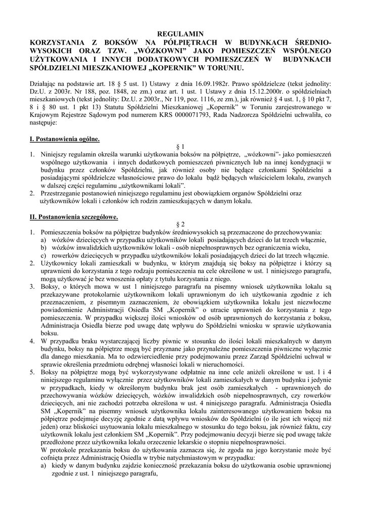 REGULAMIN KORZYSTANIA Z BOKSÓW NA PÓŁPIĘTRACH W BUDYNKACH ŚREDNIOWYSOKICH ORAZ TZW. „WÓZKOWNI” JAKO POMIESZCZEŃ WSPÓLNEGO UśYTKOWANIA I INNYCH DODATKOWYCH POMIESZCZEŃ W BUDYNKACH SPÓŁDZIELNI MIESZKANIOWEJ „KOPERNIK” W TORUNIU. Działając na podstawie art. 18 § 5 ust. 1) Ustawy z dnia 16.09.1982r. Prawo spółdzielcze (tekst jednolity: Dz.U. z 2003r. Nr 188, poz. 1848, ze zm.) oraz art. 1 ust. 1 Ustawy z dnia 15.12.2000r. o spółdzielniach mieszkaniowych (tekst jednolity: Dz.U. z 2003r., Nr 119, poz. 1116, ze zm.), jak równieŜ § 4 ust. 1, § 10 pkt 7, 8 i § 80 ust. 1 pkt 13) Statutu Spółdzielni Mieszkaniowej „Kopernik” w Toruniu zarejestrowanego w Krajowym Rejestrze Sądowym pod numerem KRS 0000071793, Rada Nadzorcza Spółdzielni uchwaliła, co następuje: I. Postanowienia ogólne. §1 1. Niniejszy regulamin określa warunki uŜytkowania boksów na półpiętrze, „wózkowni”- jako pomieszczeń wspólnego uŜytkowania i innych dodatkowych pomieszczeń piwnicznych lub na innej kondygnacji w budynku przez członków Spółdzielni, jak równieŜ osoby nie będące członkami Spółdzielni a posiadającymi spółdzielcze własnościowe prawo do lokalu bądź będących właścicielem lokalu, zwanych w dalszej części regulaminu „uŜytkownikami lokali”. 2. Przestrzeganie postanowień niniejszego regulaminu jest obowiązkiem organów Spółdzielni oraz uŜytkowników lokali i członków ich rodzin zamieszkujących w danym lokalu. II. Postanowienia szczegółowe. §2 1. Pomieszczenia boksów na półpiętrze budynków średniowysokich są przeznaczone do przechowywania: a) wózków dziecięcych w przypadku uŜytkowników lokali posiadających dzieci do lat trzech włącznie, b) wózków inwalidzkich uŜytkowników lokali - osób niepełnosprawnych bez ograniczenia wieku, c) rowerków dziecięcych w przypadku uŜytkowników lokali posiadających dzieci do lat trzech włącznie. 2. UŜytkownicy lokali zamieszkali w budynku, w którym znajdują się boksy na półpiętrze i którzy są uprawnieni do korzystania z tego rodzaju pomieszczenia na cele określone w ust. 1 niniejszego paragrafu, mogą uŜytkować je bez wnoszenia opłaty z tytułu korzystania z niego. 3. Boksy, o których mowa w ust 1 niniejszego paragrafu na pisemny wniosek uŜytkownika lokalu są przekazywane protokolarnie uŜytkownikom lokali uprawnionym do ich uŜytkowania zgodnie z ich przeznaczeniem, z pisemnym zaznaczeniem, Ŝe obowiązkiem uŜytkownika lokalu jest niezwłoczne powiadomienie Administracji Osiedla SM „Kopernik” o utracie uprawnień do korzystania z tego pomieszczenia. W przypadku większej ilości wniosków od osób uprawnionych do korzystania z boksu, Administracja Osiedla bierze pod uwagę datę wpływu do Spółdzielni wniosku w sprawie uŜytkowania boksu. 4. W przypadku braku wystarczającej liczby piwnic w stosunku do ilości lokali mieszkalnych w danym budynku, boksy na półpiętrze mogą być przyznane jako przynaleŜne pomieszczenia piwniczne wyłącznie dla danego mieszkania. Ma to odzwierciedlenie przy podejmowaniu przez Zarząd Spółdzielni uchwał w sprawie określenia przedmiotu odrębnej własności lokali w nieruchomości. 5. Boksy na półpiętrze mogą być wykorzystywane odpłatnie na inne cele aniŜeli określone w ust. l i 4 niniejszego regulaminu wyłącznie przez uŜytkowników lokali zamieszkałych w danym budynku i jedynie w przypadkach, kiedy w określonym budynku brak jest osób zamieszkałych - uprawnionych do przechowywania wózków dziecięcych, wózków inwalidzkich osób niepełnosprawnych, czy rowerków dziecięcych, ani nie zachodzi potrzeba określona w ust. 4 niniejszego paragrafu. Administracja Osiedla SM „Kopernik” na pisemny wniosek uŜytkownika lokalu zainteresowanego uŜytkowaniem boksu na półpiętrze podejmuje decyzję zgodnie z datą wpływu wniosków do Spółdzielni (o ile jest ich więcej niŜ jeden) oraz bliskości usytuowania lokalu mieszkalnego w stosunku do tego boksu, jak równieŜ faktu, czy uŜytkownik lokalu jest członkiem SM „Kopernik”. Przy podejmowaniu decyzji bierze się pod uwagę takŜe przedłoŜone przez uŜytkownika lokalu orzeczenie lekarskie o stopniu niepełnosprawności. W protokole przekazania boksu do uŜytkowania zaznacza się, Ŝe zgoda na jego korzystanie moŜe być cofnięta przez Administrację Osiedla w trybie natychmiastowym w przypadku: a) kiedy w danym budynku zajdzie konieczność przekazania boksu do uŜytkowania osobie uprawnionej zgodnie z ust. 1 niniejszego paragrafu, 2 6. 7. 8. 9. 10. 11. b) gdy zajdzie przypadek określony w ust. 4 niniejszego paragrafu, c) zaległości dwumiesięcznych w opłacie za uŜytkowanie boksu i ich nieuregulowania po wyznaczeniu przez Spółdzielnię dodatkowego terminu płatności. OpróŜnienie boksu i przekazanie go przez uŜytkownika lokalu do Administracji Osiedla następuje w ciągu 14 dni od daty doręczenia pisma w przedmiocie cofnięcia zgody na jego uŜytkowanie (dotyczy to równieŜ sytuacji, gdy w protokole przekazania lub w pisemnej zgodzie Spółdzielni dotyczącej uŜytkowania boksu brak jest zapisu o moŜliwości cofnięcia zgody). Ustalanie odpłatności za korzystanie z boksów na półpiętrze dla uŜytkowników lokali, o których mowa w ust. 5 niniejszego paragrafu jest w kompetencji Rady Nadzorczej SM "Kopernik". Przy korzystaniu z boksu zabrania się: a) przechowywania motorowerów, motocykli, materiałów łatwopalnych, wybuchowych, itp., b) składowania rzeczy stanowiących poŜywkę dla gryzoni, c) przechowywania przedmiotów gnijących i rozkładających się, d) dokonywania przeróbek instalacji elektrycznej (np. zakładania gniazdek elektrycznych), e) wykonywania przeróbek wewnątrz boksu polegających np. na trwałym montaŜu regałów, półek i stałej zabudowy. Korzystanie z boksu przez uŜytkownika lokalu winno się odbywać zgodnie z jego przeznaczeniem, w oparciu o pisemną zgodę Administracji Osiedla SM „Kope