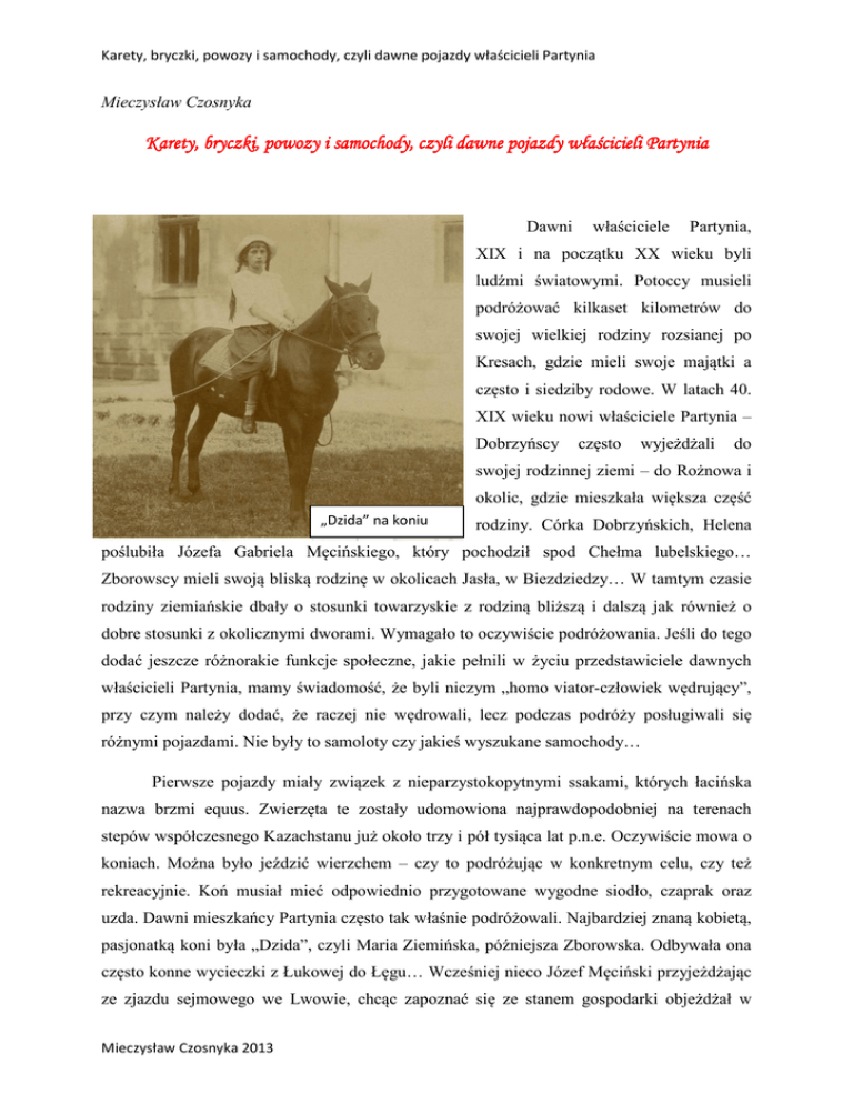 Karety, bryczki, powozy i samochody, czyli dawne pojazdy właścicieli Partynia Mieczysław Czosnyka Karety, bryczki, powozy i samochody, czyli dawne pojazdy właścicieli Partynia Dawni właściciele Partynia, XIX i na początku XX wieku byli ludźmi światowymi. Potoccy musieli podróżować kilkaset kilometrów do swojej wielkiej rodziny rozsianej po Kresach, gdzie mieli swoje majątki a często i siedziby rodowe. W latach 40. XIX wieku nowi właściciele Partynia – Dobrzyńscy często wyjeżdżali do swojej rodzinnej ziemi – do Rożnowa i okolic, gdzie mieszkała większa część „Dzida” na koniu rodziny. Córka Dobrzyńskich, Helena poślubiła Józefa Gabriela Męcińskiego, który pochodził spod Chełma lubelskiego… Zborowscy mieli swoją bliską rodzinę w okolicach Jasła, w Biezdziedzy… W tamtym czasie rodziny ziemiańskie dbały o stosunki towarzyskie z rodziną bliższą i dalszą jak również o dobre stosunki z okolicznymi dworami. Wymagało to oczywiście podróżowania. Jeśli do tego dodać jeszcze różnorakie funkcje społeczne, jakie pełnili w życiu przedstawiciele dawnych właścicieli Partynia, mamy świadomość, że byli niczym „homo viator-człowiek wędrujący”, przy czym należy dodać, że raczej nie wędrowali, lecz podczas podróży posługiwali się różnymi pojazdami. Nie były to samoloty czy jakieś wyszukane samochody… Pierwsze pojazdy miały związek z nieparzystokopytnymi ssakami, których łacińska nazwa brzmi equus. Zwierzęta te zostały udomowiona najprawdopodobniej na terenach stepów współczesnego Kazachstanu już około trzy i pół tysiąca lat p.n.e. Oczywiście mowa o koniach. Można było jeździć wierzchem – czy to podróżując w konkretnym celu, czy też rekreacyjnie. Koń musiał mieć odpowiednio przygotowane wygodne siodło, czaprak oraz uzda. Dawni mieszkańcy Partynia często tak właśnie podróżowali. Najbardziej znaną kobietą, pasjonatką koni była „Dzida”, czyli Maria Ziemińska, późniejsza Zborowska. Odbywała ona często konne wycieczki z Łukowej do Łęgu… Wcześniej nieco Józef Męciński przyjeżdżając ze zjazdu sejmowego we Lwowie, chcąc zapoznać się ze stanem gospodarki objeżdżał w Mieczysław Czosnyka 2013 Karety, bryczki, powozy i samochody, czyli dawne pojazdy właścicieli Partynia towarzystwie Antoniego Sulczewskiego okoliczne pola. Innym razem służyła mu do tego jednokonna bryczka, nazywana linijką… Skoro mowa o bryczkach, to należy powiedzieć, że właściciele Partynia – Męcińscy i Zborowscy posiadali nie tylko bryczki ale też karety. W latach 70. I 80. XIX w. Męcińska często jeździła do dworu w Łukowej, gdzie mieszkała jej matka, Helena Dobrzyńska. Powozy takie były zaprzężone najczęściej w parę koni, którymi kierował woźnica nazywany stangretem. I jeździli po okolicznych dworach w odwiedziny: a to do Diamentu, a to do Radłowa, a to do Lichwina, a to do Zbylitowskiej Góry, a to do Brnia, Olesna, Dąbrowy, do Andrychowa… Najdłuższa zanotowana podróż miała miejsce w 1914 roku, kiedy to Helena Zborowska wymogła na swoim mężu Janie podróż do Wiednia. Podróżowano karetą do Andrychowa. Była to ucieczka z obawy przed wojną. Droga taka nie należała zapewne do najprzyjemniejszych. Tylko niektóre gościńce były brukowane, reszta były to wyboiste drogi polne, pełne dziur. Tylko alejki wjazdowe przy dworach i pałacach były zadbane, wysypane piaskiem i drobnym żwirkiem. W latach 20. i 30. XX wieku Maria i Aleksander Zborowscy zamieszkiwali Pojazdy partyńskie Helena, wraz z Partyń, parająca się dziećmi a babcia literaturą, nazywana hrabiną, zamieszkała w 1925 roku w nowo wybudowanym modrzewiowym dworku w Pogwizdowie. Miała ona swój zaprzęg i powożących ją stangretów: Jana Kocoła i Jana Walczaka z Podrzecza. Wyjeżdżała ona często do swojej siostry mieszkającej początkowo w Andrychowie, a podczas II wojny do światowej leśniczówki mieszczącej się w lesie zwanym Belerytem nieopodal Dąbrowy Tarnowskiej. Zimą hrabina Helena, otulona tzw. baranicą, odbywała podróże Mieczysław Czosnyka 2013 Partyńska bryczka Karety, bryczki, powozy i samochody, czyli dawne pojazdy właścicieli Partynia saniami – do znajomych lub na modły do Kościoła z Jurkowie lub w Żabnie. Wieloletnim stangretem w Partyniu był też Jan Kukuś. W okresie II wojny światowej młodzi Zborowscy, Zbyszek, Janek, Henryk odwiedzali babcię w Pogwizdowie, przywożąc jej wiktuały. Jeden z braci zbudował w tym celu oryginalny, wzbudzający zachwyt pojazd – był to mały powóz (wózek), zaprzęgnięty w trzy psy… Tak podróżowali z Partynia przez wał na Żabnicy do dworku w Pogwizdowie. Wyjazdy łączyły się też z budową pałacu w Partyniu oraz dworku w Pogwizdowie. Po plany pałacu wielokrotnie jeździł do Krakowa do profesora Sławomira Odrzywolskiego w ok. 1890 roku Józef Gabriel Męciński. Podczas budowy pałacu w 1892 roku materiały budowlane zwożono konnymi furami z Ciężkowic. Drewniany dworek w Pogwizdowie powstał na zamówienie Heleny z Męcińskich-Zborowskiej w Andrychowie, gdzie miejscowi cieśle Psi zaprzęg, zbudowany przez jednego z braci Zborowskich przygotowali belki. Zostały one na miejscu złożone i ponumerowane zaś po przyjeździe na miejsce do Łęgu, pieczołowicie złożone… Wielką swoich czasów wspomniany postacią był Jozef Męciński. Ten powstaniec styczniowy, pełnił w swoim życiu wiele różnych funkcji społecznych, m.in. był prezesem rady powiatowej w Dąbrowie Tarnowskiej i Tarnowie, przez 41 lat pełnił nieprzerwanie funkcję posła do Sejmu Krajowego we Lwowie, był też prezesem Towarzystwa Ubezpieczeniowego „Florianka” w Krakowie. Przyczynił się też do powstania linii kolejowej Tarnów-Szczucin w latach 1904-1906. Na sesje sejmowe lub podczas innych podróży do Lwowa, Wiednia czy Krakowa podróżował koleją. Z dzisiejszego punktu widzenia najciekaws