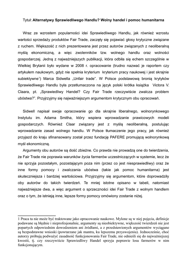 Tytuł: Alternatywy Sprawiedliwego Handlu? Wolny handel i pomoc humanitarna Wraz ze wzrostem popularności idei Sprawiedliwego Handlu, jak również wzrostu wartości sprzedaży produktów Fair Trade, zaczęły się pojawiać głosy krytyczne związane z ruchem. Większość z nich prezentowana jest przez autorów związanych z neoliberalną myślą ekonomiczną, a więc zwolenników tzw. wolnego handlu oraz wolności gospodarczej. Jedną z najważniejszych publikacji, która odbiła się echem szczególnie w Wielkiej Brytanii było wydane w 2008 r. opracowanie (trudno nazwać je raportem czy artykułem naukowym, gdyż nie spełnia kryterium kryterium pracy naukowej i jest skrajnie subiektywne1) Marca Sidwella „Unfair trade”. W Polsce podstawową bronią krytyków Sprawiedliwego Handlu była przetłumaczona na język polski krótka książka Victora V. Claara, pt. „Sprawiedliwy Handel? Czy Fair Trade rzeczywiście zwalcza problem ubóstwa?”. Przyjrzyjmy się najważniejszym argumentom krytycznym obu opracowań. Sidwell napisał swoje opracowanie go dla skrajnie liberalnego, wolnorynkowego Instytutu im. Adama Smitha, który wspiera wprowadzanie prawicowych modeli gospodarczych. Również Claar związany jest z myślą neoliberalną, postulując wprowadzanie zasad wolnego handlu. W Polsce tłumaczenie jego pracy, jak również przyjazd do kraju sfinansowany został przez fundację PAFERE promującą wolnorynkową myśl ekonomiczną. Argumenty obu autorów są dość zbieżne. Co prawda nie prowadzą one do twierdzenia, że Fair Trade nie poprawia warunków życia farmerów uczestniczących w systemie, lecz że nie sprzyja pozostałym, pozostającym poza nim (przez co jest niesprawiedliwy) oraz że inne formy pomocy i zwalczania ubóstwa (takie jak pomoc humanitarna) jest skuteczniejsza i bardziej wartościowa. Przyjrzyjmy się argumentom, które doprowadziły oby autorów do takich twierdzeń. Te mniej istotne opisano w tabeli, natomiast najważniejsze dwa, a więc argument o sprzeczności idei Fair Trade z wolnym handlem oraz o tym, że istnieją inne, lepsze formy pomocy omówiony zostanie niżej. 1 Praca ta nie może być traktowane jako opracowanie naukowe. Mylone są w niej pojęcia, definicje podawane są błędnie i nieprofesjonalnie, argumenty są nieobiektywne, większość twierdzeń nie jest popartych odpowiednim dowodzeniem ani źródłami, a z przedstawionych argumentów wyciągane są bezpodstawne wnioski (powtarzane jak mantra, ku lepszemu przyswojeniu). Jednocześnie, choć autorzy próbują podważyć zasadność funkcjonowania Fair Trade, nie odnieśli się do najważniejszej kwestii, tj. czy rzeczywiście Sprawiedliwy Handel sprzyja poprawie losu farmerów w nim funkcjonującym. Argumenty przeciwne Fair Trade Komentarz Częściowo prawda: Sprawiedliwy Handel najbardziej faworyzuje zorganizowane w spółdzielnie grupy rolników. Na ile z tej pomocy korzystają pojedynczy rolnicy zależy Sprawiedliwy Handel jest od demokratycznie wybieranych władz spółdzielni. Pracownicy najemni tylko z rzadka niesprawiedliwy (nie jest dostępny są członkami spółdzielni, niemniej jednak główną siłą roboczą w większości farm są dla każdego, lecz tylko dla ich właściciele bądź dzierżawcy, odczuwający znaczną korzyść z funkcjonowania Fair wybranych). (Sidwell) Trade. Mały wpływ FT na poprawę losu pracowników najemnych jest jednym z wyzwań przed którymi stoi ruch Prawda: spółdzielnie, które spełnią kryteria Fair Trade nie są przymuszone do sprzedawania produktów opatrzonych jednym z certyfikatów. Jeżeli produkują więcej Fair Trade wspiera głównie rolników z niż wynika z popytu produktów Fair Trade w Europie i USA, to nie można im zabronić lepiej rozwiniętych krajów (Meksyk), sprzedawać na rynek konwencjonalny. Ale jest to raczej powód do zadowolenia, gdyż pomijając tych gorzej rozwiniętych dzięki temu Sprawiedliwy Handel wpływa pozytywnie również na rynek (Etiopia). (Sidwell) konwencjonalny, sprawiając np., że przestrzega się praw pracowniczych czy praw dzieci na farmach. Nieprawda: Sprawiedliwy Handel rzeczywiście inwestuje najbardziej w producentów rolnych najmniej nowoczesnych, nierzadko posiadających jedynie jedno narzędzie rolnicze – maczetę. Fair Trade nie sprzyja Tacy rolnicy od pokoleń tkwią w kręgu ubóstwa, które nie pozwala dzieciom wyrwać się z biedy, rozwojowi, stawiając na gdyż nie otrzymują edukacji, a ich ubodzy rodzice nie są w stanie nauczyć ich niczego poza niewydajnych rolników, gospodarowaniem w tradycyjny sposób na farmie. Istnieje setki przykładów, gdzie Sprawiedliwy którzy nie chcą Handel, dzięki inwestowaniu w edukację, służbę zdrowia etc. przerwał ten krąg. Równie wiele inwestować w przykładów pokazuje jak społeczności dzięki pieniądzom z FT dywersyfikowały lub dywersyfikację produkcji unowocześniały produkcję, np. przez inwestowanie w agroturystykę czy warsztaty rękodzielnicze czy mechanizację. lub też w większy dostęp do maszyn czy sadzonek, choć rzeczywiście rzadziej inwestowano w (Sidwell, Claar) mechanizację, co jest wytłumaczalne troską o siłę roboczą oraz brakiem możliwych do zastosowania technik mechanizacyjnych. Częściowo prawda: Sprawiedliwy Handel najbardziej faworyzuje zorganizowane w spółdzielnie Fair Trade sprzyja grupy rolników. Na ile z tej pomocy korzystają pojedynczy rolnicy zależy od demokratycznie właścicielom ziemskim, wybieranych władz spółdzielni. Pracownicy najemni tylko z rzadka są członkami spółdzielni, a nie zatrudnionej na niemniej jednak główną siłą roboczą w większości farm są ich właściciele bądź dzierżawcy, farmach najemnej sile odczuwający znaczną korzyść z funkcjonowania Fair Trade. Mały wpływ FT na poprawę losu roboczej (Sidwell) pracowników najemnych jest jednym z wyzwań przed którymi stoi ruch 80% produktów Prawda: spółdzielnie, które spełnią kryteria Fair T