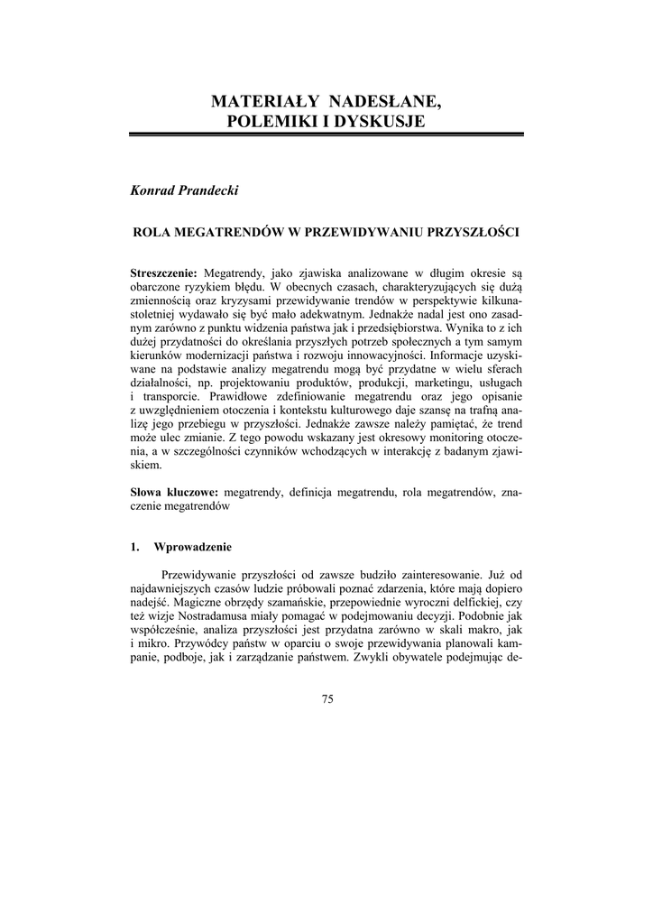 MATERIAŁY NADESŁANE, POLEMIKI I DYSKUSJE Konrad Prandecki ROLA MEGATRENDÓW W PRZEWIDYWANIU PRZYSZŁOŚCI Streszczenie: Megatrendy, jako zjawiska analizowane w długim okresie są obarczone ryzykiem błędu. W obecnych czasach, charakteryzujących się dużą zmiennością oraz kryzysami przewidywanie trendów w perspektywie kilkunastoletniej wydawało się być mało adekwatnym. Jednakże nadal jest ono zasadnym zarówno z punktu widzenia państwa jak i przedsiębiorstwa. Wynika to z ich dużej przydatności do określania przyszłych potrzeb społecznych a tym samym kierunków modernizacji państwa i rozwoju innowacyjności. Informacje uzyskiwane na podstawie analizy megatrendu mogą być przydatne w wielu sferach działalności, np. projektowaniu produktów, produkcji, marketingu, usługach i transporcie. Prawidłowe zdefiniowanie megatrendu oraz jego opisanie z uwzględnieniem otoczenia i kontekstu kulturowego daje szansę na trafną analizę jego przebiegu w przyszłości. Jednakże zawsze należy pamiętać, że trend może ulec zmianie. Z tego powodu wskazany jest okresowy monitoring otoczenia, a w szczególności czynników wchodzących w interakcję z badanym zjawiskiem. Słowa kluczowe: megatrendy, definicja megatrendu, rola megatrendów, znaczenie megatrendów 1. Wprowadzenie Przewidywanie przyszłości od zawsze budziło zainteresowanie. Już od najdawniejszych czasów ludzie próbowali poznać zdarzenia, które mają dopiero nadejść. Magiczne obrzędy szamańskie, przepowiednie wyroczni delfickiej, czy też wizje Nostradamusa miały pomagać w podejmowaniu decyzji. Podobnie jak współcześnie, analiza przyszłości jest przydatna zarówno w skali makro, jak i mikro. Przywódcy państw w oparciu o swoje przewidywania planowali kampanie, podboje, jak i zarządzanie państwem. Zwykli obywatele podejmując de- 75 MATERIAŁY NADESŁANE, POLEMIKI I DYSKUSJE cyzje dotyczące małżeństwa lub działalności zawodowej również posługiwali się badaniem przyszłości. Z biegiem czasu zmianie uległy narzędzia służące tej czynności oraz horyzont czasowy, który uległ wydłużeniu. Jednakże cele jakim ma ono służyć pozostają niezmienne. Współcześnie do opisu zjawisk o charakterze globalnym używa się pojęcia megatrendu, które powstało na początku lat osiemdziesiątych XX wieku i na stałe zagościło w literaturze. Jednakże po pierwszej fali euforii związanej z próbą opisu tych zjawisk i tym samym przewidzenia rozwoju cywilizacyjnego świata, wraz z coraz mniejszymi efektami, zainteresowanie megatrendami spadło. Wynikało to z rosnącego przeświadczenia o niemożności prognozowania wynikającej z narastającego tempa przemian. Takie nastawienie zostało zbudowane na częściowo błędnym przeświadczeniu o możliwości praktycznego, długoterminowego kontrolowania trendów poprzez zarządzanie przyszłością1. W rzeczywistości dokładne przewidzenie tego co ma dopiero nastąpić nie jest możliwe, co powoduje, że próby przewidzenia konkretnych, jednostkowych zachowań są skazane na niepowodzenie. Nawet ogólne zjawiska mogą zostać spowolnione poprzez nieprzewidziane zdarzenia. W ten sposób należy postrzegać spowolnienie procesu globalizacji, jakie nastąpiło w wyniku ataku terrorystycznego na USA w dniu 11 września 2001 r. Ponadto wielość zależności pomiędzy poszczególnymi zjawiskami powoduje, że nie jest możliwym wyodrębnienie pojedynczego trendu, a jedynie pokazanie całej grupy zjawisk. Zmiana jednego z czynników może wywołać liczne konsekwencje co powoduje, że zbudowana wizja przyszłości ulegnie znacznej modyfikacji. Z tego powodu często wykorzystywaną metodą opisu przyszłości jest budowanie scenariuszy. W ten sposób można próbować pokazać nie tylko najbardziej prawdopodobny rozwój sytuacji, ale również alternatywne wersje. Najczęściej stosuje się do twego metodę 3P (the predictable, the possible, and the preferred), czyli podział na wizje: przewidywalne, możliwe i preferowane2. Powstaje więc pytanie czy megatrendy nadal są użytecznym narzędziem do przewidywania przyszłości oraz jakie są możliwości ich wykorzystania, w szczególności, do budowy długoterminowych scenariuszy? Celem niniejszego artykułu jest próba zgłębienia tych zagadnień. 2. Megatrend – charakterystyka zjawiska Badanie przyszłości może przyjąć różne formy. Jedną z częściej stosowanych jest ekstrapolacja trendów. Za trend uznaje się tendencję rozwojową charak1 Por. J. F. Coates, J. Jarratt, Myśląc o roku 2025, Transformacje nr 3-4/1993-94, L. Groff, Rewolucja informacyjna – globalne trendy restrukturyzacyjne, wizje i decyzje, ibidem, za: L. W. Zacher, Gry o przyszłe światy, Polska Akademia Nauk, Komitet Prognoz „Polska 2000 Plus”, Warszawa 2006, s. 17. 2 G. Larsen, Why megatrends matter? Futureorientation 5/2006, Copenhagen Institute for Future Studies, www.cifs.dk. 76 MATERIAŁY NADESŁANE, POLEMIKI I DYSKUSJE teryzującą ogólny kierunek zmian. W tym przypadku przewidywanie przyszłości opiera się na analizie danych historycznych, na podstawie których można wyciągać wnioski dotyczące prognozowania zjawisk mających dopiero wystąpić. Daje to możliwość określenia jak zjawiska występujące obecnie mogą ewoluować w przyszłości. Trendy analizuje się w zależności od horyzontu czasowego, dzieląc je na: krótko-, średnio- i długoterminowe. Innym, bardzo często stosowanym kryterium, znanym jako teoria Dow’a, jest podział na: główne, wtórne i krótkookresowe.3 Bardzo silne trendy często nazywane są megatrendami. Termin ten został po raz pierwszy użyty przez J. Naisbitt'a w 1982 r.4. Jednakże autor nie pokusił się o jego zdefiniowanie, uznając, że to określenie jest intuicyjnie i etymologicznie oczywiste. Skoro trend jest długotrwałą (dłuższa od zmian sezonowych) tendencją rozwojową analizowanego zjawiska w czasie, to termin ten z dodanym przedrostkiem „me