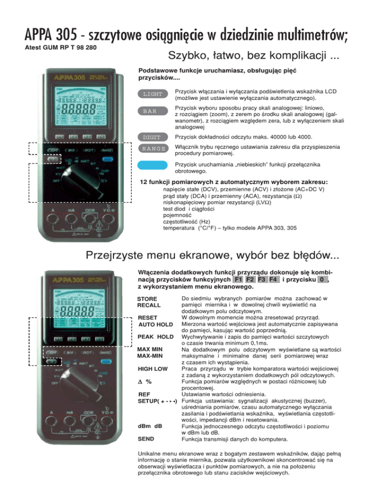 APPA 305 - szczytowe osi¹gniêcie w dziedzinie multimetrów; Atest GUM RP T 98 280 Szybko, ³atwo, bez komplikacji ... Podstawowe funkcje uruchamiasz, obs³uguj¹c piêæ przycisków.... Przycisk w³¹czania i wy³¹czania podwietlenia wskanika LCD (mo¿liwe jest ustawienie wy³¹czania automatycznego). LIGHT Przycisk wyboru sposobu pracy skali analogowej: liniowo, z rozci¹giem (zoom), z zerem po rodku skali analogowej (galwanometr), z rozci¹giem wzglêdem zera, lub z wy³¹czeniem skali analogowej BAR DIGIT Przycisk dok³adnoci odczytu maks. 40000 lub 4000. RANGE W³¹cznik trybu rêcznego ustawiania zakresu dla przyspieszenia procedury pomiarowej. Przycisk uruchamiania niebieskich funkcji prze³¹cznika obrotowego. 12 funkcji pomiarowych z automatycznym wyborem zakresu: napiêcie sta³e (DCV), przemienne (ACV) i z³o¿one (AC+DC V) pr¹d sta³y (DCA) i przemienny (ACA), rezystancja (Ω) niskonapiêciowy pomiar rezystancji (LVΩ) test diod i ci¹g³oci pojemnoæ czêstotliwoæ (Hz) temperatura (°C/°F) tylko modele APPA 303, 305 Przejrzyste menu ekranowe, wybór bez b³êdów... W³¹czenia dodatkowych funkcji przyrz¹du dokonuje siê kombinacj¹ przycisków funkcyjnych F1 F2 F3 F4 i przycisku 0 , z wykorzystaniem menu ekranowego. Do siedmiu wybranych pomiarów mo¿na zachowaæ w pamiêci miernika i w dowolnej chwili wywietliæ na dodatkowym polu odczytowym. W dowolnym momencie mo¿na zresetowaæ przyrz¹d. RESET AUTO HOLD Mierzona wartoæ wejciowa jest automatycznie zapisywana do pamiêci, kasuj¹c wartoæ poprzedni¹. PEAK HOLD Wychwytywanie i zapis do pamiêci wartoci szczytowych o czasie trwania minimum 0,1ms. MAX MIN Na dodatkowym polu odczytowym wywietlane s¹ wartoci MAX-MIN maksymalne i minimalne danej serii pomiarowej wraz z czasem ich wyst¹pienia. Praca przyrz¹du w trybie komparatora wartoci wejciowej HIGH LOW z zadan¹ z wykorzystaniem dodatkowych pól odczytowych. Funkcja pomiarów wzglêdnych w postaci ró¿nicowej lub ∆ % procentowej. Ustawianie wartoci odniesienia. REF SETUP( + - ) Funkcja ustawiania: sygnalizacji akustycznej (buzzer), uredniania pomiarów, czasu automatycznego wy³¹czania zasilania i podwietlania wskanika, wywietlania czêstotliwoci, impedancji dBm i resetowania. dBm dB Funkcja jednoczesnego odczytu czêstotliwoci i poziomu w dBm lub dB. SEND Funkcja transmisji danych do komputera. STORE RECALL Unikalne menu ekranowe wraz z bogatym zestawem wskaników, daj¹c pe³n¹ informacjê o stanie miernika, pozwala u¿ytkownikowi skoncentrowaæ siê na obserwacji wywietlacza i punktów pomiarowych, a nie na po³o¿eniu prze³¹cznika obrotowego lub stanu zacisków wejciowych. przygotowane do pracy w ka¿dych warunkach, W dzieñ i w nocy Ka¿dy przyrz¹d serii APPA 300 wyposa¿ono w podwietlanie ekranu EL, które mo¿na w³¹czaæ i wy³¹czaæ jednym przyciskiem. Mo¿liwe jest tak¿e ustawienie czasu w minutach, po którym podwietlenie zostanie wy³¹czone automatycznie. Obudowa na ka¿d¹ okazjê IP 64 Mierniki zaprojektowano do pracy zarówno w pomieszczeniach, jak i na wolnym powietrzu w skrajnie trudnych warunkach. Uszczelniono miejsca styku obudowy, prze³¹cznik obrotowy, pokrywê pojemnika baterii i gniazda pomiarowe, co zapewnia pe³n¹ ochronê przyrz¹dów przed kurzem i bryzgami wody. Dodatkowym ich atutem jest znaczna odpornoæ na wibracje i udary, np. upadek. Dodatkowa os³ona Ka¿dy z mierników serii APPA 300 wyposa¿ony jest w os³onê gumow¹ z wbudowan¹ odchylan¹ podstawk¹ oraz z wygodnymi uchwytami na koñcówki pomiarowe i otworem do zawieszania przyrz¹du. Os³ona zapewnia dodatkow¹ ochronê przed udarami mechanicznymi i poprawia komfort obs³ugi miernika. Trwa³oæ i bezpieczeñstwo Wysokoudarowe bezpieczniki i pozystory oraz niskotopliwe rezystory chroni¹ miernik i u¿ytkownika przed skutkami przepiêæ i przetê¿eñ. Unikalnej konstrukcji prze³¹cznik obrotowy wykonany z plastiku o wysokiej trwa³oci, styków ze stopu miedziowo-berylowego oraz poz³acanych kontaktów na p³ytce drukowanej gwarantuje wieloletni¹, niezawodn¹ pracê przyrz¹du. Komplet akcesoriów Przewody pomiarowe mierników s¹ zaprojektowane i wykonane w taki sposób, aby zapewniæ maksymalne bezpie-czeñstwo u¿ytkownikowi. Ich charakterystyczne elementy to: ca³kowicie os³oniête k¹towe wtyki bananowe, zapobiegaj¹cy zeliniêciu siê palców kszta³t uchwytu oraz koñcówki z twardego stopu o du¿ej odpornoci na uszkodzenie. Izolowane krokodylki oraz (w modelach 303 i 305) miniaturowa sonda temperaturowa typu K wraz z adapterem stanowi¹ wyposa¿enie standardowe przyrz¹dów. Standardowe oprogramowanie na CD w Appa 305 bezpiecznie i ³atwo pod³¹czane do komputera. Przyrz¹dy serii APPA 300 wyposa¿ono w interfejs szeregowy USB, który umo¿liwia ich ³atwe po³¹czenie i wspó³pracê z komputerem klasy PC. Optoelektroniczny kabel po³¹czeniowy z wtykiem USB oraz oprogramowanie APPA WinDMM 300 s¹ w modelu 305 standardowym, a w modelach 301 i 303 opcjonalnym wyposa¿eniem. Autokalibracja Po pod³¹czeniu za pomoc¹ kabla USB do komputera oraz przez zaciski wejciowe do zewnêtrznego kalibratora mo¿na ³atwo dokonaæ kalibracji ka¿dego z mier-ników serii APPA 300 bez koniecznoci otwierania obudowy Przyrz¹dy wirtualne .... Oprogramowanie bazuj¹ce na programie LabVIEW pozwala na tworzenie przez u¿ytkownika za pomoc¹ standardowego komputera PC i miernika serii APPA 300 w³asnych systemów pomiarowych nazywanych systemami wirtualnymi. Programuj¹c sposób i rodzaj akwizycji danych pomiarowych uzyskuje siê zestaw pomiarów odpowiadaj¹cy dok³adnie potrzebom. Zbieranie i analiza danych Gdy niezbêdna jest dokumentacja pomiarów w postaci cyfrowej lub wydruku, a tak¿e w celu dokonania analizy statystycznej lub przeliczenia danych pomiarowych, wystarczy przes³aæ przez z³¹cze szeregowe dane do komputera i skorzystaæ z wyj¹tkowo dobrego narzêdzia jakim jest program APPA WinDMM 300. FUNKCJE POMIAROWE ZAKRESY Napiêcie sta³e (Vdc): Napiêcie pr