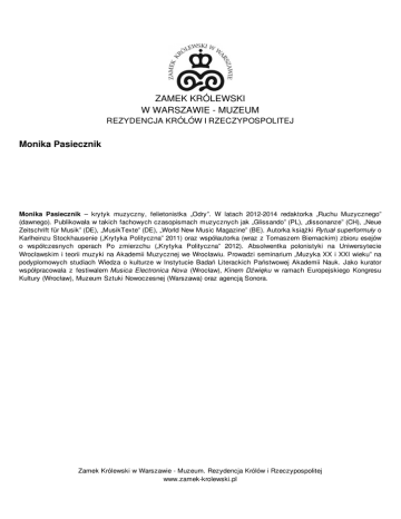 ZAMEK KRÓLEWSKI W WARSZAWIE - MUZEUM REZYDENCJA KRÓLÓW I RZECZYPOSPOLITEJ Monika Pasiecznik Monika Pasiecznik – krytyk muzyczny, felietonistka „Odry”. W latach 2012-2014 redaktorka „Ruchu Muzycznego” (dawnego). Publikowała w takich fachowych czasopismach muzycznych jak „Glissando” (PL), „dissonanze” (CH), „Neue Zeitschrift für Musik” (DE), „MusikTexte” (DE), „World New Music Magazine” (BE). Autorka książki Rytuał superformuły o Karlheinzu Stockhausenie („Krytyka Polityczna” 2011) oraz współautorka (wraz z Tomaszem Biernackim) zbioru esejów o współczesnych operach Po zmierzchu („Krytyka Polityczna” 2012). Absolwentka polonistyki na Uniwersytecie Wrocławskim i teorii muzyki na Akademii Muzycznej we Wrocławiu. Prowadzi seminarium „Muzyka XX i XXI wieku” na podyplomowych studiach Wiedza o kulturze w Instytucie Badań Literackich Państwowej Akademii Nauk. Jako kurator współpracowała z festiwalem Musica Electronica Nova (Wrocław), Kinem Dźwięku w ramach Europejskiego Kongresu Kultury (Wrocław), Muzeum Sztuki Nowoczesnej (Warszawa) oraz agencją Sonora. Zamek Królewski w Warszawie - Muzeum. Rezydencja Królów i Rzeczypospolitej www.zamek-krolewski.pl