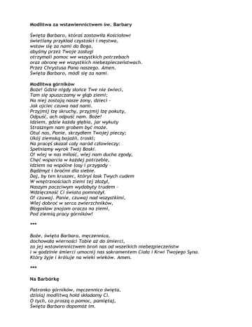 Modlitwa za wstawiennictwem św. Barbary Święta Barbaro, któraś zostawiła Kościołowi świetlany przykład czystości i męstwa, wstaw się za nami do Boga, abyśmy przez Twoje zasługi otrzymali pomoc we wszystkich potrzebach oraz obronę we wszystkich niebezpieczeństwach. Przez Chrystusa Pana naszego. Amen. Święta Barbaro, módl się za nami. Modlitwa górników Boże! Gdzie nigdy słońce Twe nie świeci, Tam się spuszczamy w głąb ziemi; Na niej zostają nasze żony, dzieci Jak ojciec czuwa nad nami. Przyjmij łzę skruchy, przyjmij łzę pokuty, Odpuść, ach odpuść nam. Boże! Idziem, gdzie każda głębia, jar wykuty Strasznym nam grobem być może. Otul nas, Panie, skrzydłem Twojej pieczy; Ukój ziemską bojaźń, troski; Na pracęś skazał cały naród człowieczy: Spełniamy wyrok Twój Boski. O! wlej w nas miłość, wlej nam ducha zgody, Chęć wsparcia w każdej potrzebie, Idziem na wspólne losy i przygody Bądźmyż i braćmi dla siebie. Daj, by ten kruszec, któryś łask Twych cudem W wnętrznościach ziemi tej złożył, Naszym poczciwym wydobyty trudem Wdzięczność Ci świata pomnożył. O! czuwaj. Panie, czuwaj nad wszystkimi, Wlej dobroć w serca zwierzchników, Błogosław znojom oracza na ziemi, Pod ziemią pracy górników! *** Boże, święta Barbara, męczennica, dochowała wierności Tobie aż do śmierci, za jej wstawiennictwem broń nas od wszelkich niebezpieczeństw i w godzinie śmierci umocnij nas sakramentem Ciała i Krwi Twojego Syna. Który żyje i króluje na wieki wieków. Amen. *** Na Barbórkę Patronko górników, męczennico święta, dzisiaj modlitwą hołd składamy Ci. O tych, co proszą o pomoc, pamiętaj, Święta Barbaro dopomóż im. Dopomóż tym, co odeszli w ciemność, co już na szychcie w niebie są dziś. Ochraniaj tych, co fedrują pod ziemią, z czarnej głębiny pozwól im wyjść. Spraw by ich niebo nie było tak czarne, niech światło nadziei im świeci. Spraw by ich życie nie było ofiarne, Niech zawsze wracają do dzieci. Dziś święto górników, tradycja stara, Niech święta Barbara ich chroni. Zza czarnej chmury święta Barbara, Szczęść Boże mówi i czarne łzy roni. (Jadwiga Bohla - Janiszewska) *** Barbaro błogosławiona, Męczennico uwielbiona, Niech, którzy cię pozdrawiają, Łaskę Bożą przez cię mają. Barbaro, kwiecie czystości, Śliczna nad miesiąc w jasności. Wszelkiej zmazy niewiadoma, Łaską Boską utwierdzona. Wejrzyj, Panno, któraś w niebie, Na nas, którzy zdobią ciebie Różańca co dzień koroną. Bądź nam przed Bogiem obroną. Barbaro, kwiecie czystości, Śliczna nad miesiąc w jasności. Wszelkiej zmazy niewiadoma, Łaską Boską utwierdzona. Którzy ci wiernie służymy, Niech na wieki nie zginiemy. Uproś pokutę prawdziwą, Miłość, ufność, wiarę żywą. Barbaro, kwiecie czystości, Śliczna nad miesiąc w jasności. Wszelkiej zmazy niewiadoma, Łaską Boską utwierdzona. *** Barbaro święta, perło Jezusowa, Ścieżkę do nieba wskazać nam gotowa. Wierna przy śmierci Patronko smutnemu, Konającemu. Spraw, by mój Jezus był zbawieniem moim W życiu i zgonie, tak, jako był twoim. Niechaj mnie w niebie przy twojej pomocy Z sobą zjednoczy. Twój i mój Jezus w świętym Sakramencie Niech mnie nakarmi w ostatnim momencie. Ostatnie słowo "Jezus" niechaj skruszy Wroga mej duszy. W Ranach najsłodszych, w męce Jego drogiej Uchroń mnie, Panno, od szatańskiej trwogi, Abym umierał pewny twej obrony, Nieustraszony. Komuż bezpieczniej duszę swą polecę, Jak tobie? A ty Jezusowi w ręce Oddaj ją świętą, drogo zapłaconą, Krwią odkupioną. *** Gdy noc nas wchłonie, niebo się zamknie Nad kopalniami, święta Barbaro, Bądź nam pomocą, módl się za nami, Módl się za nami. Wśród czarnych sklepień, gdzie śmierć się czai W mrokach ciemności, otocz opieką, Bądź dla nas wszystkich morzem światłości, Morzem światłości. Śmierć niespodzianą oddal skinieniem I uproś Boga, niech nas omija Żywioł podziemi i śmierć, i trwoga, I śmierć, i trwoga. Wyprowadź z ciemni, niech wiatr ochłodzi Zradlone czoła, niech ręka dotknie Powierzchni ziemi, kłosu i zioła, Kłosu i zioła. A kres, gdy przyjdzie, Bóg czas zatrzyma Nad kopalniami, święta Barbaro, Połącz nas z niebem, módl się wraz z nami, Módl się wraz z nami. *** Każdy górnik ciebie zna, Patronko Barbaro, Bo opiekę w tobie ma. Więc cię prosi z wiarą: Wspieraj mnie, ochroń mnie,Wiary pomoc podaj, Bym przez wszystkie noce, dnie Chwalił Pana Boga. Strzeż mej pracy w zwykłe dnie, Trud mnie nie przestrasza. Lecz niedziela, każdy wie, Jest Boża i nasza. Wspieraj mnie, ochroń mnie, Wiary pomoc podaj, Bym przez wszystkie noce, dnie Chwalił Pana Boga. Rodzin naszych dobra strzeż, Zgody i miłości. Dzieci w swą opiekę bierz, Uchroń je od złości. Wspieraj mnie, ochroń mnie, Wiary pomoc podaj, Bym przez wszystkie noce, dnie Chwalił Pana Boga. A gdy przyjdzie życia kres, O, Barbaro święta, Pomóż z Bogiem spotkać się W chwale niepojętej. Wspieraj mnie, ochroń mnie, Wiary pomoc podaj, Bym przez wszystkie noce, dnie Chwalił Pana Boga. *** Ty, która w ziemi łonie dajesz górnikom bezpieczne schronienie Usłysz Barbaro, Ty wielka, wiernego górnika słowo. Do ciężkiej pracy zjeżdżamy na dół ciemnym szybem, O zechciej nas uchronić w głębokiej górniczej nocy! Chroń nas przed przygnieceniem przez skały, przed grożącym nam śmiercią płomienistym wybuchem metanu i wyrwij nas w potrzebie. Ty, która jesteś nasza ochroną w walce z duchami głębi. Pomóż nam także dzisiaj opanować zaczepki złych nieprzyjaciół. I wybijaj godzinę odpoczynku, codziennego wyjazdu na górę, Aby z wiernych ust móc pozdrowić Cię radosnym "Szczęść Boże". *** Niech Barbara święta będzie nam Patronką, w strasznej chwili śmierci naszą opiekunką. Niech w chwili ostatniej, gdy nas śmierć zaskoczy, zwrócić raczy na nas swoje święte oczy. Ciebie ko