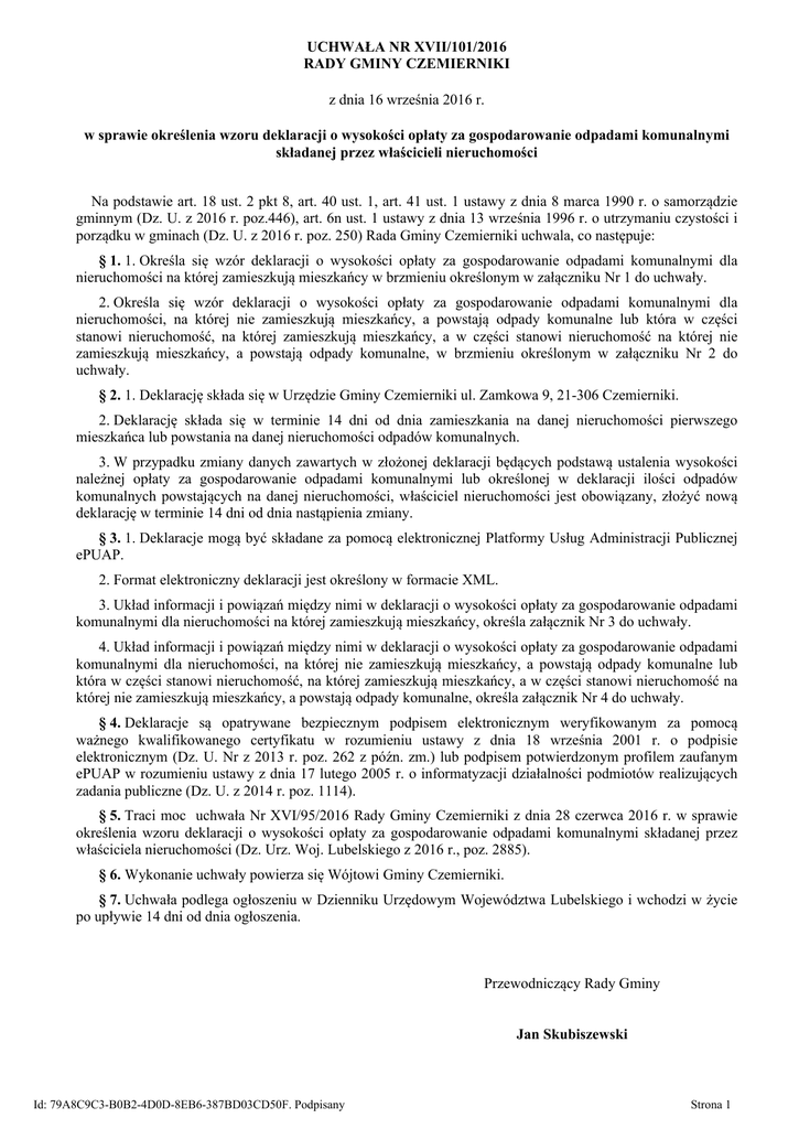 UCHWAŁA NR XVII/101/2016 RADY GMINY CZEMIERNIKI z dnia 16 września 2016 r. w sprawie określenia wzoru deklaracji o wysokości opłaty za gospodarowanie odpadami komunalnymi składanej przez właścicieli nieruchomości Na podstawie art. 18 ust. 2 pkt 8, art. 40 ust. 1, art. 41 ust. 1 ustawy z dnia 8 marca 1990 r. o samorządzie gminnym (Dz. U. z 2016 r. poz.446), art. 6n ust. 1 ustawy z dnia 13 września 1996 r. o utrzymaniu czystości i porządku w gminach (Dz. U. z 2016 r. poz. 250) Rada Gminy Czemierniki uchwala, co następuje: § 1. 1. Określa się wzór deklaracji o wysokości opłaty za gospodarowanie odpadami komunalnymi dla nieruchomości na której zamieszkują mieszkańcy w brzmieniu określonym w załączniku Nr 1 do uchwały. 2. Określa się wzór deklaracji o wysokości opłaty za gospodarowanie odpadami komunalnymi dla nieruchomości, na której nie zamieszkują mieszkańcy, a powstają odpady komunalne lub która w części stanowi nieruchomość, na której zamieszkują mieszkańcy, a w części stanowi nieruchomość na której nie zamieszkują mieszkańcy, a powstają odpady komunalne, w brzmieniu określonym w załączniku Nr 2 do uchwały. § 2. 1. Deklarację składa się w Urzędzie Gminy Czemierniki ul. Zamkowa 9, 21-306 Czemierniki. 2. Deklarację składa się w terminie 14 dni od dnia zamieszkania na danej nieruchomości pierwszego mieszkańca lub powstania na danej nieruchomości odpadów komunalnych. 3. W przypadku zmiany danych zawartych w złożonej deklaracji będących podstawą ustalenia wysokości należnej opłaty za gospodarowanie odpadami komunalnymi lub określonej w deklaracji ilości odpadów komunalnych powstających na danej nieruchomości, właściciel nieruchomości jest obowiązany, złożyć nową deklarację w terminie 14 dni od dnia nastąpienia zmiany. § 3. 1. Deklaracje mogą być składane za pomocą elektronicznej Platformy Usług Administracji Publicznej ePUAP. 2. Format elektroniczny deklaracji jest określony w formacie XML. 3. Układ informacji i powiązań między nimi w deklaracji o wysokości opłaty za gospodarowanie odpadami komunalnymi dla nieruchomości na której zamieszkują mieszkańcy, określa załącznik Nr 3 do uchwały. 4. Układ informacji i powiązań między nimi w deklaracji o wysokości opłaty za gospodarowanie odpadami komunalnymi dla nieruchomości, na której nie zamieszkują mieszkańcy, a powstają odpady komunalne lub która w części stanowi nieruchomość, na której zamieszkują mieszkańcy, a w części stanowi nieruchomość na której nie zamieszkują mieszkańcy, a powstają odpady komunalne, określa załącznik Nr 4 do uchwały. § 4. Deklaracje są opatrywane bezpiecznym podpisem elektronicznym weryfikowanym za pomocą ważnego kwalifikowanego certyfikatu w rozumieniu ustawy z dnia 18 września 2001 r. o podpisie elektronicznym (Dz. U. Nr z 2013 r. poz. 262 z późn. zm.) lub podpisem potwierdzonym profilem zaufanym ePUAP w rozumieniu ustawy z dnia 17 lutego 2005 r. o informatyzacji działalności podmiotów realizujących zadania publiczne (Dz. U. z 2014 r. poz. 1114). § 5. Traci moc uchwała Nr XVI/95/2016 Rady Gminy Czemierniki z dnia 28 czerwca 2016 r. w sprawie określenia wzoru deklaracji o wysokości opłaty za gospodarowanie odpadami komunalnymi składanej przez właściciela nieruchomości (Dz. Urz. Woj. Lubelskiego z 2016 r., poz. 2885). § 6. Wykonanie uchwały powierza się Wójtowi Gminy Czemierniki. § 7. Uchwała podlega ogłoszeniu w Dzienniku Urzędowym Województwa Lubelskiego i wchodzi w życie po upływie 14 dni od dnia ogłoszenia. Przewodniczący Rady Gminy Jan Skubiszewski Id: 79A8C9C3-B0B2-4D0D-8EB6-387BD03CD50F. Podpisany Strona 1 Załącznik Nr 1 do uchwały Nr XVII/101/2016 Rady Gminy Czemierniki z dnia 16 września 2016 r. DEKLARACJA O WYSOKOŚCI OPŁATY ZA GOSPODAROWANIE ODPADAMI KOMUNALNYMI DLA NIERUCHOMOŚCI, NA KTÓREJ ZAMIESZKUJĄ MIESZKAŃCY Podstawa prawna: Ustawa z dnia 13 września 1996 r. o utrzymaniu czystości i porządku w gminach (Dz. U. z 2016 r., poz. 250) Zobowiązany do złożenia deklaracji: Deklarację zobowiązani są złożyć właściciele nieruchomości, na których zamieszkują mieszkańcy, na terenie Gminy Czemierniki (Deklarację może złożyć także współwłaściciel, użytkownik wieczysty, osoba posiadająca nieruchomość w zarządzie, użytkowaniu lub osoba faktycznie władająca daną nieruchomością) Deklaracje należy złożyć w ciągu 14 dni od dnia zamieszkania na danej nieruchomości lub 14 dni od dnia w którym nastąpiły zmiany danych określonych w deklaracji. Termin składania deklaracji Wójt Gminy Czemierniki Miejsce składania Urząd Gminy w Czemiernikach ul. Zamkowa 9, 21-306 Czemierniki deklaracji i adres WYPEŁNIAĆ NALEŻY JASNE POLA DUŻYMI, DRUKOWANYMI LITERAMI, KOLOREM CZARNYM LUB NIEBIESKIM A. Okoliczności powodujące obowiązek złożenia deklaracji (proszę zaznaczyć stawiając znak „X” w odpowiednim polu) Złożenie pierwszej deklaracji Nowa deklaracja Korekta deklaracji (powstanie obowiązku od dnia (zmiana danych od dnia ……………............................................) ………………………….…............................) B. Składający deklarację (zaznaczyć jedno pole znakiem „X”) Właściciel nieruchomości Użytkownik wieczysty nieruchomości Osoba posiadająca nieruchomość w zarządzie, użytkowaniu lub faktycznie nią władająca Współwłaściciel / współposiadacz/ współużytkownik nieruchomości Zarządca nieruchomości (w przypadku nieruchomości zabudowanej budynkami wielolokalowymi, w których ustanowiono odrębną własność lokali i został ustanowiony zarząd nieruchomością wspólną) C. Dane składającego deklarację i dane nieruchomości (proszę zaznaczyć, stawiając znak „X” w odpowiednim polu, miejsca w których dane należy wpisać, proszę wypełnić dużymi, drukowanymi literami) Osoba fizyczna Osoba prawna Jednostka organizacyj