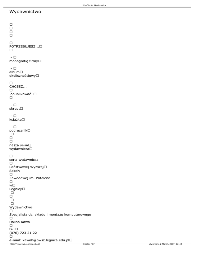 Wspólnota Akademicka Wydawnictwo POTRZEBUJESZ... - monografię firmy - album okolicznościowy CHCESZ... opublikować - skrypt - książkę - podręcznik nasza seria wydawnicza seria wydawnicza Państwowej Wyższej Szkoły Zawodowej im. Witelona w Legnicy Wydawnictwo Specjalista ds. składu i montażu komputerowego Halina Kawa tel. (076) 723 21 22 e-mail: [email protected] http://www.wa.legnica.edu.pl Kreator PDF Utworzono 2 March, 2017, 12:44 Wspólnota Akademicka Specjalista ds. składu i montażu komputerowego Waldemar Gajaszek tel. (076) 723 21 29 e-mail: [email protected] Wydawnictwo Stowarzyszenia na Rzecz Rozwoju Państwowej Wyższej Szkoły Zawodowej im. Witelona w Legnicy "Wspólnota Akademicka" publikuje książki o charakterze dydaktycznym oraz będące wynikiem działalności naukowo-badawczej specjalistów różnych dziedzin naukowych. Autorami naszych książek są m.in. wykładowcy Państwowej Wyższej Szkoły Zawodowej im. Witelona w Legnicy oraz innych ośrodków akademickich. Nakładem wydawnictwa ukazują się książki popularno-naukowe, skrypty, zeszyty naukowe, materiały źródłowe, konferencyjne oraz publikacje informacyjne. W serii wydawniczej Państowej Wyższej Szkoły Zawodowej im. Witelona w Legnicy oferujemy Państwu najnowsze publikacje z dziedziny zarządzania, ekonomii, marketingu, prawa, historii i ochrony środowiska. Podstawy prawa cywilnego. Cześć ogólna. Prawo rzeczowe E. Biegun, J. Jezioro, T. Kierzyk, K. Smolny wyd. 1 2004, obj. 152 str. cena: 25 zł SMS - Skrypt minimum studenta - czyli repetytorium przed sesją I. Bernatek-Zaguła, I. Biedroń, wyd. 1 2003 r., obj. 40 str. http://www.wa.legnica.edu.pl Kreator PDF Utworzono 2 March, 2017, 12:44 Wspólnota Akademicka cena: 10 zł Gry i zabawy integracyjne T. Fąk, A. Kaik-Woźniak Wydanie: 1 (2005 r.) Objętość: 90 str. ISBN:83-89102-28-5 Cena: 20 zł Oblicza demokracji. Demokracja lokalna a demokracja globalna R. Herbut, R. Kropiwnicki, K. Rogaczewska, M. Zawadka, Wydanie: 1 (2003 r.) Objętość: 95 str. ISBN: 83-89102-22-6 Cena: 19,50 zł http://www.wa.legnica.edu.pl Kreator PDF Utworzono 2 March, 2017, 12:44 Wspólnota Akademicka Indywidualne prawo pracy w praktyce i teorii J. Żolyński wyd. 1 2005 r., obj., 180 str. cena: 40 zł Historia instytucji politycznych K. Jaworska, S. Dąbrowski wyd. 1 2005 r., obj. 144 str. cena: 30 zł Polska myśl polityczna XX wieku - wybór tekstów źródłowych z komentarzem J. Juchnowski, W. Kalicki, J. Tomaszewski wyd. 1 2003 r., obj. 248 str. tom I. od końca XIX wieku do 1939 r. cena: 25 zł Systemy operacyjne Windows oraz Microsoft Office 2000 w praktyce, Renata Supranowicz, Leszek Łozowski http://www.wa.legnica.edu.pl Kreator PDF Utworzono 2 March, 2017, 12:44 Wspólnota Akademicka W niniejszym opracowaniu autorzy chcieli ujednolicić zakres materiału przekazywany podczas zajęć z podstaw informatyki i technologii iformacyjnej na kierunkach innych niż informatyka. Do skryptu dołączona jest płyta CD-ROM z gotowymi plikami do ćwiczeń. Opisy ich wykonania znajdują się w podręczniku. Postarano się zaspokoić potrzeby studentów różnych specjalności, realizujących inne godzinowo programy nauczania. Sądzimy, że skrypt może być pomocą w nauczaniu, jak również źródłem wielu porad praktycznych. Autorzy są nie tylko nauczycielami, ale realizują wiele zadań w kontaktach z różnorodnymi grupami użytkowników komputerów, stąd w skrypcie dużo wskazówek z życia wziętych. Wydanie: 1 (2005 r.) Objętość: 248 str. ISBN: 83-89102-41-2 Cena: 25 zł Podstawy wspólnotowego prawa europejskiego dla administratywistów. Zagadnienia podstawowe J. Helios, W. Jedlecka Wydanie: 1 (2005 r.) Objętość: 132 str. ISBN: 83-89102-43-9 Cena: 25 zł Przedsiębiorczość studentów teoria i praktyka Krzysztof http://www.wa.legnica.edu.pl Kreator PDF Utworzono 2 March, 2017, 12:44 Wspólnota Akademicka Safin Wydanie: 1 (2005 r.) Objętość: 103 str. ISBN: 83-89102-44-7 Przedmioty humanistyczne w gimnazjum M. J. Zajączkowska wyd. 1 2002 r., obj. 176 str. cena: 15 zł Wybrane procesy społeczne i ekonomiczne rozwoju Polski na przełomie XX i XXI wieku J. Zarzeczny (red.) wyd. 1 2004 Podstawy prawa pracy. Zarys wykładu J. Żołyński, L. Szot wyd. 1 2002 r., obj. 192 str. cena: 30 zł http://www.wa.legnica.edu.pl Kreator PDF Utworzono 2 March, 2017, 12:44 Wspólnota Akademicka Analiza kosztów kształcenia w szkołach wyższych H. Miłosz wyd. 1 2003 r., obj. 172 str. cena: 30 zł Prawo konsumenckie T. Kierzyk, , wyd. 1 2002 r., obj. 183 str. cena: 30 zł Zarządzanie kadrami M. W. Kopertyńska wyd. 1 2002 r., obj. 88 str. cena: 30 zł Poziomy aktywności Polski w środowisku międzynarodowym T. Łoś-Nowak, A. Dudek (red.) wyd. 1 2002 cena: 36 zł Kierunki i uwarunkowania wykorzystania środków Funduszu Ochrony Środowiska i Gospodarki Wodnej przez beneficjentów w województwie dolnośląskim K. Safin (red.) http://www.wa.legnica.edu.pl Kreator PDF Utworzono 2 March, 2017, 12:44 Wspólnota Akademicka wyd. 1 2003 Regionalne uwarunkowania rozwoju przedsiębiorczości K. Safin, wyd. 1 2003 Edukacja w PWSZ w środowisku międzynarodowym J. Sroka (red.) wyd. 1 2002 r. Witelon. Życie i działalność naukowa. Materiały z konferencji naukowej 25 października 2003, 2004 Zarządzanie przedsiębiorstwem - teoria i praktyka Książka z serii wydawniczej Wyższej Szkoły Zawodowej w Legnicy Krajoznawstwo na Dolnym Śląsku red. Jerzy Wyrzykowski i Ryszard Błacha http://www.wa.legnica.edu.pl Kreator PDF Utworzono 2 March, 2017, 12:44 Wspólnota Akademicka Legnica jako ośrodek naukowy - tradycje i współczesność Kazimiera Jaworska W Y D A W N I C T W O http://www.wa.legnica.edu.pl Kreator PDF Utworzono 2 March, 2017, 12:44