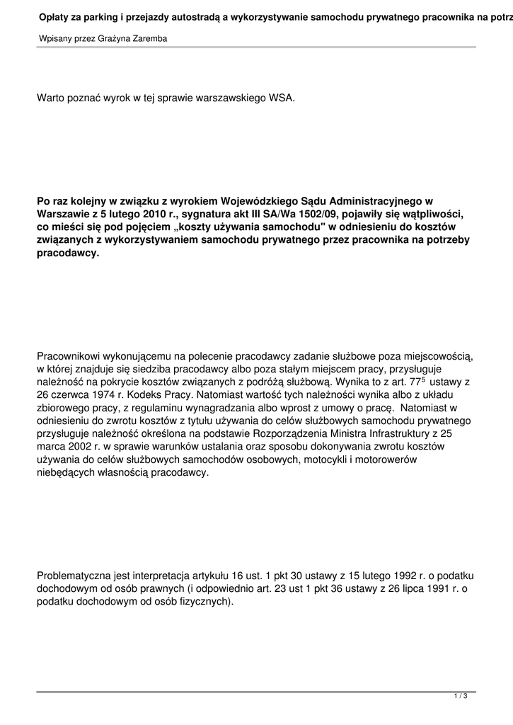 Opłaty za parking i przejazdy autostradą a wykorzystywanie samochodu prywatnego pracownika na potrz Wpisany przez Grażyna Zaremba Warto poznać wyrok w tej sprawie warszawskiego WSA. Po raz kolejny w związku z wyrokiem Wojewódzkiego Sądu Administracyjnego w Warszawie z 5 lutego 2010 r., sygnatura akt III SA/Wa 1502/09, pojawiły się wątpliwości, co mieści się pod pojęciem „koszty używania samochodu" w odniesieniu do kosztów związanych z wykorzystywaniem samochodu prywatnego przez pracownika na potrzeby pracodawcy. Pracownikowi wykonującemu na polecenie pracodawcy zadanie służbowe poza miejscowością, w której znajduje się siedziba pracodawcy albo poza stałym miejscem pracy, przysługuje należność na pokrycie kosztów związanych z podróżą służbową. Wynika to z art. 77 5 ustawy z 26 czerwca 1974 r. Kodeks Pracy. Natomiast wartość tych należności wynika albo z układu zbiorowego pracy, z regulaminu wynagradzania albo wprost z umowy o pracę. Natomiast w odniesieniu do zwrotu kosztów z tytułu używania do celów służbowych samochodu prywatnego przysługuje należność określona na podstawie Rozporządzenia Ministra Infrastruktury z 25 marca 2002 r. w sprawie warunków ustalania oraz sposobu dokonywania zwrotu kosztów używania do celów służbowych samochodów osobowych, motocykli i motorowerów niebędących własnością pracodawcy. Problematyczna jest interpretacja artykułu 16 ust. 1 pkt 30 ustawy z 15 lutego 1992 r. o podatku dochodowym od osób prawnych (i odpowiednio art. 23 ust 1 pkt 36 ustawy z 26 lipca 1991 r. o podatku dochodowym od osób fizycznych). 1/3 Opłaty za parking i przejazdy autostradą a wykorzystywanie samochodu prywatnego pracownika na potrze Wpisany przez Grażyna Zaremba Wskazane przepisy ograniczają możliwość zaliczenia do kosztów uzyskania przychodów przez pracodawcę wydatków na rzecz pracowników z tytułu użytkowania przez nich samochodów prywatnych na potrzeby pracodawcy - podatnika. W odniesieniu do podróży służbowej do wysokości przekraczającej kwotę ustaloną z zastosowaniem stawki za kilometr przebiegu pojazdu, a w jazdach lokalnych do wysokości przekraczającej miesięczny ryczałt albo kwotę wynikającą z prowadzonej ewidencji przebiegu pojazdu. We wskazanym wyroku WSA orzekł, iż koszty związane z użytkowaniem samochodu obejmują wszelkie wydatki, jakie ponosi pracownik, a które związane są z możliwością zrealizowania polecenia służbowego wydanego przez pracodawcę poprzez wykorzystanie przez niego samochodu prywatnego do tego celu. Problem dotyczył wydatków ponoszonych na opłaty za autostrady i parkowanie. Sąd uznał, iż kwoty te są ściśle powiązane z używaniem samochodu i mogą być zaliczane do kosztów tylko w ramach limitu wynikającego z liczby przejechanych kilometrów. Znaczyłoby to, że jeśli pracownik realizuje polecenie służbowe wykorzystując do tego celu samochód służbowy, to wydatki związane z opłatą za parking czy autostradę zostaną mu zwrócone, ale jeśli to samo zadanie realizuje wykorzystując do tego celu samochód prywatny, to sam musi ponieść koszty związane z tymi wydatkami. A przecież wydaje się, że przyznany limit powinie odnosić się jedynie to technicznych możliwości wykorzystania samochodu, tj. jego zużycia jako urządzenia, czy kosztów paliwa, które jest niezbędne, aby samochód funkcjonował oraz tych związanych z prawem własności - jak ubezpieczenie czy konserwacja. 2/3 Opłaty za parking i przejazdy autostradą a wykorzystywanie samochodu prywatnego pracownika na potrze Wpisany przez Grażyna Zaremba Należy podkreślić również to, że problem związany z opłatami za parkowanie jest problemem w wielu dużych miastach, nie występuje natomiast w mniejszych miejscowościach. Założenie, że tylko niektórzy użytkownicy samochodów prywatnych do celów służbowych (ci z dużych miast, gdzie nie ma możliwości parkowania na miejscach bezpłatnych) będą musieli uwzględniać te wydatki w limicie, nasuwa wątpliwość czy będziemy mieli do czynienia z równym traktowaniem podatników. Również w odniesieniu do opłat za autostrady problem ten będzie narastał wraz z rozwojem infrastruktury dróg. Może okazać się, że także w celu wykonania polecenia służbowego w miejscowości poza miejscem pracy nie będzie można zrealizować go w inny sposób, jak korzystając z płatnych autostrad. I tu znowu może nasuwać się wątpliwość, co wtedy? Czy podatnik, który z tytułu takiego przejazdu będzie musiał ponieść taki wydatek i który dokonując zwrotu pracownikowi nie będzie mógł ich zakwalifikować do kosztów uzyskania przychodów, będzie traktowany na równi z takim, u którego z racji lokalizacji siedziby i prowadzonej działalności gospodarczej sytuacje takie nie wystąpią. Jak widać problem z możliwością zakwalifikowania do kosztów uzyskania przychodów wydatków na opłaty parkingowe i za korzystanie z autostrady poza limitem wynikającym z rozporządzenia Ministra Infrastruktury jest problemem, który będzie się zwiększał i prawdopodobnie jeszcze nie jeden raz zarówno organy skarbowe, jak i sądy administracyjne będą zajmowały się tą sprawą. 3/3