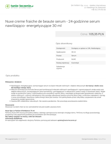 SK-FARM II Sp. z o.o. - Apteka Internetowa ul. Kleeberga 34, Białystok +48 42 279 40 05 Nuxe creme fraiche de beaute serum - 24-godzinne serum nawilżająco- energetyzujące 30 ml Cena: 105,35 PLN Opis słownikowy Dostępność Dostępny w aptece w 24h, Niedostępny Opakowanie 30 ml Postać Serum Producent NUXE Rodzaj rejestracji Kosmetyk Substancja czynna - Opis produktu Wskazania i działanie Nawilżające, energetyzujące, wzmacniające serum na bazie mleczek roślinnych i olejków eterycznych do twarzy i okolic oczu dla każdego rodzaju skóry. Mleczno-aromatyczna formuła Serum jest kombinacją 8 mleczek roślinnych nawilżających i ograniczających utratę wody oraz olejków eterycznych, zmniejszających stres komórkowy i pomagających w odtwarzaniu rezerw wody w warstwach skóry. Wiąże wodę na powierzchni skóry i rozprowadza ją do wszystkich warstw skóry, nawilżając ją długotrwale (granatowiec właściwy, 5 soków roślinnych i roślinne mikroplastry) oraz pomaga odbudować barierę ochronną skóry (olej z orzechów makadamii i wyciąg z owsa szorstkiego). Nawilżona i pełna energii skóra jest świeża i lśni pełnią blasku przez całą dobę, a pojawianie się oznak zmęczenia zostaje ograniczone. Zawiera 89% składników naturalnych. Nie zawiera parabenów. Nie powoduje powstawania zaskórników. Stosowanie Stosować na dzień i/lub na noc samodzielnie lub pod zwykle używany krem. Nuxe Spa Le Parfum d'Ambiance 75 ml Perfumy Nuxe SPA tworzą atmosferę relaksu i dobrego samopoczucia wewnątrz twojego domu. Perfumy na długo pozostawiają przyjemną nutę zapachową podobną do produktów serii Nirvanesque. Nie należy rozpylać na twarzy, ciele lub włosach. Informacje dodatkowe W razie pytań lub wątpliwości służymy Państwu pomocą pod adresem [email protected]. Plik wygenerowano: 02-03-2017 Powered by TCPDF (www.tcpdf.org) Oprogramowanie sklepu: AptusShop