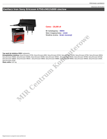 Informacje o produkcie Utworzono 02-03-2017 Zasilacz Iron Sony Ericsson k750/c902/k800 sieciow Cena : 10,00 zł om pu te r ow e Nr katalogowy : 9894 Stan magazynowy : niski Średnia ocena : brak recenzji M IR C en tr um K Typ opcji do telefonu GSM: Ładowarka Kompatybilne telefony: Sony-Ericsson D750i, Sony-Ericsson J200i, Sony-Ericsson K310i, Sony-Ericsson K550i, Sony-Ericsson K750i, Sony-Ericsson K810i, Sony-Ericsson M600i, Sony-Ericsson W200i, Sony-Ericsson W300i, Sony-Ericsson W550 , Sony-Ericsson W610i, Sony-Ericsson W700i, Sony-Ericsson W710i, Sony-Ericsson W800i, Sony-Ericsson W810i , Sony-Ericsson W850, Sony-Ericsson W880i, Sony-Ericsson W900i, Sony-Ericsson W950i, Sony-Ericsson Z520i, Sony-Ericsson Z530 Masa netto: 0,07 kg Wygenerowano w programie www.oscGold.com