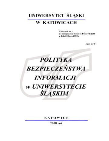 UNIWERSYTET ŚLĄSKI W KATOWICACH Załącznik nr 1 do zarządzenia Rektora UŚ nr 45/2008 z dnia 22 lipca 2008 r. Egz. nr 0 POLITYKA BEZPIECZEŃSTWA INFORMACJI w UNIWERSYTECIE ŚLĄSKIM KAT O W I C E 2008 rok Opracowanie: mgr inż. Witold Cybulski - Pełnomocnik Rektora ds. Danych Osobowych mgr Maciej Uhlig – Administrator Bezpieczeństwa Informacji mgr Agata Kołodziejczyk - Pełnomocnik Lokalnego Administratora Danych WIiNoM mgr Piotr Kołodziejczyk - Lokalny Administrator Bezpieczeństwa Informacji WNoZ 2 Spis treści: I. Wstęp.........................................................................................................................4 II. Postanowienia ogólne..............................................................................................5 1. DEFINICJE............................................................................................................................................5 2. CEL....................................................................................................................................................6 3. ZAKRES STOSOWANIA.............................................................................................................................7 III. Organizacja przetwarzania danych osobowych.................................................7 1. ADMINISTRATOR DANYCH OSOBOWYCH......................................................................................................7 2. LOKALNI ADMINISTRATORZY DANYCH OSOBOWYCH......................................................................................7 3. PEŁNOMOCNIK REKTORA DS. DANYCH OSOBOWYCH..................................................................................8 4. PEŁNOMOCNICY LOKALNYCH ADMINISTRATORÓW DANYCH.........................................................................9 5. ADMINISTRATOR BEZPIECZEŃSTWA INFORMACJI........................................................................................10 6. PRZETWARZANIE DANYCH OSOBOWYCH...................................................................................................10 7. UPOWAŻNIENIE DO PRZETWARZANIA DANYCH...........................................................................................11 8. UDOSTĘPNIANIE DANYCH OSOBOWYCH....................................................................................................11 9. INSTRUKCJE........................................................................................................................................12 IV. Infrastruktura przetwarzania danych osobowych...........................................12 1. OBSZAR PRZETWARZANIA DANYCH OSOBOWYCH.......................................................................................12 2. SYSTEM INFORMATYCZNY.....................................................................................................................12 3. ZBIORY DANYCH.................................................................................................................................12 4. EWIDENCJE.........................................................................................................................................13 V. Struktura zbiorów danych, sposób przepływu danych w systemie i zakres przetwarzania danych........................................................................................13 VI. Strategia zabezpieczenia danych osobowych (działania niezbędne do zapewnienia poufności, integralności i rozliczalności przetwarzanych danych)........13 1. BEZPIECZEŃSTWO OSOBOWE..................................................................................................................13 2. STREFY BEZPIECZNEGO PRZETWARZANIA DANYCH OSOBOWYCH....................................................................14 3. ZABEZPIECZENIE SPRZĘTU.....................................................................................................................14 4. ZABEZPIECZENIA WE WŁASNYM ZAKRESIE................................................................................................15 5. POSTĘPOWANIE Z NOŚNIKAMI I ICH BEZPIECZEŃSTWO.................................................................................17 6. WYMIANA DANYCH I ICH BEZPIECZEŃSTWO..............................................................................................17 7. KONTROLA DOSTĘPU DO SYSTEMU..........................................................................................................18 8. KONTROLA DOSTĘPU DO SIECI................................................................................................................18 9. KOMPUTERY PRZENOŚNE I PRACA NA ODLEGŁOŚĆ......................................................................................19 10. MONITOROWANIE DOSTĘPU DO SYSTEMU I JEGO UŻYCIA...........................................................................19 11. PRZEGLĄDY OKRESOWE ZAPOBIEGAJĄCE NARUSZENIOM OBOWIĄZKU SZCZEGÓLNEJ STARANNOŚCI ADMINISTRATORA DANYCH (ART. 26 UST. 1 USTAWY).....................................................................................................................20 12. UDOSTĘPNIANIE DANYCH OSOBOWYCH..................................................................................................21 13. ODPOWIEDZIALNOŚĆ OSÓB UPOWAŻNIONYCH DO PRZETWARZANIA DANYCH OSOBOWYCH................................22 VII. Przeglądy polityki bezpieczeństwa i audyty systemu.....................................22 VIII. Postanowienia końcowe...................................................................................22 IX. Załączniki – na płycie CD...................................................................................23 3 I. Wstęp Uniwersytet Śląski jest administratorem danych osobowych w rozumieniu przepisów ustawy o ochronie danych osobowych, a czynności w sprawach z zakresu ochrony danych osobowych wykonuje Rektor i jest zobowiązany do 