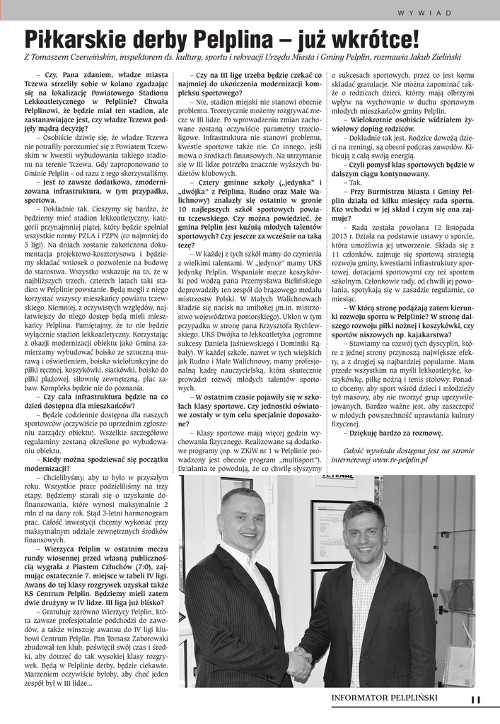 w y w i a d Piłkarskie derby Pelplina – już wkrótce! Z Tomaszem Czerwińskim, inspektorem ds. kultury, sportu i rekreacji Urzędu Miasta i Gminy Pelplin, rozmawia Jakub Zieliński – Czy, Pana zdaniem, władze miasta Tczewa strzeliły sobie w kolano zgadzając się na lokalizację Powiatowego Stadionu Lekkoatletycznego w Pelplinie? Chwała Pelplinowi, że będzie miał ten stadion, ale zastanawiające jest, czy władze Tczewa podjęły mądrą decyzję? – Osobiście dziwię się, że władze Tczewa nie potrafiły porozumieć się z Powiatem Tczewskim w kwestii wybudowania takiego stadionu na terenie Tczewa. Gdy zaproponowano to Gminie Pelplin – od razu z tego skorzystaliśmy. – Jest to zawsze dodatkowa, zmodernizowana infrastruktura, w tym przypadku, sportowa. – Dokładnie tak. Cieszymy się bardzo, że będziemy mieć stadion lekkoatletyczny, kategorii przynajmniej piątej, który będzie spełniał wszystkie normy PZLA i PZPN (co najmniej do 3 ligi). Na dniach zostanie zakończona dokumentacja projektowo-kosztorysowa i będziemy składać wniosek o pozwolenie na budowę do starostwa. Wszystko wskazuje na to, że w najbliższych trzech, czterech latach taki stadion w Pelplinie powstanie. Będą mogli z niego korzystać wszyscy mieszkańcy powiatu tczewskiego. Niemniej, z oczywistych względów, najłatwiejszy do niego dostęp będą mieli mieszkańcy Pelplina. Pamiętajmy, że to nie będzie wyłącznie stadion lekkoatletyczny. Korzystając z okazji modernizacji obiektu jako Gmina zamierzamy wybudować boisko ze sztuczną murawą i oświetleniem, boisko wielofunkcyjne do piłki ręcznej, koszykówki, siatkówki, boisko do piłki plażowej, siłownię zewnętrzną, plac zabaw. Kompleks będzie nie do poznania. – Czy cała infrastruktura będzie na co dzień dostępna dla mieszkańców? – Będzie codziennie dostępna dla naszych sportowców (oczywiście po uprzednim zgłoszeniu zarządcy obiektu). Wszelkie szczegółowe regulaminy zostaną określone po wybudowaniu obiektu. – Kiedy można spodziewać się początku modernizacji? – Chcielibyśmy, aby to było w przyszłym roku. Wszystkie prace podzieliliśmy na trzy etapy. Będziemy starali się o uzyskanie dofinansowania, które wynosi maksymalnie 2 mln zł na dany rok. Stąd 3-letni harmonogram prac. Całość inwestycji chcemy wykonać przy maksymalnym udziale zewnętrznych środków finansowych. – Wierzyca Pelplin w ostatnim meczu rundy wiosennej przed własną publicznością wygrała z Piastem Człuchów (7:0), zajmując ostatecznie 7. miejsce w tabeli IV ligi. Awans do tej klasy rozgrywek uzyskał także KS Centrum Pelplin. Będziemy mieli zatem dwie drużyny w IV lidze. III liga już blisko? – Gratuluję zarówno Wierzycy Pelplin, która zawsze profesjonalnie podchodzi do zawodów, a także winszuję awansu do IV ligi klubowi Centrum Pelplin. Pan Tomasz Zaborowski zbudował ten klub, poświęcił swój czas i środki, aby dotrzeć do tak wysokiej klasy rozgrywek. Będą w Pelplinie derby, będzie ciekawie. Marzeniem oczywiście byłoby, aby choć jeden zespół był w III lidze... – Czy na III ligę trzeba będzie czekać co najmniej do ukończenia modernizacji kompleksu sportowego? – Nie, stadion miejski nie stanowi obecnie problemu. Teoretycznie możemy rozgrywać mecze w III lidze. Po wprowadzeniu zmian zachowane zostaną oczywiście parametry trzecioligowe. Infrastruktura nie stanowi problemu, kwestie sportowe także nie. Co innego, jeśli mowa o środkach finansowych. Na utrzymanie się w III lidze potrzeba znacznie wyższych budżetów klubowych. – Cztery gminne szkoły („jedynka” i „dwójka” z Pelplina, Rudno oraz Małe Walichnowy) znalazły się ostatnio w gronie 10 najlepszych szkół sportowych powiatu tczewskiego. Czy można powiedzieć, że gmina Pelplin jest kuźnią młodych talentów sportowych? Czy jeszcze za wcześnie na taką tezę? – W każdej z tych szkół mamy do czynienia z wielkimi talentami. W „jedynce” mamy UKS Jedynkę Pelplin. Wspaniałe mecze koszykówki pod wodzą pana Przemysława Bielińskiego doprowadziły ten zespół do brązowego medalu mistrzostw Polski. W Małych Walichnowach kładzie się nacisk na unihokej (m.in. mistrzostwo województwa pomorskiego). Ukłon w tym przypadku w stronę pana Krzysztofa Rychlewskiego. UKS Dwójka to lekkoatletyka (ogromne sukcesy Daniela Jaśniewskiego i Dominiki Rąbały). W każdej szkole, nawet w tych wiejskich jak Rudno i Małe Walichnowy, mamy profesjonalną kadrę nauczycielską, która skutecznie prowadzi rozwój młodych talentów sportowych. – W ostatnim czasie pojawiły się w szkołach klasy sportowe. Czy jednostki oświatowe zostały w tym celu specjalnie doposażone? – Klasy sportowe mają więcej godzin wychowania fizycznego. Realizowane są dodatkowe programy (np. w ZKiW nr 1 w Pelplinie prowadzony jest obecnie program „multisport”). Działania te powodują, że co chwilę słyszymy o sukcesach sportowych, przez co jest komu składać gratulacje. Nie można zapominać także o rodzicach dzieci, którzy mają olbrzymi wpływ na wychowanie w duchu sportowym młodych mieszkańców gminy Pelplin. – Wielokrotnie osobiście widziałem żywiołowy doping rodziców. – Dokładnie tak jest. Rodzice dowożą dzieci na treningi, są obecni podczas zawodów. Kibicują z całą swoją energią. – Czyli pomysł klas sportowych będzie w dalszym ciągu kontynuowany. – Tak. – Przy Burmistrzu Miasta i Gminy Pelplin działa od kilku miesięcy rada sportu. Kto wchodzi w jej skład i czym się ona zajmuje? – Rada została powołana 12 listopada 2013 r. Działa na podstawie ustawy o sporcie, która umożliwia jej utworzenie. Składa się z 11 członków, zajmuje się sportową strategią rozwoju gminy, kwestiami infrastruktury sportowej, dotacjami sportowymi czy też sportem szkolnym. Członkowie rady, od chwili jej powołania, spotykają się w zasadzie regularnie, co miesiąc. – W którą stronę pod