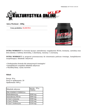 Utworzono: 2017-03-02 13:45:18 Intra Workout - 600g Cena produktu: 92,90 PLN INTRA WORKOUT to formuła łącząca aminokwasy rozgałęzione BCAA, kreatynę, cytrulinę oraz beta-alaninę z kofeiną bezwodną, L-karnityną, tauryną i L-tyrozyną. INTRA WORKOUT to preparat przeznaczony do stosowania podczas treningu, kompleksowo uzupełniający składniki odżywcze. ● ● ● Profesjonalna formuła dla intensywnych treningów! Kompleksowo uzupełnia składniki odżywcze Wysokiej klasy, czysty surowiec Skład: Porcja: 30 g Porcji w opakowaniu: 20 Opakowanie: 600 g Składniki aktywne porcja - 30 g (*RWS) PRO ENERGY FORMULA Maltodekstryny 6300 mg Aminokwasy BCAA 5000 mg w tym L-Leucyna 2500 mg w tym L-Walina 1250 mg w tym L-Izoleucyna 1250 mg Woda kokosowa 1500 mg Jabłaczan Cytruliny 2000 mg w tym L-Cytrulina 1120 mg Jabłczan Kreatyny 3000 mg w tym Kreatyna 2220 mg Tauryna 2000 mg L-Tyrozyna 1500 mg Winian L-Karnityny 1000 mg w tym L-Karnityna 680 mg Beta-Alanina 800 mg Inozyna 666 mg Kofeina bezwodna 120 mg VITAMIN FORMULA Wit. C 82 mg (103%) Tiamina 10 mg (909%) Ryboflawina 10 mg (714%) Niacyna 10 mg (625) Kwas pantotenowy 10 mg (167%) Wit. B6 5 mg (357%) Kwas foliowy 80 µg (40%) Wit. B12 10 µg (400%) Biotyna 10 µg (20%) POWER SUPPLY FORMULA Inozytol 10 mg Kwas p-Aminobenzoesowy 10 mg Dwuwinian Choliny 4,1 mg w tym Cholina 1,68 mg MINERAL FORMULA Potas 1048 mg (52%) Chlorek 800 mg (101%) Sód 524 mg Magnez 190 mg (51%) Wapń 125 mg (16%) SKŁADNIKI: PRO ENERGY FORMULA [maltodekstryny; aminokwasy rozgałęzione (L-leucyna; L-walina; L-izoleucyna); woda kokosowa; jabłczan cytruliny; jabłczan kreatyny; tauryna, L-tyrozyna; winian L-karnityny; beta-alanina; inozyna; kofeina bezwodna]; VITAMIN FORMULA [wit. C (kwas L-askorbinowy); tiamina (monoazotan tiaminy); ryboflawina; niacyna (amid kwasu nikotynowego); kwas pantotenowy (D-pantotenian wapnia); wit. B6 (chlorowodorek pirydoksyny); kwas foliowy (kwas pteroilomonoglutaminowy); wit. B12 (cyjanokobalamina); biotyna (D-biotyna)]; POWER SUPPLY FORMULA [inozytol; kwas P-aminobenzoesowy; dwuwinian choliny]; MINERAL FORMULA [potas (węglan potasu); chlorek (chlorek sodu); sód (chlorek sodu); magnez (węglan magnezu); wapń (fosforan wapnia)]; aromaty; substancje zagęszczające – guma celulozowa, guma ksantanowa; substancja słodząca – sukraloza. Referencyjna wartość spożycia dla przeciętnej osoby dorosłej (8 400 kJ/2 000 kcal). Suplementy diety nie mogą być stosowane jako substytut zróżnicowanej diety. Pamiętaj, że tylko zdrowy tryb życia i zrównoważony sposób odżywiania zapewniają prawidłowe funkcjonowanie organizmu i zachowanie dobrej kondycji. Dawkowanie: Zalecana dzienna porcja do spożycia to 30 g (4,5 miarki). Nie przekraczać zalecanej porcji do spożycia w ciągu dnia. Produkt nie może być stosowany przez osoby uczulone na którykolwiek z jego składników. Przechowywać w miejscu niedostępnym dla małych dzieci. Przechowywać w miejscu suchym w temperaturze pokojowej w szczelnie zamkniętych opakowaniach. Masa netto opakowania: 600 g Adres: http://www.ko.sklep.pl/ Telefon: kom. 782 010 880 Email: [email protected]