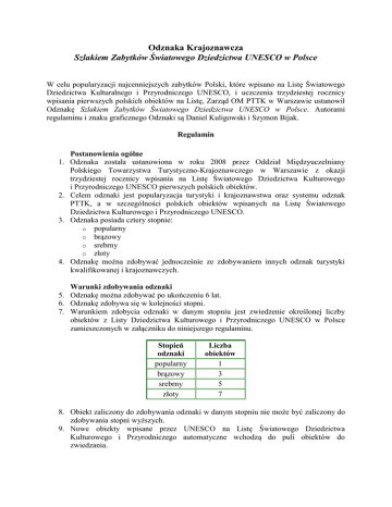Odznaka Krajoznawcza Szlakiem Zabytków Światowego Dziedzictwa UNESCO w Polsce W celu popularyzacji najcenniejszych zabytków Polski, które wpisano na Listę Światowego Dziedzictwa Kulturalnego i Przyrodniczego UNESCO, i uczczenia trzydziestej rocznicy wpisania pierwszych polskich obiektów na Listę, Zarząd OM PTTK w Warszawie ustanowił Odznakę Szlakiem Zabytków Światowego Dziedzictwa UNESCO w Polsce. Autorami regulaminu i znaku graficznego Odznaki są Daniel Kuligowski i Szymon Bijak. Regulamin 1. 2. 3. 4. Postanowienia ogólne Odznaka została ustanowiona w roku 2008 przez Oddział Międzyuczelniany Polskiego Towarzystwa Turystyczno-Krajoznawczego w Warszawie z okazji trzydziestej rocznicy wpisania na Listę Światowego Dziedzictwa Kulturowego i Przyrodniczego UNESCO pierwszych polskich obiektów. Celem odznaki jest popularyzacja turystyki i krajoznawstwa oraz systemu odznak PTTK, a w szczególności polskich obiektów wpisanych na Listę Światowego Dziedzictwa Kulturowego i Przyrodniczego UNESCO. Odznaka posiada cztery stopnie: o popularny o brązowy o srebrny o złoty Odznakę można zdobywać jednocześnie ze zdobywaniem innych odznak turystyki kwalifikowanej i krajoznawczych. Warunki zdobywania odznaki 5. Odznakę można zdobywać po ukończeniu 6 lat. 6. Odznakę zdobywa się w kolejności stopni. 7. Warunkiem zdobycia odznaki w danym stopniu jest zwiedzenie określonej liczby obiektów z Listy Dziedzictwa Kulturowego i Przyrodniczego UNESCO w Polsce zamieszczonych w załączniku do niniejszego regulaminu. Stopień odznaki popularny brązowy srebrny złoty Liczba obiektów 1 3 5 7 8. Obiekt zaliczony do zdobywania odznaki w danym stopniu nie może być zaliczony do zdobywania stopni wyższych. 9. Nowe obiekty wpisane przez UNESCO na Listę Światowego Dziedzictwa Kulturowego i Przyrodniczego automatyczne wchodzą do puli obiektów do zwiedzania. 10. Przy zdobywaniu kolejnych stopni odznaki nie ma ograniczeń czasowych. Weryfikacja 11. Podstawą do weryfikacji odznaki jest kronika zwiedzanych obiektów, którą można prowadzić w dowolnej formie. W przypadku formy elektronicznej kronikę należy zapisać na trwałym nośniku, np. płyta CD. 12. W kronice powinny znaleźć się następujące informacje: imię i nazwisko oraz data i miejsce urodzenia zdobywającego, nazwa obiektu oraz potwierdzenie zwiedzania w dowolnej formie np. zdjęcia na tle obiektu, pieczątka, bilet wstępu lub podpis członka kadry programowej PTTK, w szczególności Instruktora Krajoznawstwa PTTK. 13. Odznakę weryfikują i przyznają zatwierdzone przez Komisję Krajoznawczą ZG PTTK zespoły weryfikacyjne mające prawo nadawania Regionalnej Odznaki Krajoznawczej PTTK. Postanowienia końcowe 14. Dystrybucję odznak prowadzi Oddział Międzyuczelniany PTTK w Warszawie (adres korespondencyjny Senatorska 11, 00-075 Warszawa). 15. Interpretacja niniejszego regulaminu przysługuje Zarządowi Oddziału Międzyuczelnianego PTTK w Warszawie Regulamin zatwierdzony przez ZG PTTK 29 marca 2009 r. Wykaz obiektów Stare Miasto i Kazimierz w Krakowie Zabytkowa kopalnia soli w Wieliczce Niemiecki nazistowski obóz koncentracyjny i zagłady Auschwitz-Birkenau w Oświęcimiu Białowieski Park Narodowy Stare Miasto w Warszawie Stare Miasto w Zamościu Średniowieczny zespół miejski Torunia Zamek Krzyżacki w Malborku Kalwaria Zebrzydowska Kościół Pokoju w Jaworze Kościół Pokoju w Świdnicy Drewniany kościół w Binarowej Drewniany kościół w Bliznem Drewniany kościół w Dębnie Podhalańskiem Drewniany kościół w Haczowie Drewniany kościół w Lipnicy Murowanej Drewniany kościół w Sękowej Park Mużakowski w Łęknicy/ Bad Muskau Hala Stulecia (Hala Ludowa) we Wrocławiu Regulamin i znak graficzny opracowali: Daniel Kuligowski, Szymon Bijak