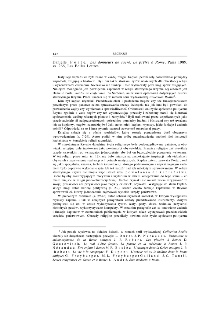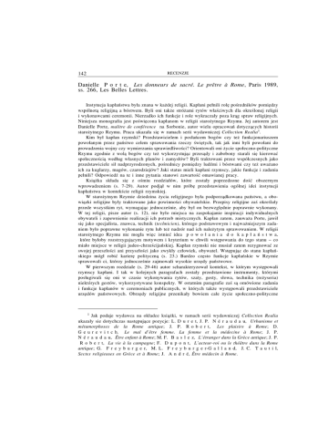 142 RECENZJE Danielle P o r t e, Les donneurs de sacré. Le prêtre à Rome, Paris 1989, ss. 266, Les Belles Lettres. Instytucja kapłaństwa była znana w każdej religii. Kapłani pełnili role˛ pośredników pomie˛dzy wspólnota˛ religijna˛ a bóstwem. Byli oni także stróżami rytów właściwych dla określonej religii i wykonawcami ceremonii. Nierzadko ich funkcje i role wykraczały poza krag ˛ spraw religijnych. Niniejsza monografia jest poświe˛cona kapłanom w religii starożytnego Rzymu. Jej autorem jest Danielle Porte, maîitre de conférence na Sorbonie, autor wielu opracowań dotyczacych ˛ historii starożytnego Rzymu. Praca ukazała sie˛ w ramach serii wydawniczej Collection Realia1. Kim był kapłan rzymski? Przedstawicielem i posłańcem bogów czy też funkcjonariuszem powołanym przez państwo celem sprawowania rzeczy świe˛tych, tak jak inni byli powołani do prowadzenia wojny czy wymierzania sprawiedliwości? Orientowali oni życie społeczno-polityczne Rzymu zgodnie z wola˛ bogów czy też wykorzystujac ˛ przesady ˛ i zabobony starali sie˛ kierować społecznościa˛ według własnych planów i zamysłów? Byli traktowani przez współczesnych jako przedstawiciele sił nadprzyrodzonych, pośrednicy pomie˛dzy ludźmi i bóstwami czy też uważano ich za kuglarzy, magów, czarodziejów? Jaki status mieli kapłani rzymscy, jakie funkcje i zadania pełnili? Odpowiedź na te i inne pytania stanowi zawartość omawianej pracy. Ksiażka ˛ składa sie˛ z ośmiu rozdziałów, które zostały poprzedzone dość obszernym wprowadzeniem (s. 7-29). Autor podjał ˛ w nim próbe˛ przedstawienia ogólnej idei instytucji kapłaństwa w kontekście religii rzymskiej. W starożytnym Rzymie dziedzina życia religijnego była podporzadkowana ˛ państwu, a obowiazki ˛ religijne były traktowane jako powinności obywatelskie. Przepisy religijne zaś określały przede wszystkim ryt, wymagajac ˛ jednocześnie, aby był on bezwzgle˛dnie poprawnie wykonany. W tej religii, pisze autor (s. 12), nie było miejsca na zaspokajanie inspiracji indywidualnych obywateli i zapewnienie realizacji ich potrzeb mistycznych. Kapłan zatem, zauważa Porte, jawił sie˛ jako specjalista, znawca, technik (technicien), którego podstawowym i najważniejszym zadaniem było poprawne wykonanie rytu lub też nadzór nad ich należytym sprawowaniem. W religii starożytnego Rzymu nie mogła wie˛c istnieć idea p o w o ł a n i a d o k a p ł a ń s t w a, które byłoby rozstrzygajacym ˛ motywem i kryterium w chwili wste˛powania do tego stanu − co miało miejsce w religii judeo-chrześcijańskiej. Kapłan rzymski nie musiał zatem rezygnować ze swojej przeszłości ani przyszłości jako zwykły człowiek, obywatel. Wste˛pujac ˛ do stanu kapłańskiego mógł robić kariere˛ polityczna˛ (s. 23.) Bardzo cze˛sto funkcje kapłańskie w Rzymie sprawowali ci, którzy jednocześnie zajmowali wysokie urze˛dy państwowe. W pierwszym rozdziale (s. 29-46) autor scharakteryzował kontekst, w którym wyste˛powali rzymscy kapłani. I tak w kolejnych paragrafach zostały przedstawione instrumenty, którymi posługiwali sie˛ oni w czasie wykonywania rytów, szaty, gesty, słowa, technika (reżyseria) niektórych gestów, wykorzystywane konspekty. W ostatnim paragrafie zaś sa˛ omówione zadania i funkcje kapłanów w ceremoniach publicznych, w których także wyste˛powali przedstawiciele urze˛dów państwowych. Obrze˛dy religijne przenikały bowiem całe życie społeczno-polityczne 1 Jak podaje wydawca na okładce ksiażki, ˛ w ramach serii wydawniczej Collection Realia ukazały sie dotychczas naste˛pujace ˛ pozycje: L. D u r e t, J. P. N é r a u d a u, Urbanisme et métamorphoses de la Rome antique; J. P. R o b e r t, Les plaisirs à Rome; D. G e u r e v i t c h. Le mal d’être femme. La femme et la médecine à Rome; J. P. N é r a u d a u, Être enfant à Rome; M. F. B a s l e z, L’étranger dans la Grèce antique; J. P. R o b e r t, La vie à la campagne; F. D u p o n t, L’acteur-roi ou le théâtre dans la Rome antique; G. F r e y b u r g e r, M. L. F r e y b u r g e r-G a l l a n d, J. C. T a u t i l, Sectes religieuses en Grèce et à Rome; J. A n d r é, Être médecin à Rome. RECENZJE 143 państwa rzymskiego tak bardzo, że niekiedy nie można było stwierdzić, gdzie kończyły sie˛ sprawy religijne, a zaczynały państwowe. Przedstawiciele urze˛dów państwowych, sprawujac ˛ akty publiczne w obecności, i przy współudziale kapłanów, także dokonywali pewnych gestów sakralnych. Przedmiotem rozważań autora jest przeto granica pomie˛dzy obszarem działania kapłanów i organów władzy państwowej, mie˛dzy czynnikiem religijnym i świeckim w życiu państwa. Rozdział drugi (s. 47-76) zawiera omówienie historii struktur organizacyjnych różnych kolegiów kapłańskich. Swoja˛ uwage˛ autor skupił jednakże na kolegium pontyfików, które odgrywało istotna˛ role˛ nie tylko w dziedzinie życia religijnego, ale również politycznego. Swoje rozważania rozpoczał ˛ autor krótkim paragrafem wprowadzajacym, ˛ w którym zajmuje sie˛ charakterystyczna˛ cecha˛ mentalności rzymskiej, jaka˛ stanowiło przywiazanie ˛ do tradycji, poszanowanie zwyczajów przodków mos maiorum. Owa odporność, wytrzymałość na zmiany, poste˛p, la résistance au progrès − jak pisze autor na s. 47 − szczególnie uwidaczniała sie˛ w życiu religijnym. Nie przeszkadzało to wcale w powolnym, umieje˛tnym, ewolucyjnym wprowadzaniu zmian także jeśli chodzi o kalendarz, akceptowanie obcych kultów, powoływanie stanowisk kapłańskich, budowe˛ nowych światyń ˛ itd. Organizacja życia religijnego ulegała przeobrażeniom w zależności od epoki i ustroju państwa. Autor analizujac ˛ dynamike˛ i mechanizmy tych przemian, ich społeczne podłoże, przedstawił takie zagadnienia, jak tarcia i walki pomie˛dzy patrycjuszami a plebejuszami o prawo obsadzania ważnych 