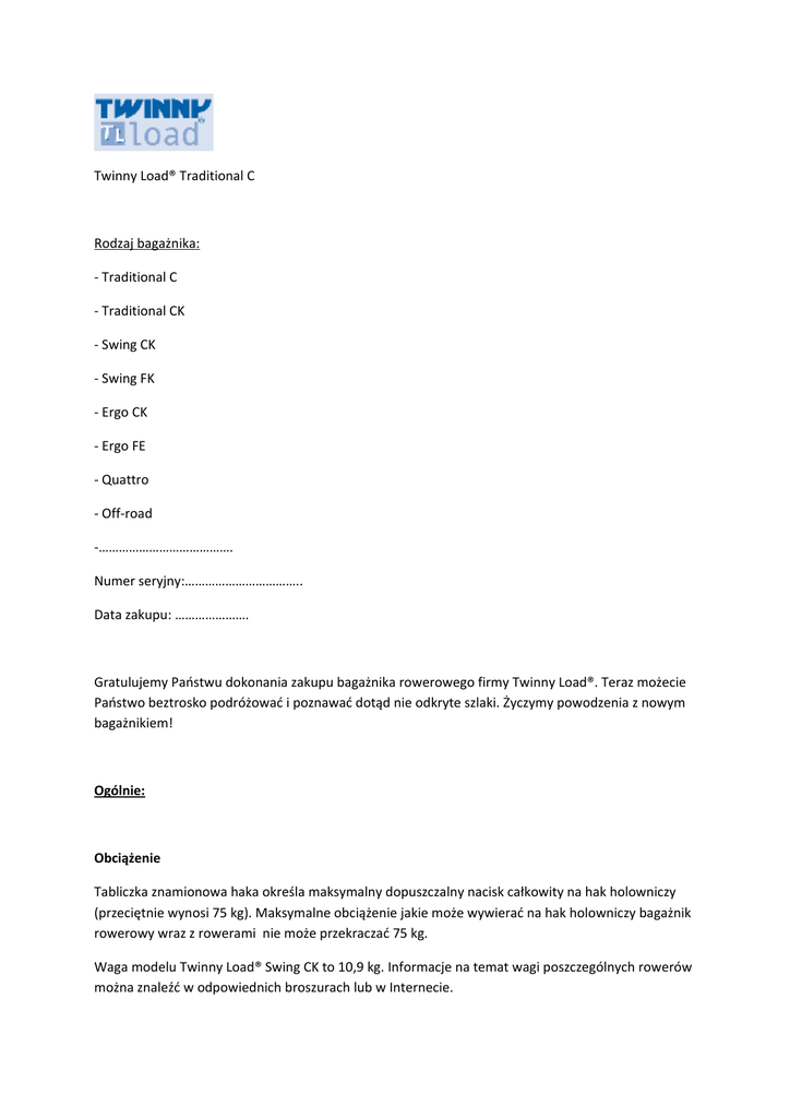 Twinny Load® Traditional C Rodzaj bagażnika: - Traditional C - Traditional CK - Swing CK - Swing FK - Ergo CK - Ergo FE - Quattro - Off-road -…………………………………. Numer seryjny:…………………………….. Data zakupu: …………………. Gratulujemy Państwu dokonania zakupu bagażnika rowerowego firmy Twinny Load®. Teraz możecie Państwo beztrosko podróżować i poznawać dotąd nie odkryte szlaki. Życzymy powodzenia z nowym bagażnikiem! Ogólnie: Obciążenie Tabliczka znamionowa haka określa maksymalny dopuszczalny nacisk całkowity na hak holowniczy (przeciętnie wynosi 75 kg). Maksymalne obciążenie jakie może wywierać na hak holowniczy bagażnik rowerowy wraz z rowerami nie może przekraczać 75 kg. Waga modelu Twinny Load® Swing CK to 10,9 kg. Informacje na temat wagi poszczególnych rowerów można znaleźć w odpowiednich broszurach lub w Internecie. Wymagania prawne Wszelkie informacje dotyczące wymagań, przepisów prawnych obowiązujących w Europie potrzebnych do transportu rowerów na bagażnikach rowerowych znajdują się na stronie www.twinnyload.pl. Oświetlenie Bagażnik posiada oświetlenie o mocy 12V. Jakość Wszystkie bagażniki są zaprojektowane i wykonane zgodnie ze standardami najwyższej jakości. Trwałość, łatwość dostosowania, łatwość w użyciu, dobre warunki podczas jazdy oraz solidność są dla nas najważniejszym wyznacznikiem. Konserwacja Zaleca się czyszczenie bagażnika po jego każdorazowym użytkowaniu oraz upewnienie się czy nie osadziła się na nim sól lub osad z paliwa. Przechowywanie Należy przechowywać w suchym miejscu. Akcesoria Dostępne jest również dodatkowe wyposażenie do bagażnika rowerowego. Dla uzyskania kompletnych informacji zapraszamy na stronę www.twinnyload.pl lub proszę pytać sprzedawców. Narzędzia Narzędzia potrzebne do montażu bagażnika rowerowego to: - klucz imbusowy 6 mm - dwa klucze płaskie/oczkowe 17 W skład zestawu Twinny Load,® Traditional CK wchodzą: - bagażnik - cztery uchwyty na koła - moduł naprowadzania - kłódka - adapter elektryczny 13/7 - klucz imbusowy 6 mm - karta gwarancyjna OSTRZEŻENIE - Składanie bagażnika rowerowego powinno przebiegać zgodnie z zaleceniami zawartymi w instrukcji. - Montaż bagażnika rowerowego na pojeździe powinien także przebiegać zgodnie z instrukcją. - W bagażniku rowerowym nie należy dokonywać zmian konstrukcyjnych. - Oświetlenie bagażnika jest przystosowane do elektrycznych instalacji samochodowych o napięciu 12V - Po przejechaniu kilku kilometrów należy sprawdzić poprawność zamocowania bagażnika jak i rowerów. - Dostosuj swoją prędkość przejeżdżając przez progi zwalniające. - Nigdy nie używaj pasków lub lin do mocowania rowerów na bagażniku. Mogą one uszkodzić ramę roweru. - W zasadzie na bagażniku Twinny Load można przewozić także (moto)rowery elektryczne jednak zależy to od marki i typu takiego roweru. Tabele modeli pasujących do przewozu przy użyciu bagażnika można znaleźć na naszej stronie internetowej w zakładce „Instrukcje obsługi”. - UWAGA! Jeśli lampa przeciwmgielna świeci się światłem ciągłym po podłączeniu wtyczki elektrycznej do samochodu oznacza to, że instalacja gniazda w samochodzie nie jest wykonana zgodnie z zalecaną normą DIN. Należy to naprawić we własnym zakresie. Przed jazdą należy sprawdzić: - czy bagażnik rowerowy jest dobrze osadzony na haku holowniczym - czy oświetlenie bagażnika rowerowego działa prawidłowo - czy oświetlenie bagażnika jest ustawione i zabezpieczone na prawidłowej szerokości. - należy sprawdzić czy nie pozostawiono luźnych kabli - czy wszystkie śruby motylkowe zostały przykręcone - należy sprawdzić czy wszystkie zaciski na ramieniu pedałów zostały dokładnie zaciśnięte - czy wszystkie koła zostały przymocowane opaskami - czy blokada mechanizmu przechyłowego jest zabezpieczona - czy na rowerach lub bagażniku nie pozostały nie przymocowane rzeczy - czy klucze z zamków zabezpieczających zostały wyjęte - czy lampa przeciwmgielna znajduje się po lewej stronie INSTALACJA TABLICY REJESTRACYJNEJ Wyłamać cztery plastikowe ograniczniki z miejsca wskazanego na obrazku i umieścić je w miejscu zabezpieczenia. OSTROŻNIE! Krótka tablica rejestracyjna powinna być wsunięta do pierwszego ogranicznika. Polskie tablice rejestracyjne mogą być także instalowane bez ograniczników. Wsuń tablicę rejestracyjną w szynę do drugiego ogranicznika. MOCOWANIE KÓŁ W RYNIENKACH Zainstaluj wszystkie cztery rynienki kół z zaciskami do wewnątrz. Wsuń rynienkę koła w stelaż bagażnika i solidnie przykręć. MONTAŻ MOCOWANIA MODUŁU NAPROWADZANIA I BAGAŻNIKA ROWEROWEGO Mocowanie zaczepu może być zainstalowane w dwóch różnych opcjach. Standardowa instalacja jest najczęściej stosowaną. Jeżeli jednak nie ma wystarczającej ilości miejsca do montażu całego zaczepu lub kula haka jest zbyt wysoko należy zamontować mocowanie zaczepu odwrotnie. Należy nałożyć uchwyt na hak holowniczy oraz skręcić śruby przy użyciu kluczy na tyle lekko żeby mocowanie mogło ślizgać się po haku. Zamontuj moduł naprowadzania bagażnika. Zwróć uwagę na wymiary podane na obrazku powyżej. Dociągnij solidnie wszystkie śruby. Umieść bagażnik na uchwycie i przykręć go śrubą motylkową. Zabezpiecz bagażnik rowerowy. INSTALACJA OŚWIETLENIA Jeśli lampy zamocowane były w pozycji do przechowywania, odczep je i wsuń w prowadnicę po bokach bagażnika. Umieść lampę na wysokości jej gniazda, naciśnij czerwony przycisk odblokowujący i wsuń lampę w zatrzask. Ustawianie szerokości świateł: naciśnij czerwony blokujący przycisk i wysuwaj lub wsuwaj lampy w ostępach co 1 cm do ustawienia żądanej szerokości świateł. Szerokość twojego samochodu jest opisana w instrukcji obsługi twojego pojazdu. Szerokość samochodu Wysunięcie Do 1,80 m nie wysuwać Do 1,84 2 za