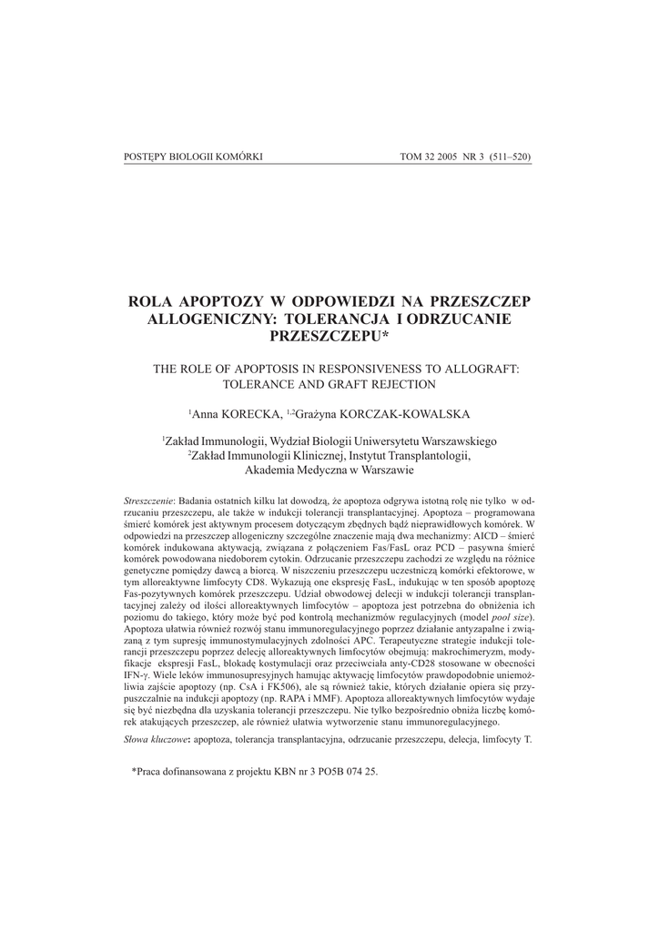 ROLA APOPTOZY W ODPOWIEDZI NA PRZESZCZEP POSTÊPY BIOLOGII KOMÓRKI 511 TOM 32 2005 NR 3 (511520) ROLA APOPTOZY W ODPOWIEDZI NA PRZESZCZEP ALLOGENICZNY: TOLERANCJA I ODRZUCANIE PRZESZCZEPU* THE ROLE OF APOPTOSIS IN RESPONSIVENESS TO ALLOGRAFT: TOLERANCE AND GRAFT REJECTION 1 1 Anna KORECKA, 1,2Gra¿yna KORCZAK-KOWALSKA Zak³ad Immunologii, Wydzia³ Biologii Uniwersytetu Warszawskiego 2 Zak³ad Immunologii Klinicznej, Instytut Transplantologii, Akademia Medyczna w Warszawie Streszczenie: Badania ostatnich kilku lat dowodz¹, ¿e apoptoza odgrywa istotn¹ rolê nie tylko w odrzucaniu przeszczepu, ale tak¿e w indukcji tolerancji transplantacyjnej. Apoptoza programowana mieræ komórek jest aktywnym procesem dotycz¹cym zbêdnych b¹d nieprawid³owych komórek. W odpowiedzi na przeszczep allogeniczny szczególne znaczenie maj¹ dwa mechanizmy: AICD mieræ komórek indukowana aktywacj¹, zwi¹zana z po³¹czeniem Fas/FasL oraz PCD pasywna mieræ komórek powodowana niedoborem cytokin. Odrzucanie przeszczepu zachodzi ze wzglêdu na ró¿nice genetyczne pomiêdzy dawc¹ a biorc¹. W niszczeniu przeszczepu uczestnicz¹ komórki efektorowe, w tym alloreaktywne limfocyty CD8. Wykazuj¹ one ekspresjê FasL, indukuj¹c w ten sposób apoptozê Fas-pozytywnych komórek przeszczepu. Udzia³ obwodowej delecji w indukcji tolerancji transplantacyjnej zale¿y od iloci alloreaktywnych limfocytów apoptoza jest potrzebna do obni¿enia ich poziomu do takiego, który mo¿e byæ pod kontrol¹ mechanizmów regulacyjnych (model pool size). Apoptoza u³atwia równie¿ rozwój stanu immunoregulacyjnego poprzez dzia³anie antyzapalne i zwi¹zan¹ z tym supresjê immunostymulacyjnych zdolnoci APC. Terapeutyczne strategie indukcji tolerancji przeszczepu poprzez delecjê alloreaktywnych limfocytów obejmuj¹: makrochimeryzm, modyfikacje ekspresji FasL, blokadê kostymulacji oraz przeciwcia³a anty-CD28 stosowane w obecnoci IFN-γ. Wiele leków immunosupresyjnych hamuj¹c aktywacjê limfocytów prawdopodobnie uniemo¿liwia zajcie apoptozy (np. CsA i FK506), ale s¹ równie¿ takie, których dzia³anie opiera siê przypuszczalnie na indukcji apoptozy (np. RAPA i MMF). Apoptoza alloreaktywnych limfocytów wydaje siê byæ niezbêdna dla uzyskania tolerancji przeszczepu. Nie tylko bezporednio obni¿a liczbê komórek atakuj¹cych przeszczep, ale równie¿ u³atwia wytworzenie stanu immunoregulacyjnego. S³owa kluczowe: apoptoza, tolerancja transplantacyjna, odrzucanie przeszczepu, delecja, limfocyty T. *Praca dofinansowana z projektu KBN nr 3 PO5B 074 25. 512 A. KORECKA, G. KORCZAK-KOWALSKA Summary: Studies of a few last years give evidence for a role of apoptosis not only in graft rejection but also in induction of transplantation tolerance. Apoptosis programmed cell death is an active process which refers to superflous and defective cells. For a responsiveness to allograft the most important are two mechanisms of apoptosis: AICD (activation induced cell death) which involves Fas/FasL engagement and PCD (passive cell death) caused by cytokine withdrawal. Graft rejection is caused by genetic differences between a donor and a recipient. Allograft is damaged by effector cells including alloreactive lymphocytes T CD8+. These cells express FasL and could thereby induce apoptosis in Fas-positive graft cells. Participation of peripheral apoptosis in induction of transplantation tolerance depends on pool size of alloreactive lymphocytes apoptosis is necessary to reduce the size of alloreactive T cells clone to be small enough to be controlled by immunoregulatory mechanism (pool size model). Apoptosis facilitates also the development of immunoregulation by antiinflamatory action and thereby suppression of immunostimulatory abilities of APC. Therapeutic strategies of the induction of transplantation tolerance by alloreactive lymphocyte deletion include macrochimerism, modification of FasL expression, costimulatory blockade, and anti-CD28 antibodies in the presence of IFN-γ. Most of immunosuppressive drugs like CsA and FK506 possibly inhibit apoptosis by inhibition of T cell activation. It is quite likely that there are also regiments that induction of apoptosis contributes to their immunosuppressive activity, e.g. RAPA and MMF. Apoptosis of alloreactive lymphocyte T seems to be necessary to achieve transplantation tolerance. Not only does it reduce directly the quantity of cells attacking graft but it also facilitates the development of immunoregulation state. Keywords: apoptosis, transplantation tolerance, graft rejection, deletion, T lymphocytes. Wykaz stosowanych skrótów: AICD mieræ komórek indukowana aktywacj¹; APC komórka prezentuj¹ca antygen; CsA cyklosporyna; DC komórka dendrytyczna; FK506 takrolimus; IFN interferon; IL interleukina; MHC g³ówny uk³ad zgodnoci tkankowej; MMF mykofenolan mofetilu; PCD pasywna mieræ komórek; RAPA rapamycyna; TCR receptor limfocytu T; TGF transformuj¹cy czynnik wzrostu; Th limfocyt T pomocniczy; TNF czynnik martwicy nowotworu. WPROWADZENIE Apoptoza programowana mieræ komórek, odgrywa zasadnicz¹ rolê w rozwoju limfocytów, odpowiedzi przeciw antygenom i zachowaniu homeostazy immunologicznej. Udzia³ apoptozy w odrzucaniu przeszczepu nie wzbudza w¹tpliwoci. Natomiast rola w tolerancji przeszczepu to zagadnienie, którym badacze zajmuj¹ siê dopiero od kilku lat. Do niedawna uwa¿ano, ¿e za uzyskanie tolerancji odpowiedzialne s¹ g³ównie mechanizmy immunoregulacyjne. Obecnie coraz wiêksze znaczenie przypisuje siê apoptozie limfocytów T, szczególnie w fazie indukcji tolerancji. Apoptoza jest aktywnym, zale¿nym od sygna³ów procesem dotycz¹cym nadmiernych liczebnie, bezu¿ytecznych i nieprawid³owych komórek. W odpowiedzi na przeszczep allogeniczny szczególne znaczenie maj¹ dwa typy apoptozy: mieræ komórek indukowana aktywacj¹ (AICD activation induced cell death) i mieræ przez zaniedbanie, tzw. pasywna mieræ komórek (PCD passive cell death). AICD wyzwalana jes